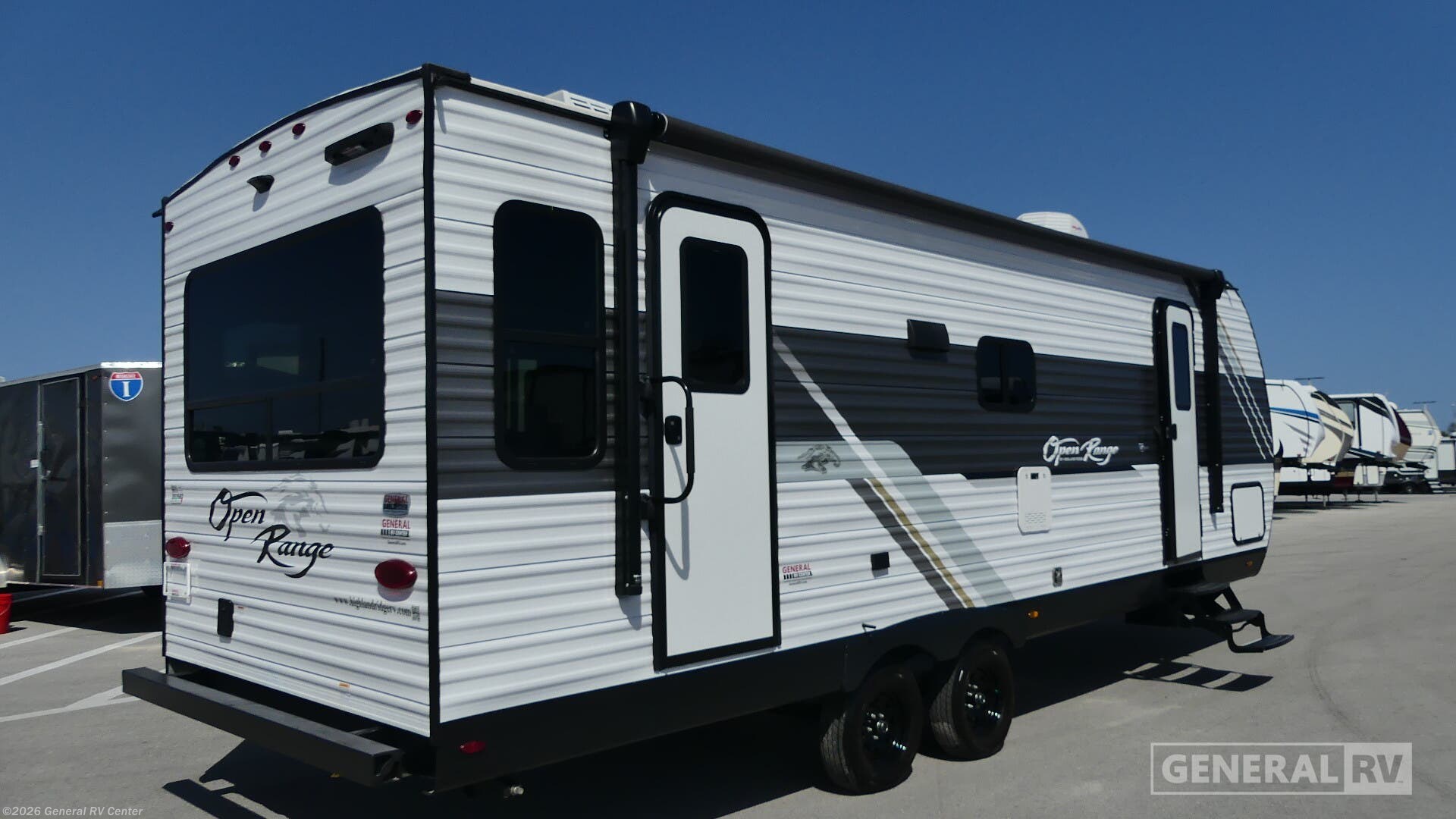 Highland Ridge Open Range Conventional travel trailer 26RLS highlights: Rear Living Area Dual Entry Doors Outside Storage Dual Axle Eat, sleep, play, and relax in this travel trailer perfect for six! You will love to visit with friends on the tri-fold sofa and U-shaped dinette in the rear living area, and there is an entertainment center here. Freshen up in the spacious walk-through bath that includes a large shower and tons of counter space, and the front master bedroom will feel just like home. Here, you'll find a walk-around bed, dual wardrobes, and your own exterior entry door! The affordable Open Range Conventional travel trailers by Highland Ridge are ready to meet your camping needs! You will appreciate the durable Magnum Roof system, plus each model is constructed with black front diamond plate protection, 5/8" main floor decking, and self-adjusting electric brakes with E-Z Lube axles for smooth towing. The 81" interior height means you won't feel cramped when relaxing with friends and family, and the residential vinyl flooring throughout is easy to clean, which will be perfect if you're camping with little ones or pets. These models also include a ceiling mount Bluetooth speaker, a digital TV antenna, plus a 13,500 BTU roof mounted A/C to keep you cool on those hot summer months.
