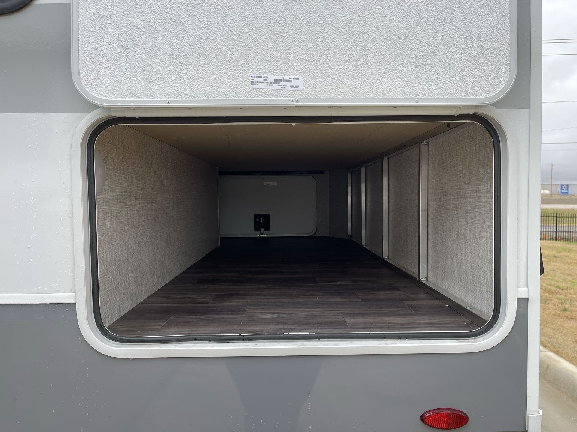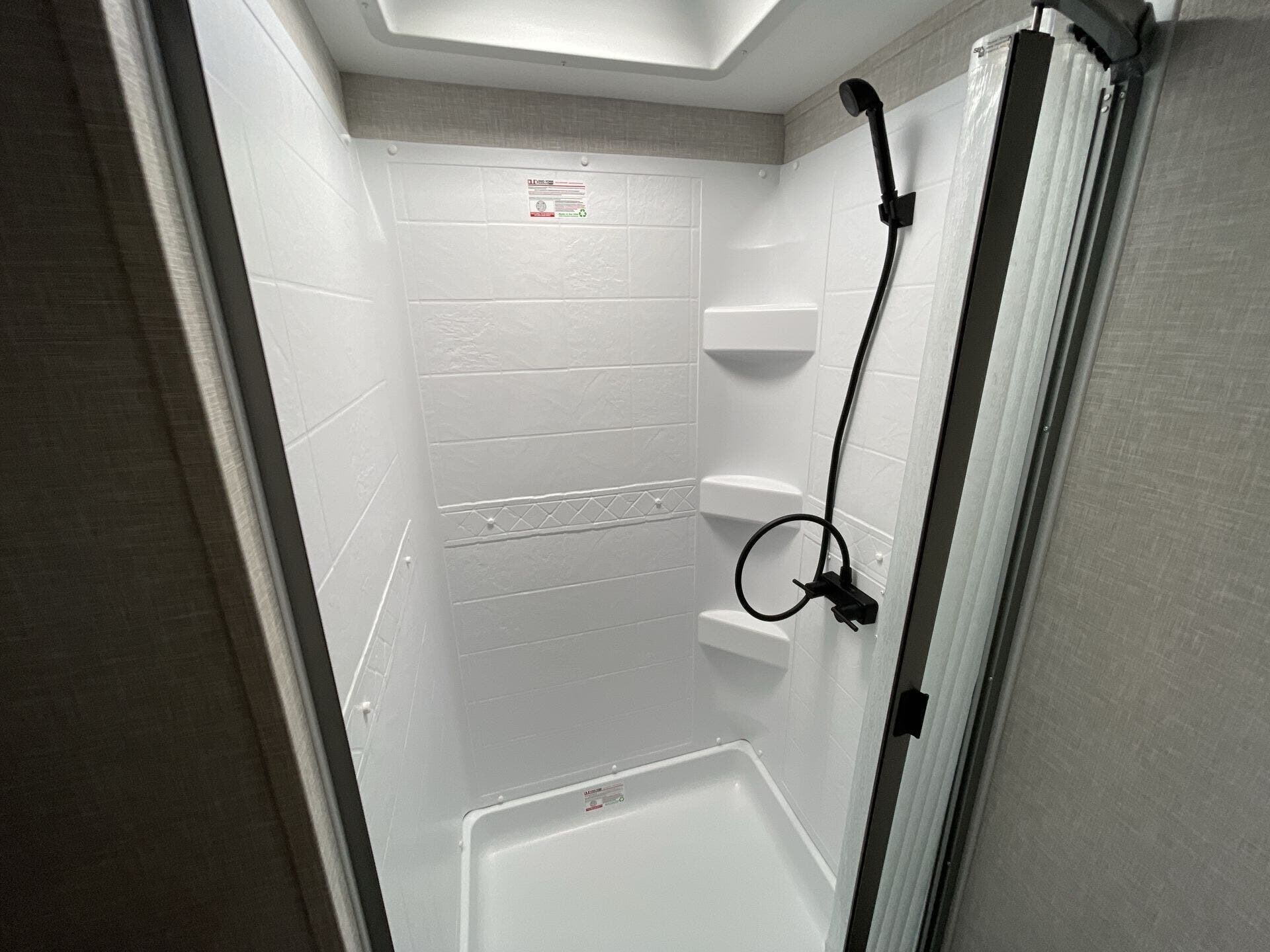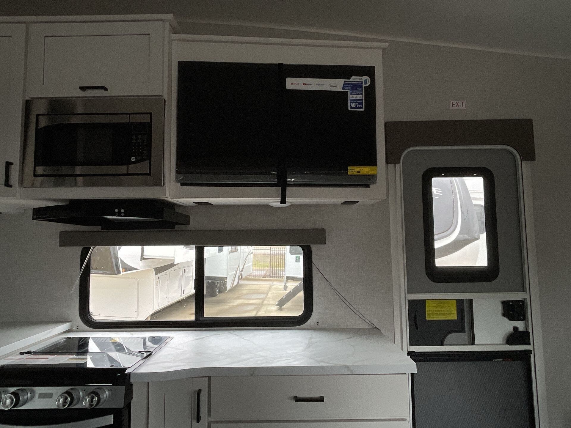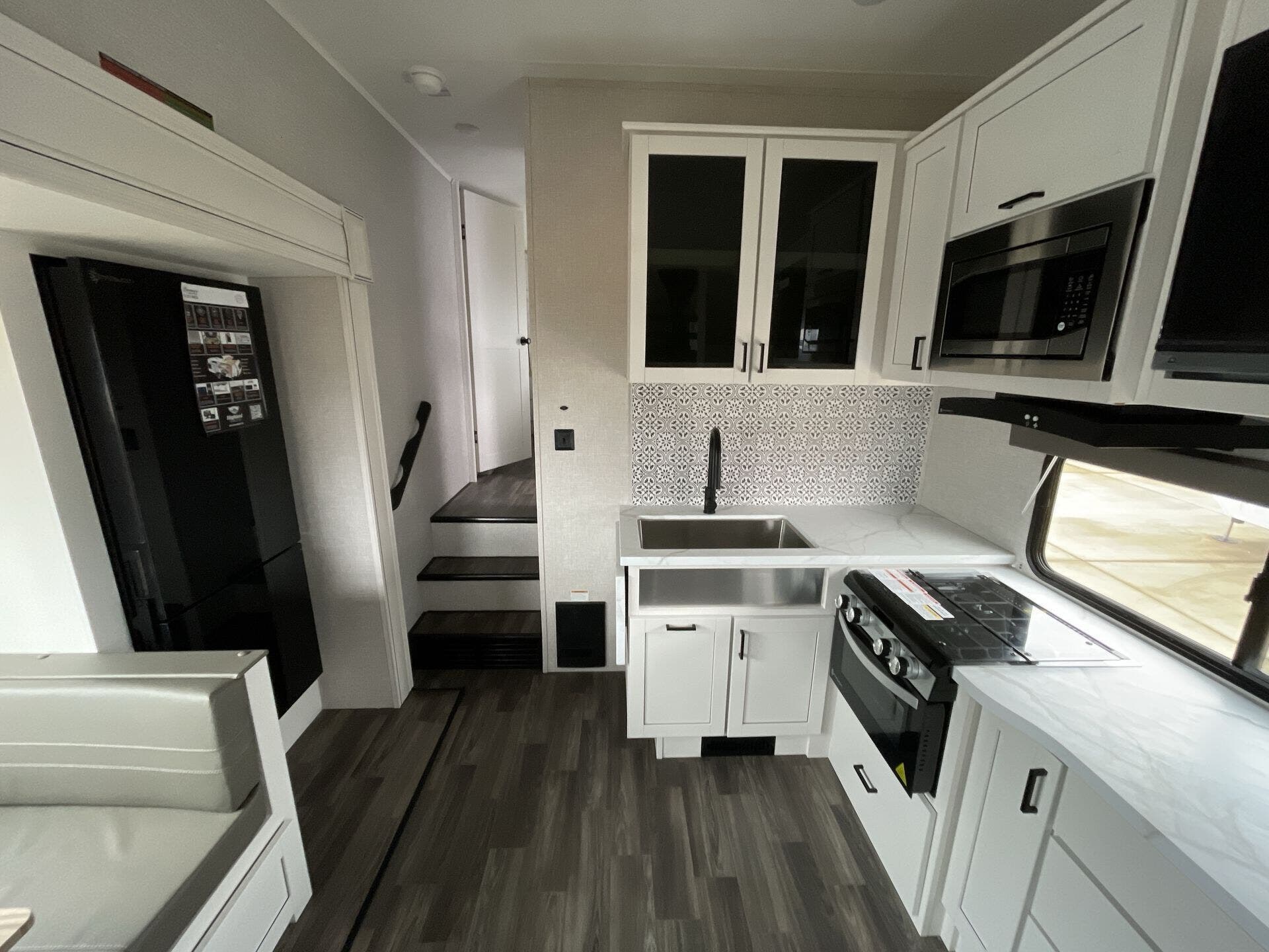 The kitchen is fully equipped with modern appliances, including a three-burner stove, microwave, oven, refrigerator, and a large pantry for storage. The spacious bathroom offers a full-size shower, sink, and toilet, ensuring comfort on the road. Outside, the Roamer 274BHS comes with a power awning, outdoor kitchen, and large storage compartments, making it easy to enjoy meals and activities outdoors. Built with Highland Ridge’s durable construction and insulation, this travel trailer is designed for all-season use, providing a reliable and comfortable experience no matter the destination.