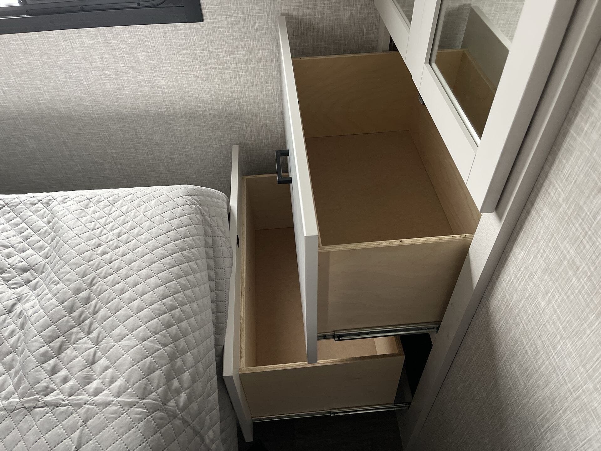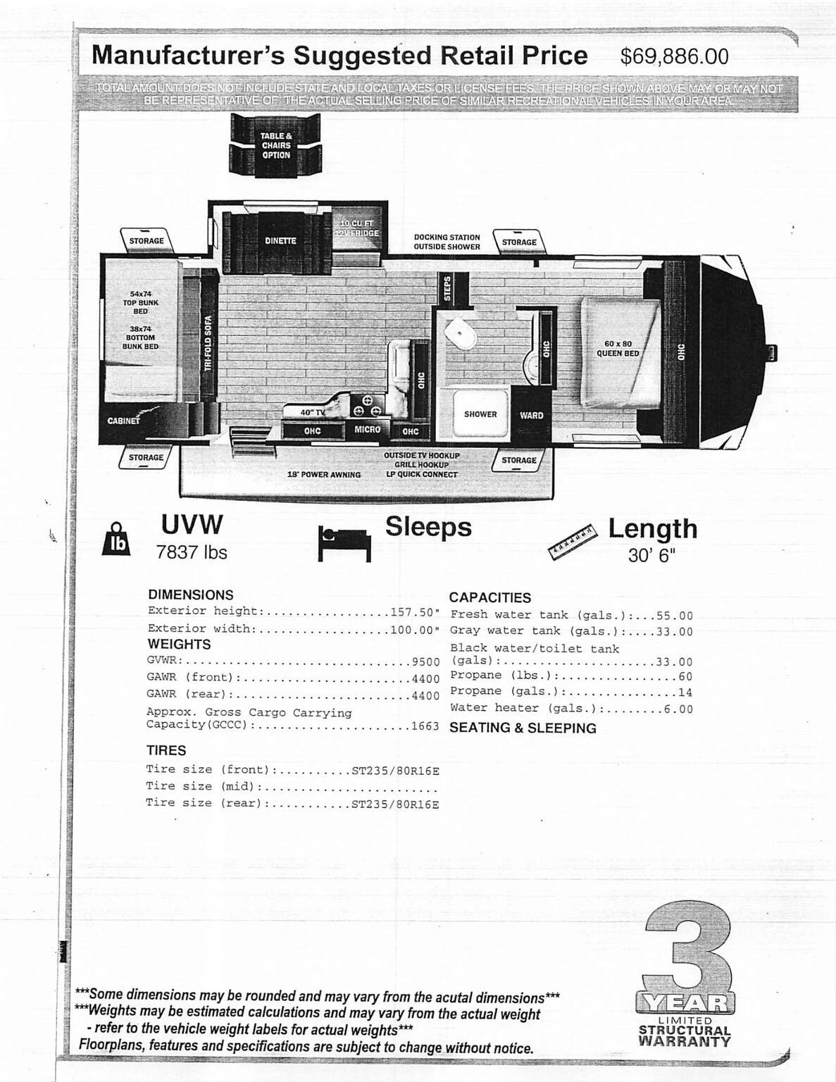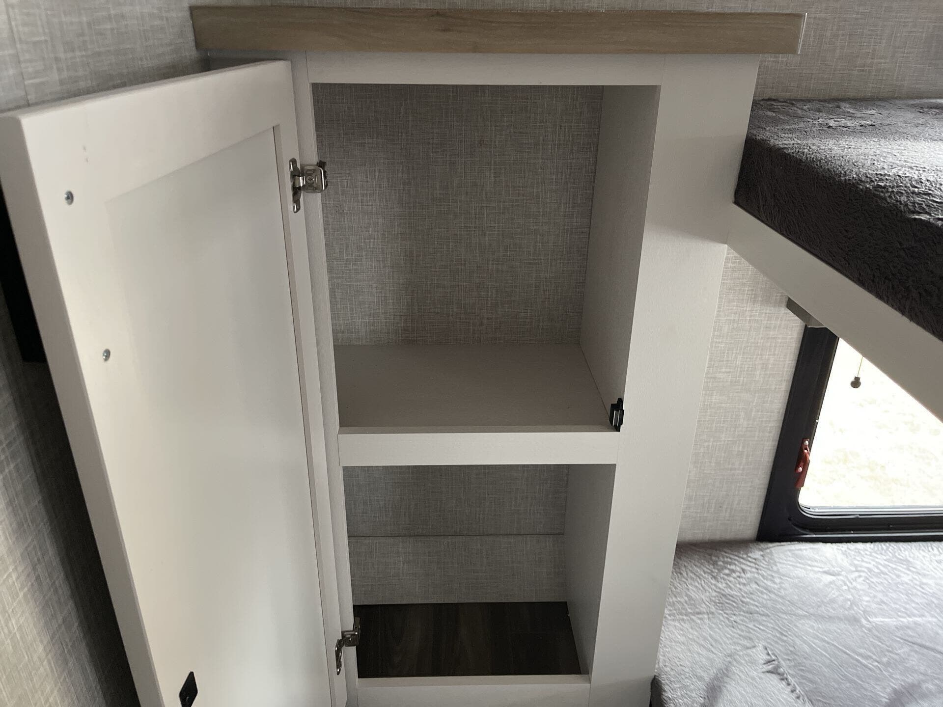Bunk Beds, Day/Night Shades, Dinette, Kitchen Sink, Medicine Cabinet, Overhead Cabinetry, Shower, Toilet, Wardrobe(s)
