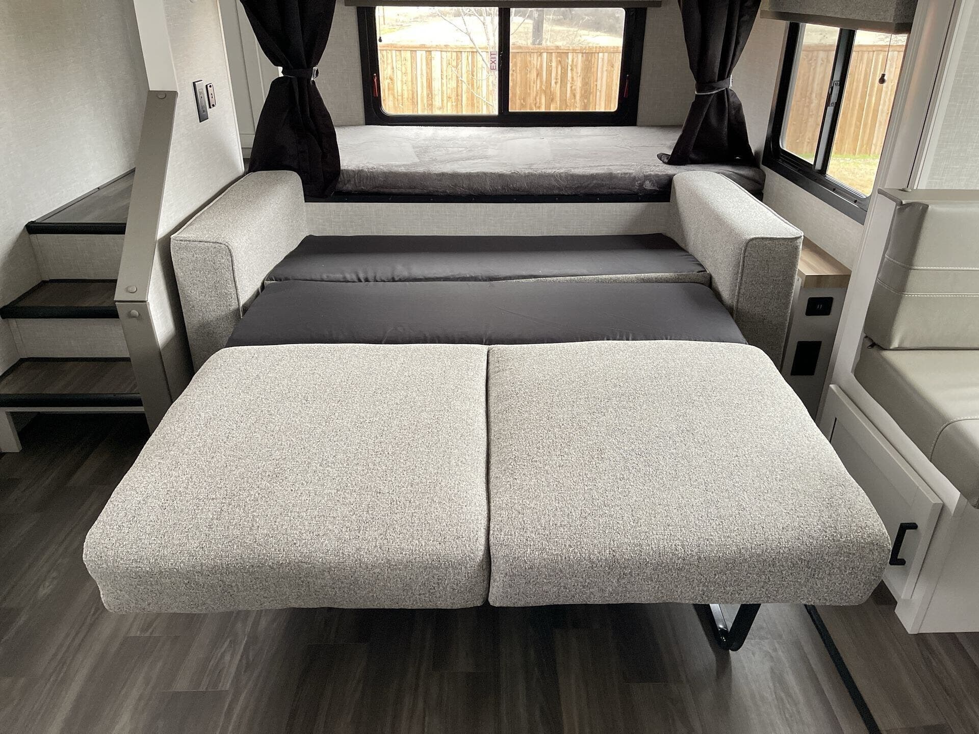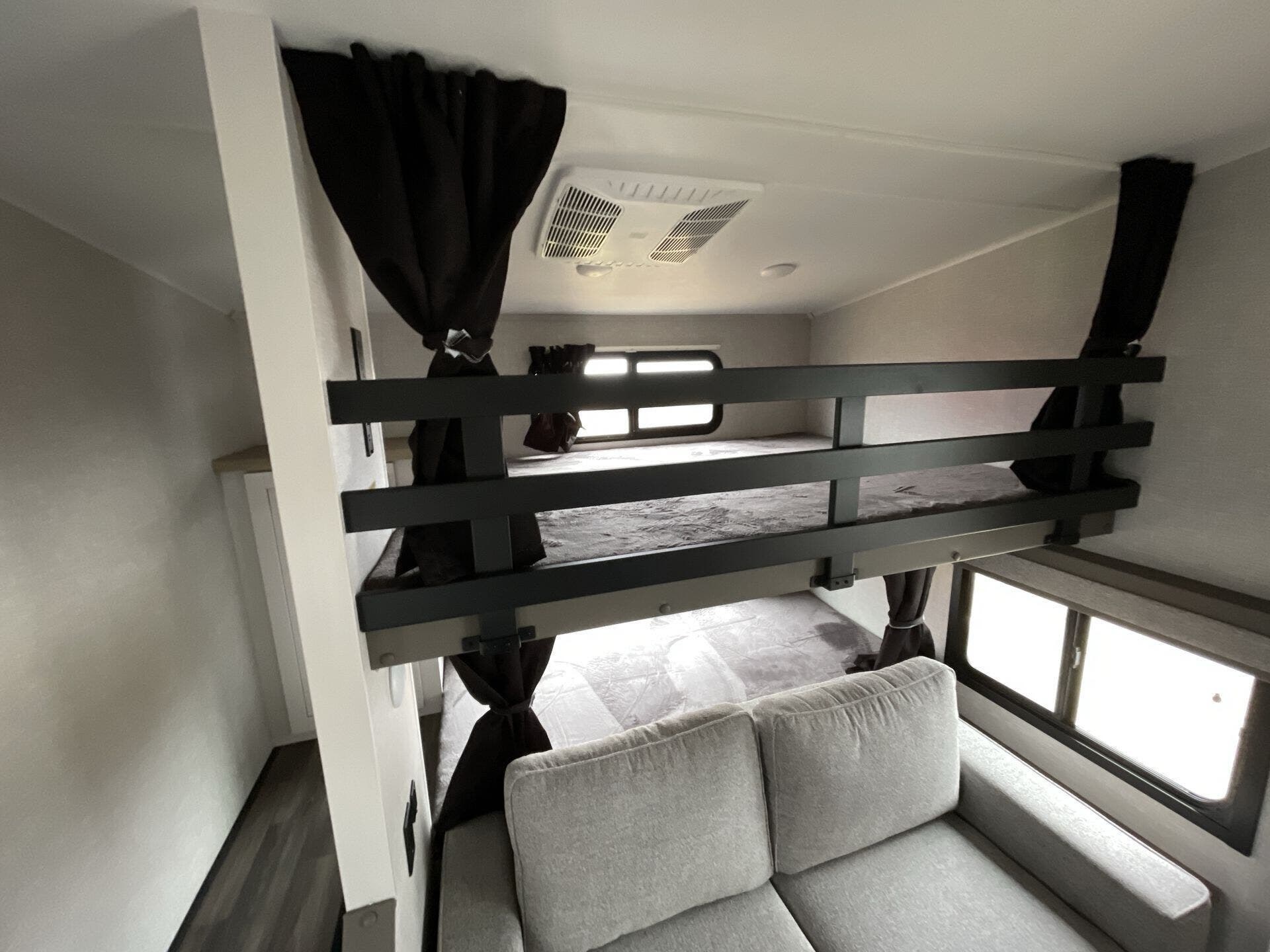 Inside, the 274BHS features a front private bedroom with a queen-sized bed and storage options, offering a comfortable retreat for parents. At the rear, double over double bunk beds provide a cozy sleeping area for kids or guests. The living area includes a slide-out that expands the space, featuring a U-shaped dinette and a tri-fold sofa, both of which can convert into additional sleeping spaces if needed.