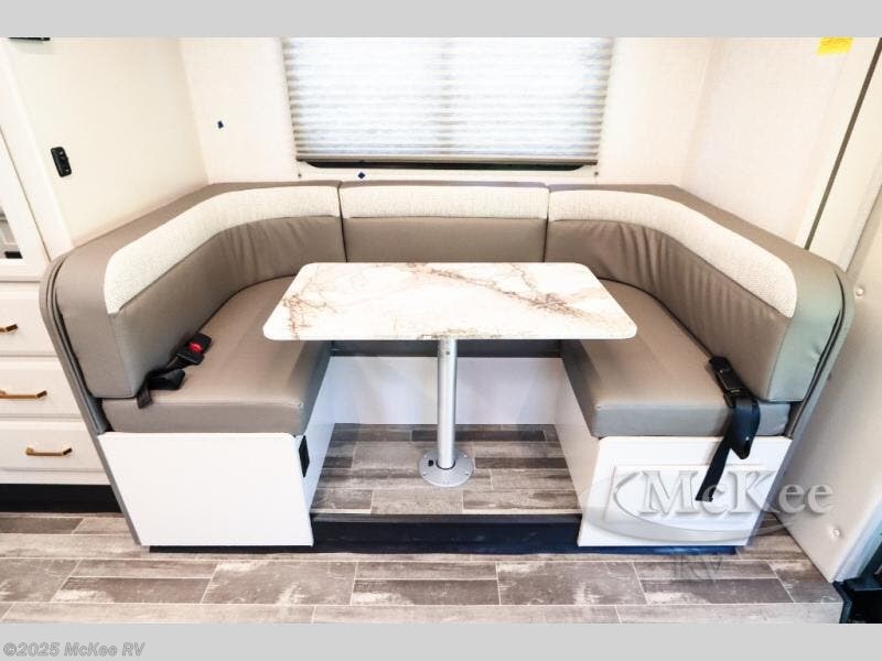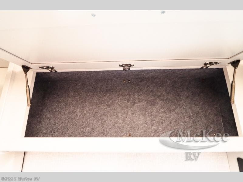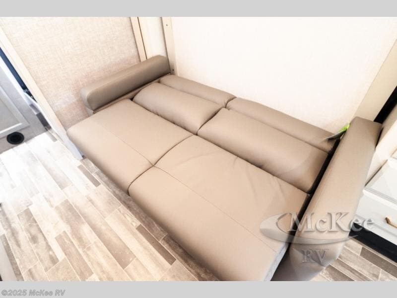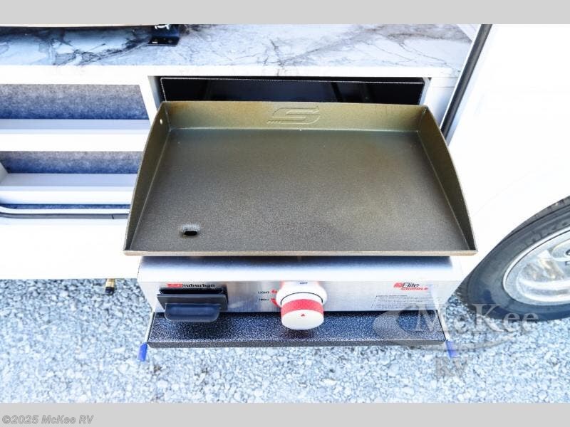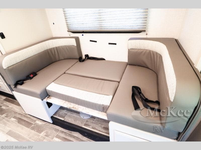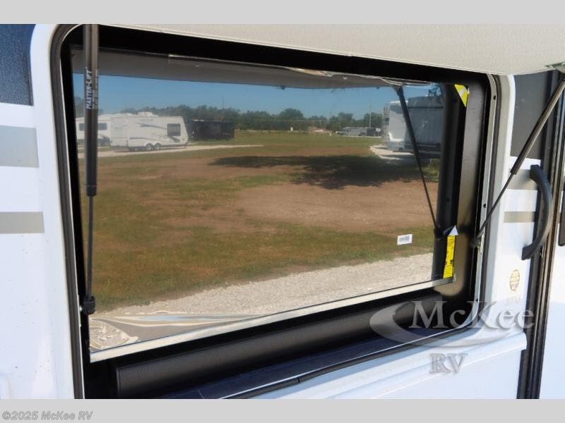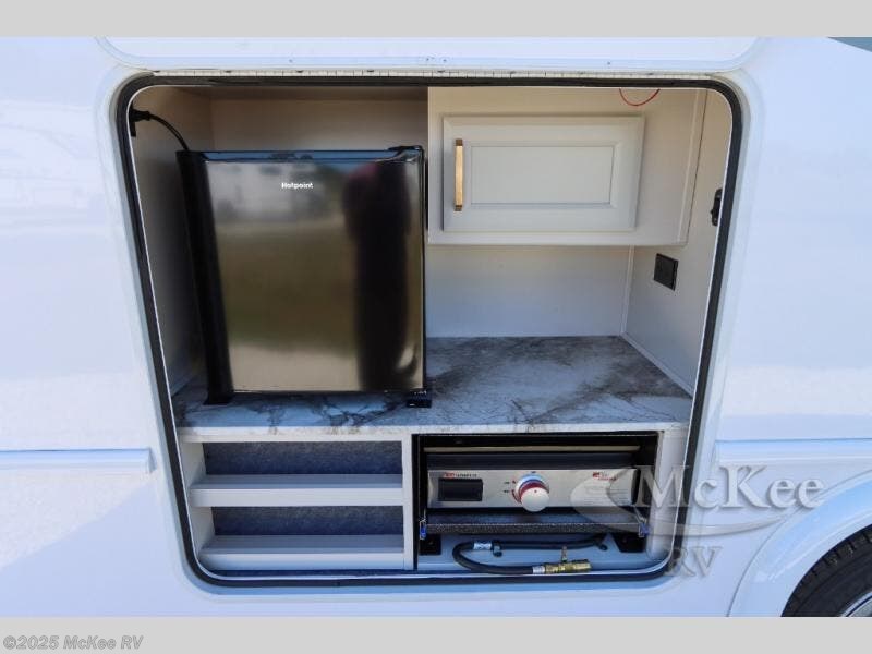 Pack your bags and head off on new adventures in this spacious coach! You will love gathering around the U-shaped dinette for a game or a meal, and the full-wall slide provides ample space to move around. An overhead bunk provides sleeping space for little ones or to be used as extra storage space. Since there is a queen Murphy bed, you will enjoy versatile seating and sleeping space, and the full rear bath will allow you to freshen up each day without having to use the camp's facilities. This model also includes a three burner range/convection microwave combo to cook meals on plus an exterior kitchen with a mini fridge, pull-out griddle, and storage when the weather is nice!