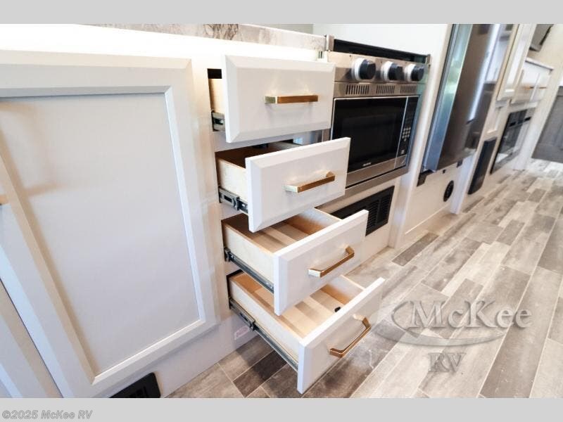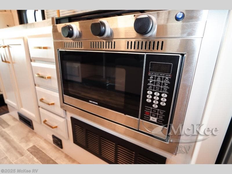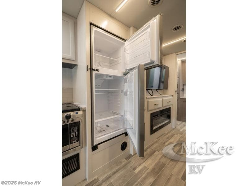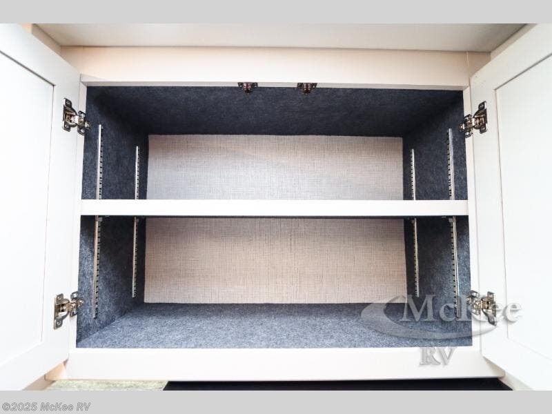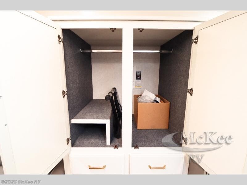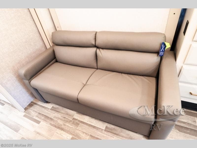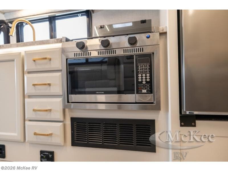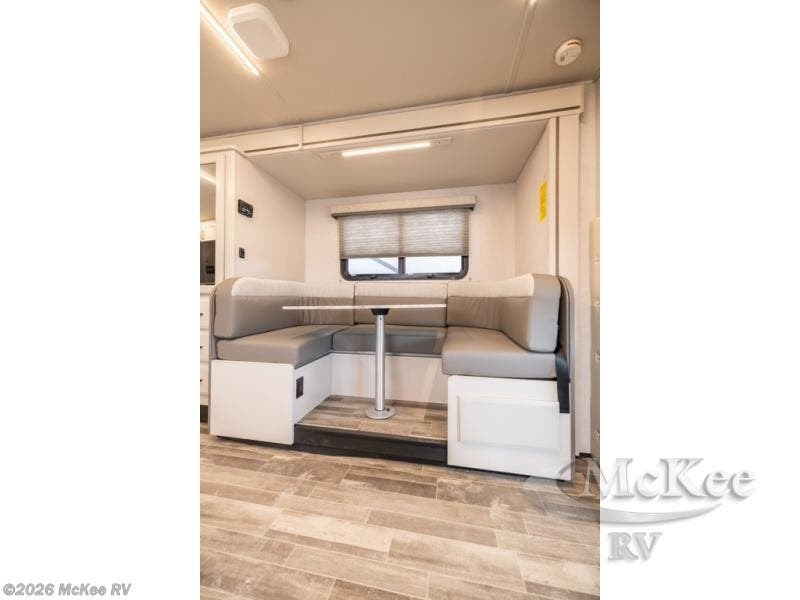 Pack your bags and head off on new adventures in this spacious coach! You will love gathering around the U-shaped dinette for a game or a meal, and the full-wall slide provides ample space to move around. An overhead bunk provides sleeping space for little ones or to be used as extra storage space. Since there is a queen Murphy bed, you will enjoy versatile seating and sleeping space, and the full rear bath will allow you to freshen up each day without having to use the camp's facilities. This model also includes a three burner range/convection microwave combo to cook meals on plus an exterior kitchen with a mini fridge, pull-out griddle, and storage when the weather is nice!