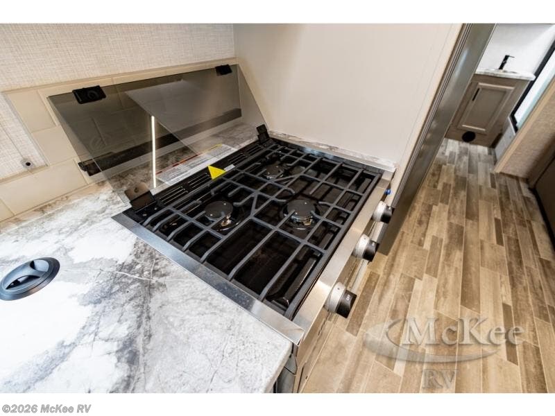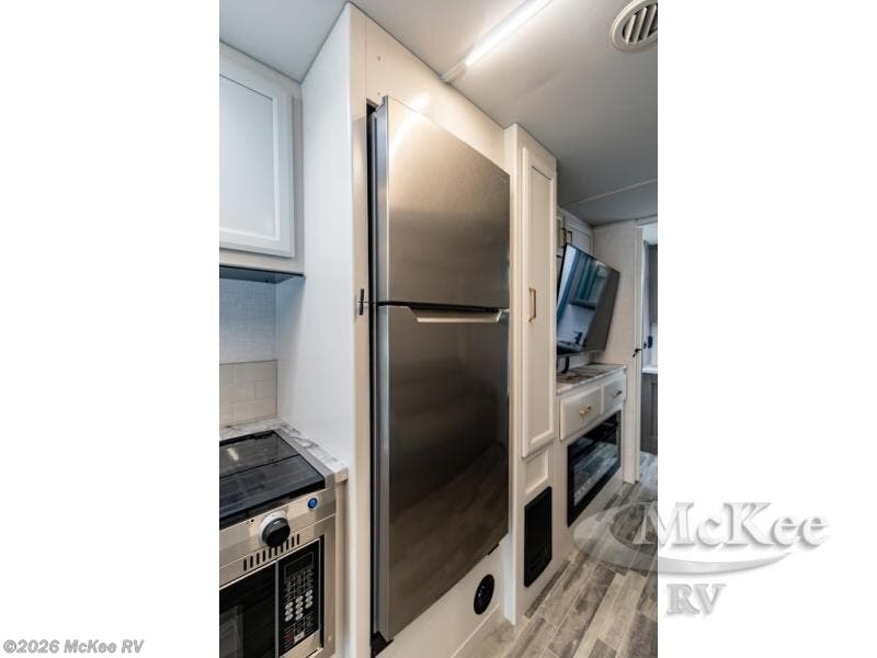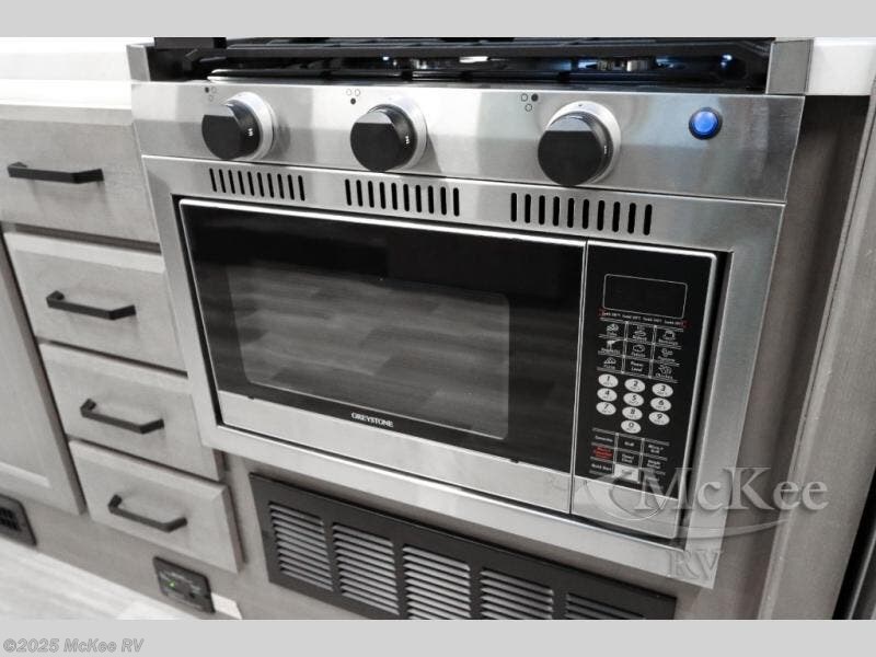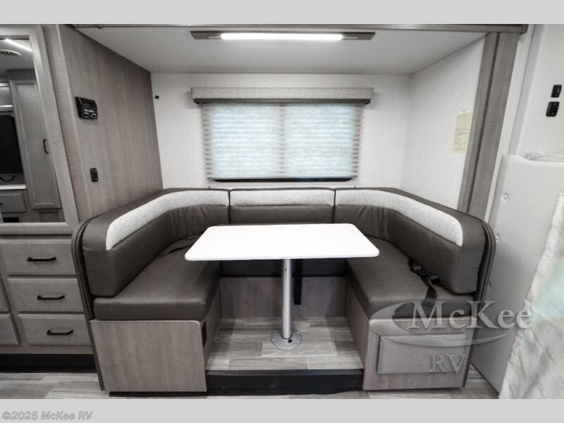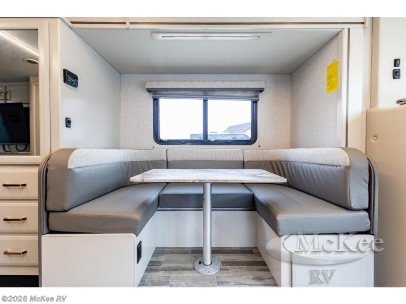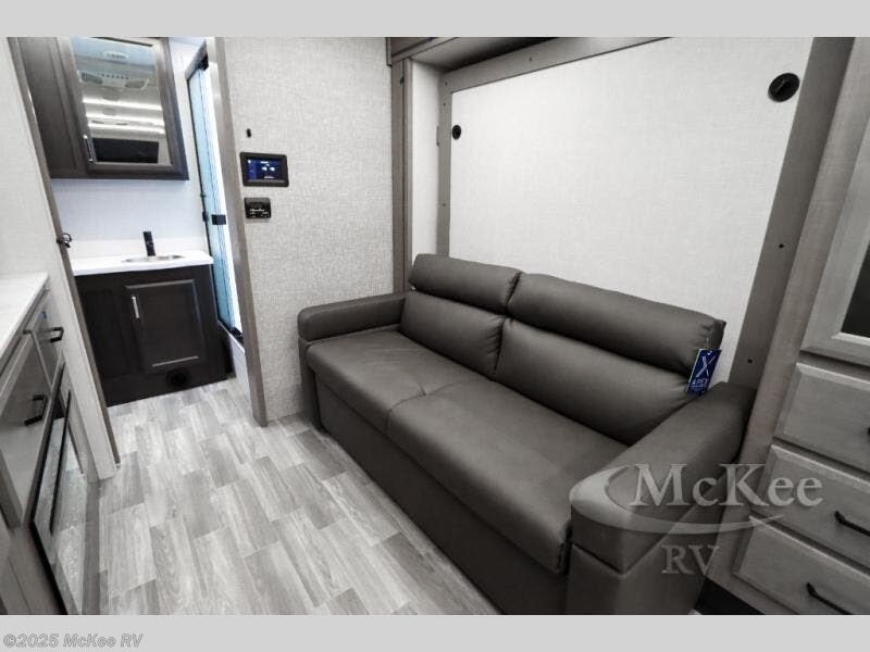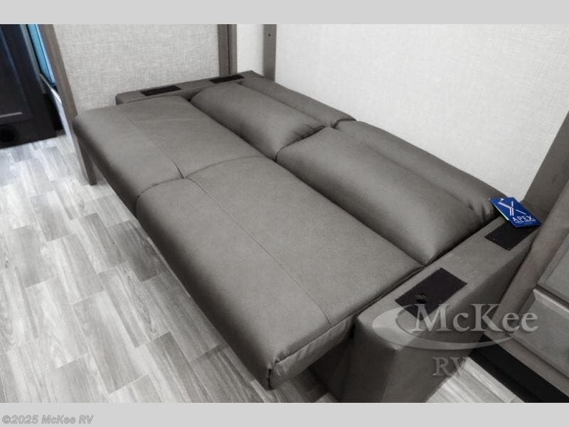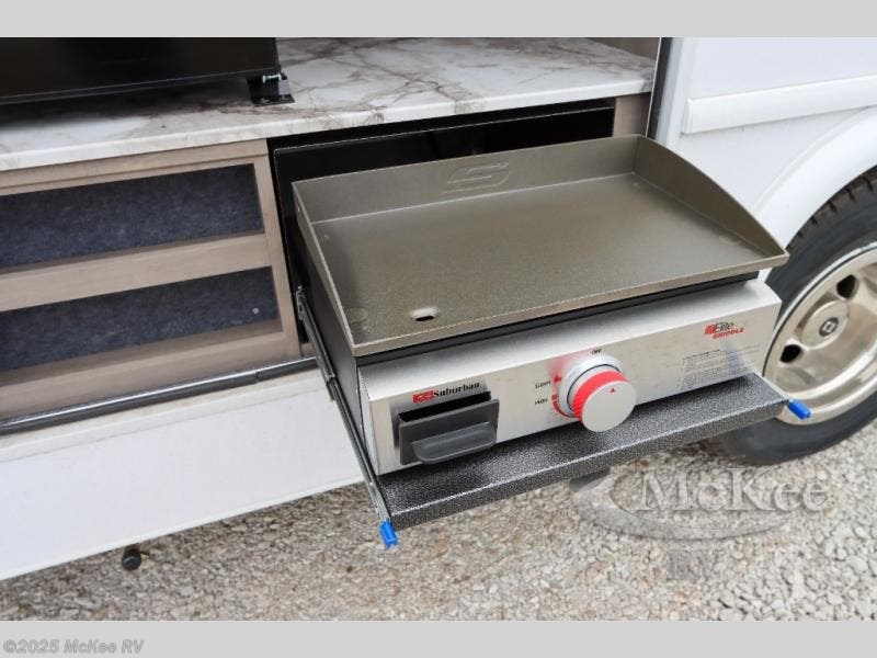 Pack your bags and head off on new adventures in this spacious coach! You will love gathering around the U-shaped dinette for a game or a meal, and the full-wall slide provides ample space to move around. An overhead bunk provides sleeping space for little ones or to be used as extra storage space. Since there is a queen Murphy bed, you will enjoy versatile seating and sleeping space, and the full rear bath will allow you to freshen up each day without having to use the camp's facilities. This model also includes a three burner range/convection microwave combo to cook meals on plus an exterior kitchen with a mini fridge, pull-out griddle, and storage when the weather is nice!