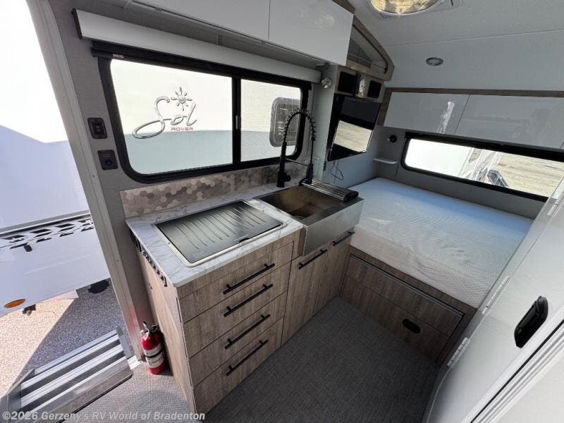 With any Sol travel trailer by inTech RV you will find strong, durable construction consisting of lightweight aluminum that is easier to tow and resists rust, water, and dents. The Tilt-Forward Design creates more space inside so you can stretch out, and the panoramic windshield gives a great view of the mountains, ocean, or forest! The elegant interior features tinted windows with shades, Infinity woven flooring, and a stainless steel cooktop and microwave. You will stay comfortable year around since these models include a 15K BTU A/C and a 16K BTU furnace. The optional Rover Package can also be added that features rugged decals, off-road tires with a 3" lift, two different color choices to choose from, plus more!