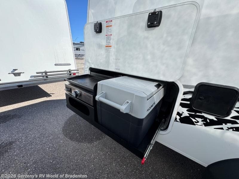 You will love the added space in this travel trailer that can sleep four people each night. There is a queen-size bed in the back, plus a convertible U-shaped dinette up front for the kids or your camping friends. The kitchen includes a two burner stainless steel cooktop, a stainless steel microwave, and a 4.5 12V compressor refrigerator for your perishables. You can also add the optional 10' power awning outside for shade as you visit with loved ones! This model has a dry weight that ranges from 3,230-3,372 lbs., a tongue weight between 465-495 lbs., and a carrying capacity between 525-610 lbs.