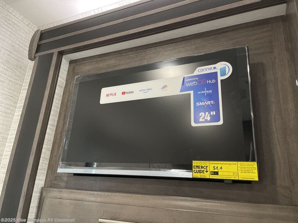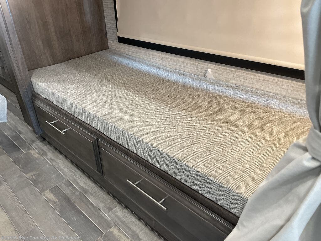 Lots of entertainment, plenty of sleeping space and full kitchen amenities make traveling in this coach super convenient! There is plenty of space to spread out thanks to the full-wall slide, and the double door bathroom gives you access either from the rear bedroom or the main area near the bunk beds. You can sleep like a queen while the kids or your guests sleep on the bunk beds and watch their own tablet, and/or the drop down overhead bunk if you added that option. Some might even sleep on the jack-knife sofa and Jayco-exclusive, easy-operation legless dinette table once set up for bedtime. There is a 39" LED HD Smart TV on a lift to watch inside, and an exterior entertainment center with LED HD Smart TV to watch while relaxing under the 23' electric awning.