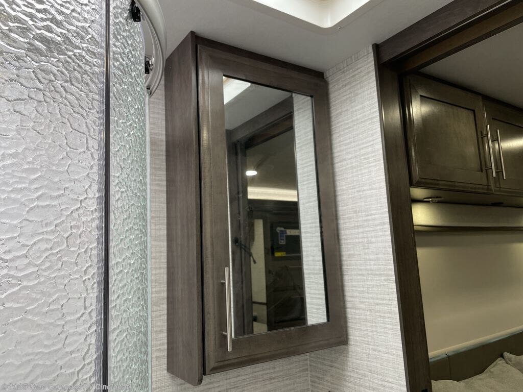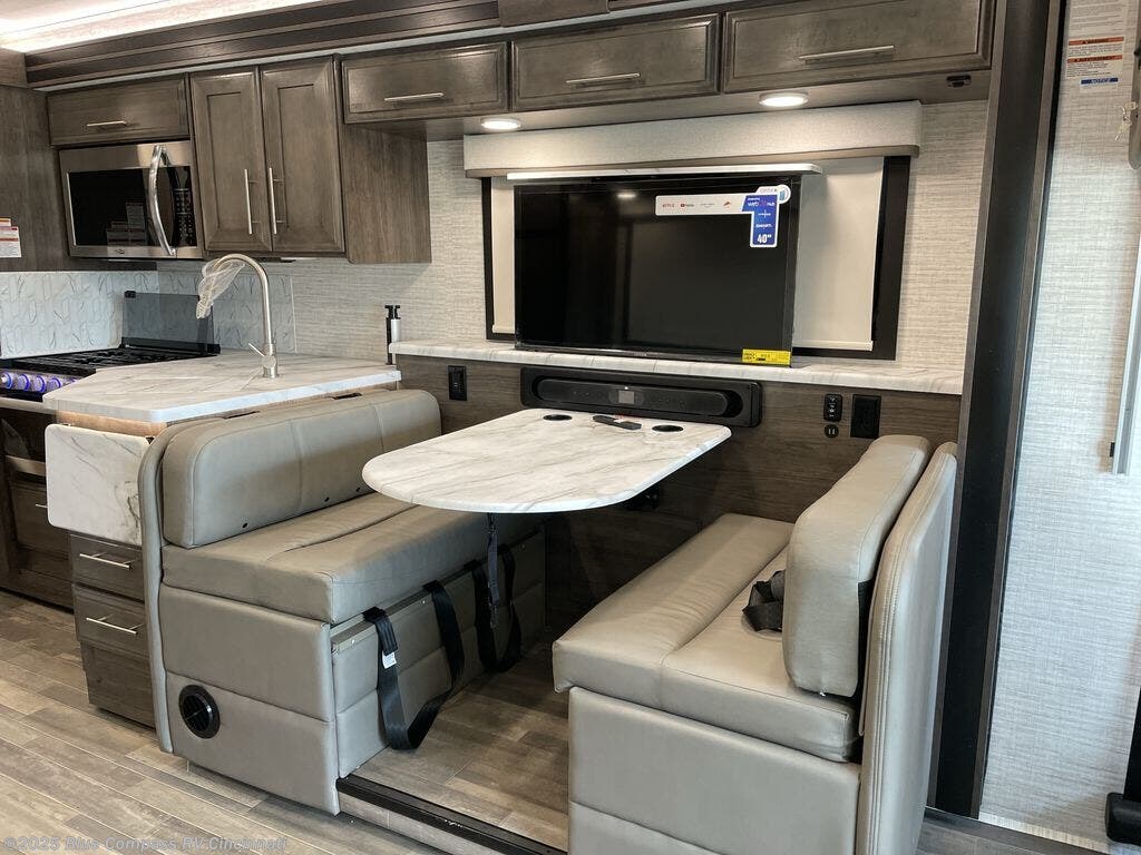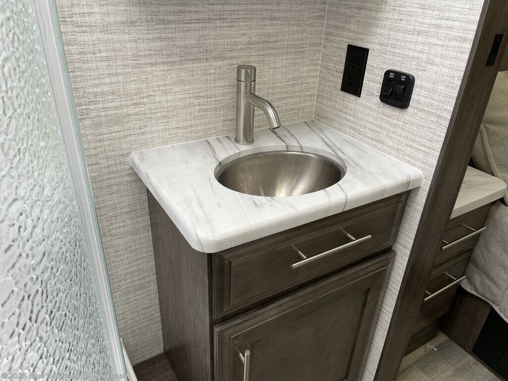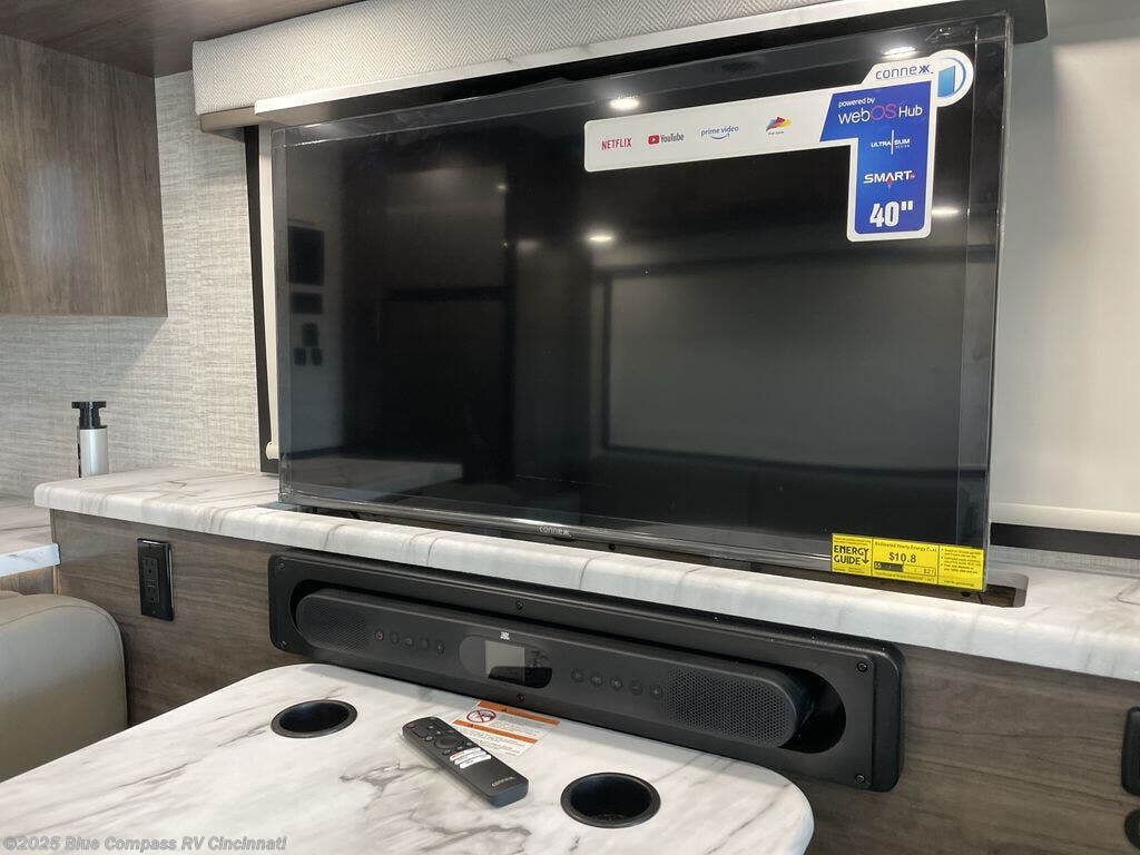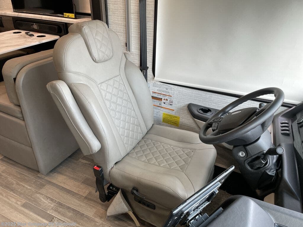 With any Alante Class A gas motorhome by Jayco, the mandatory Customer Value package provides JRide technology with a computer-balanced driveshaft ensuring smooth and efficient power transfer to the wheels, and SACHS shock absorbers offering independent adjustments to the road conditions. There is also a one-piece, seamless, crowned fiberglass roof, and an exterior entertainment center to watch shows and movies. The automatic hydraulic leveling jacks, 120 in. panoramic windshield, 200W solar panel, and the electric-powered entrance step will make traveling that much easier. And the interior equipment includes a Sony infotainment center with Apple CarPlay and Android Auto, a backup and side-view cameras for easy parking, plus a 6-way power driver seat for comfortable and safe driving. You will also love the power front privacy shade with manual side privacy shades, LED-lit hardwood fascia and countertops, a pop-up charging station in the kitchen and a USB port and wireless charging in the nightstands.