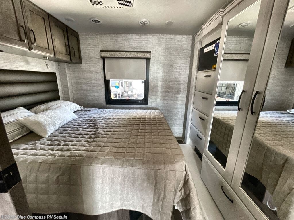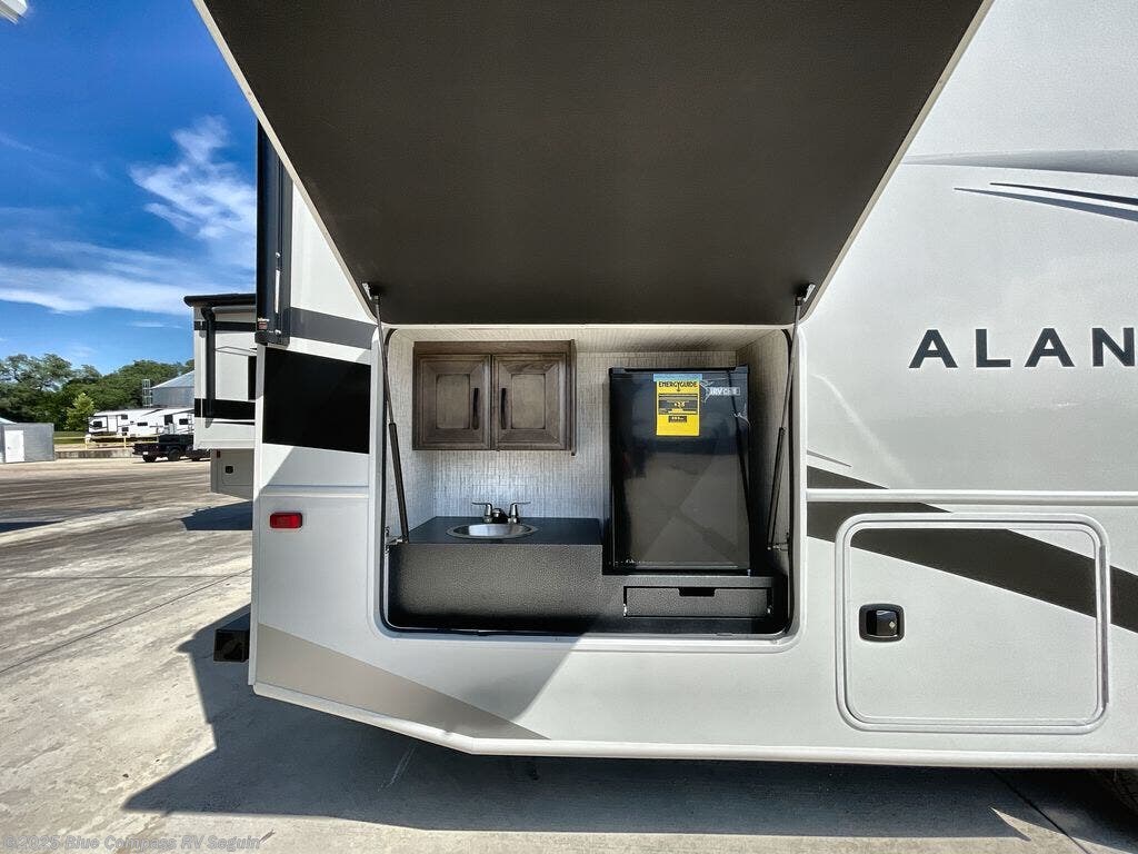 With any Alante Class A gas motorhome by Jayco, the mandatory Customer Value package provides JRide technology with a computer-balanced driveshaft ensuring smooth and efficient power transfer to the wheels, and SACHS shock absorbers offering independent adjustments to the road conditions. There is also a one-piece, seamless, crowned fiberglass roof, and an exterior entertainment center to watch shows and movies. The automatic hydraulic leveling jacks, 120 in. panoramic windshield, 200W solar panel, and the electric-powered entrance step will make traveling that much easier. And the interior equipment includes a Sony infotainment center with Apple CarPlay and Android Auto, a backup and side-view cameras for easy parking, plus a 6-way power driver seat for comfortable and safe driving. You will also love the power front privacy shade with manual side privacy shades, LED-lit hardwood fascia and countertops, a pop-up charging station in the kitchen and a USB port and wireless charging in the nightstands.
