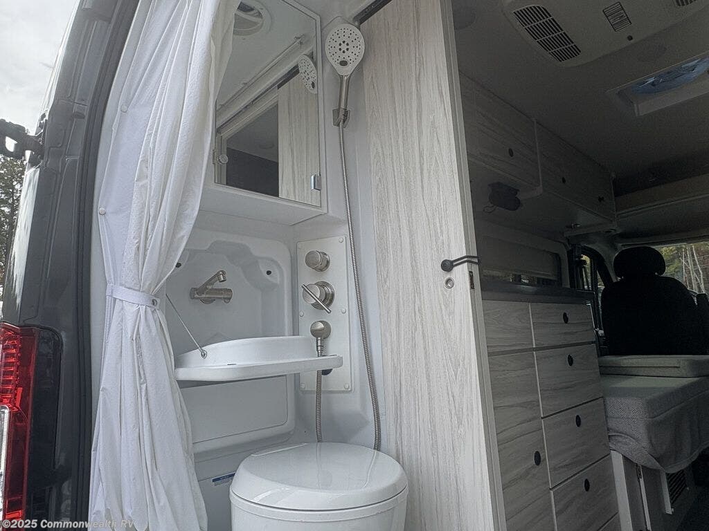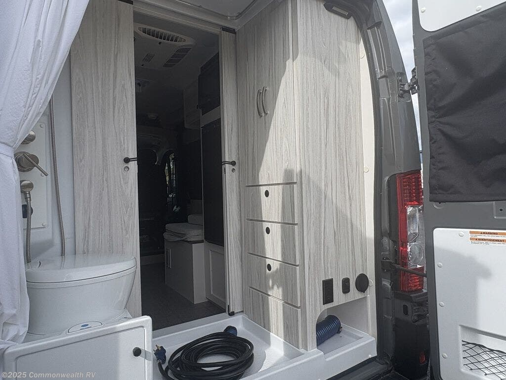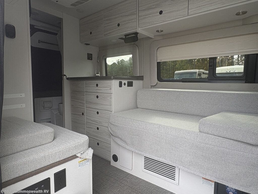 Inside, you’ll find a thoughtfully designed layout featuring a convertible sofa that transforms into a full-size 54" x 72" bed, a full rear wet bath with shower and cassette toilet, and a well-equipped galley kitchen with an induction cooktop, microwave, refrigerator, and stainless-steel sink.