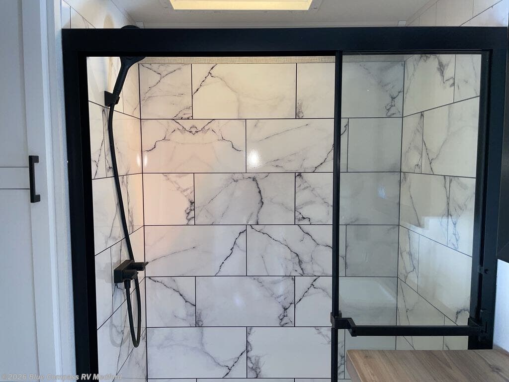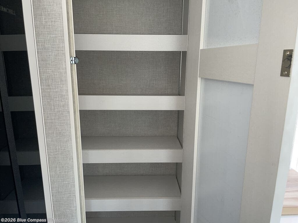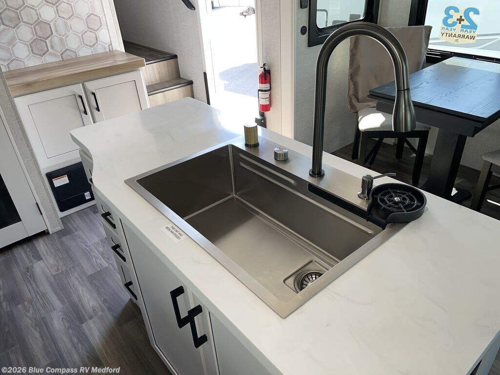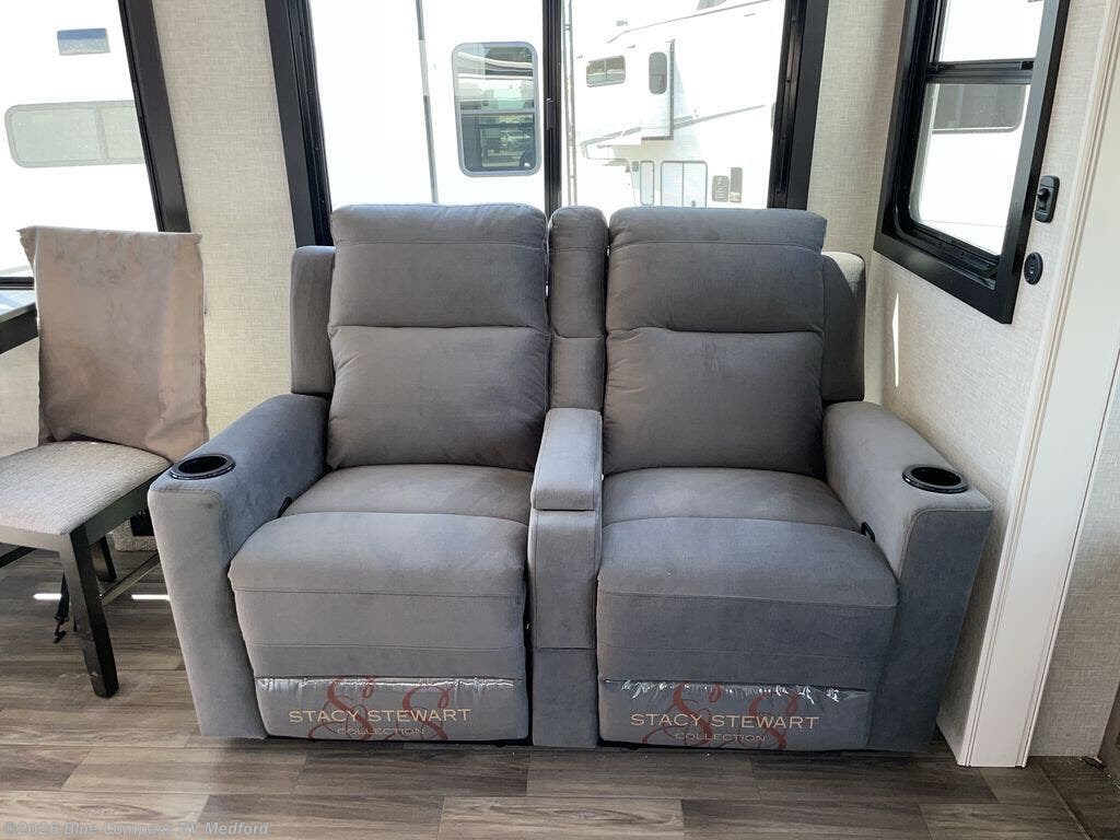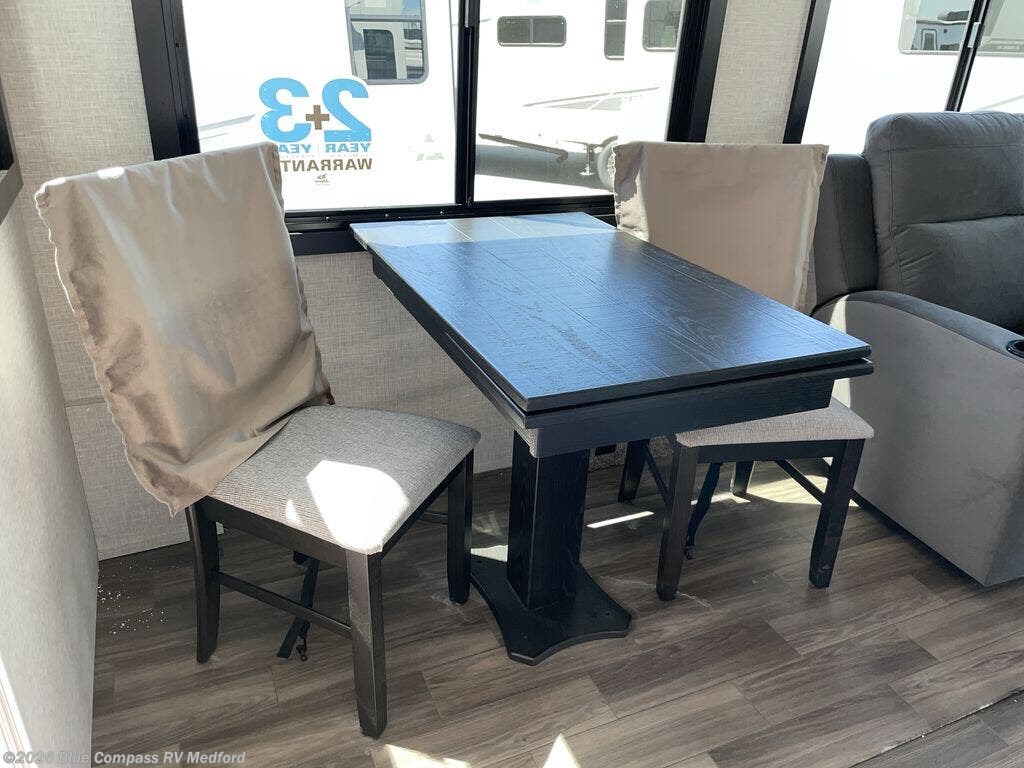 Triple slides for space, plenty of seating spaces, plus a spacious private bedroom make this fifth wheel one you won't want to pass up! You can freshen up each day in the full bath that includes a residential style glass shower door, a bathroom skylight, and a medicine cabinet to keep this space organized. Once you've cut up some fresh fruit at the kitchen island, whip up some eggs and bacon for breakfast, or just grab the cereal from the pantry. There is a spacious 16 cu. ft. 12V refrigerator, plus a hutch where you can store your own coffee machine. Relax on the tri-fold sofa, theater seat, or free-standing table before heading out for the day. The king bed slide out in the front private bedroom will be waiting for you when you return!
