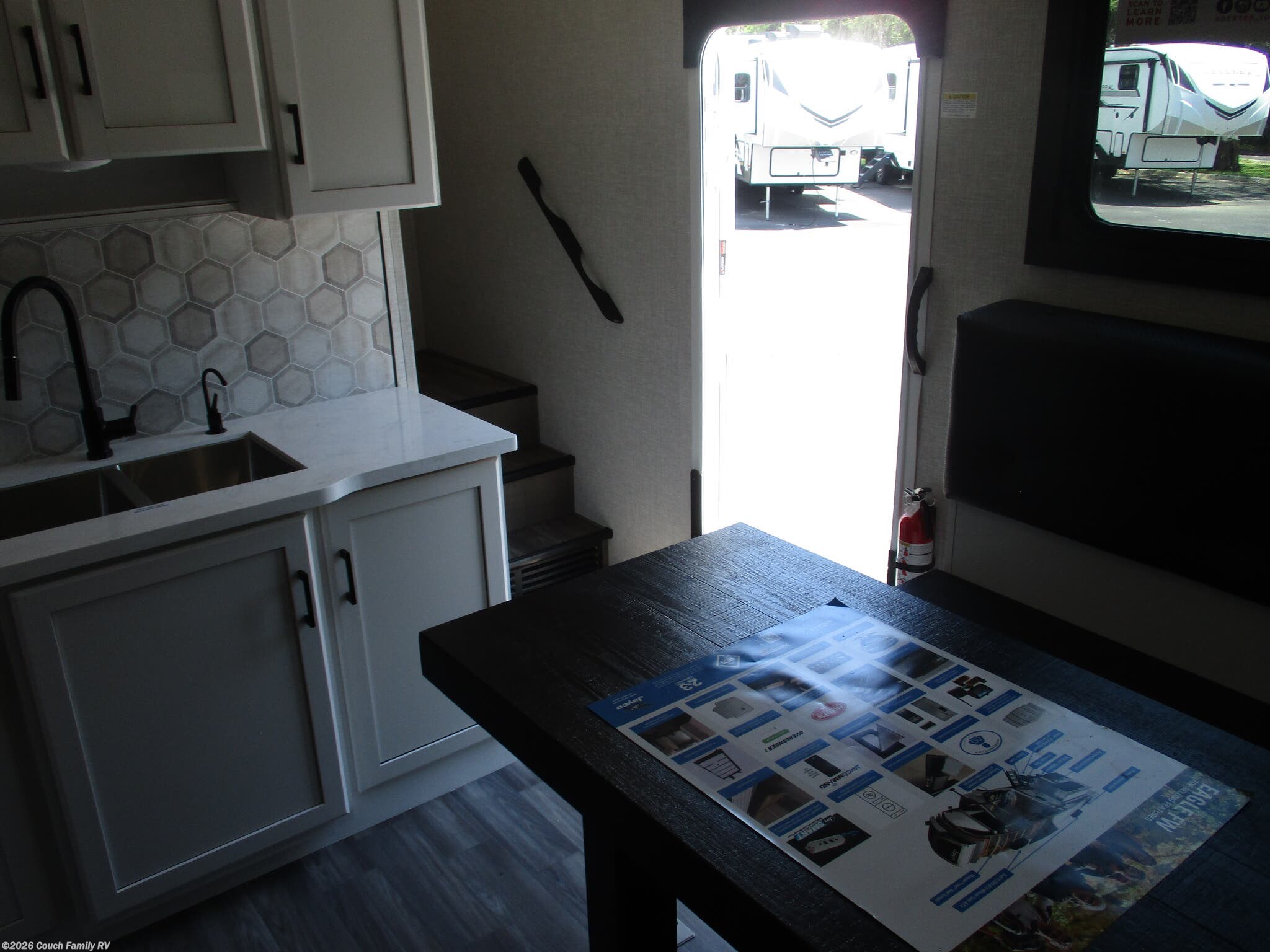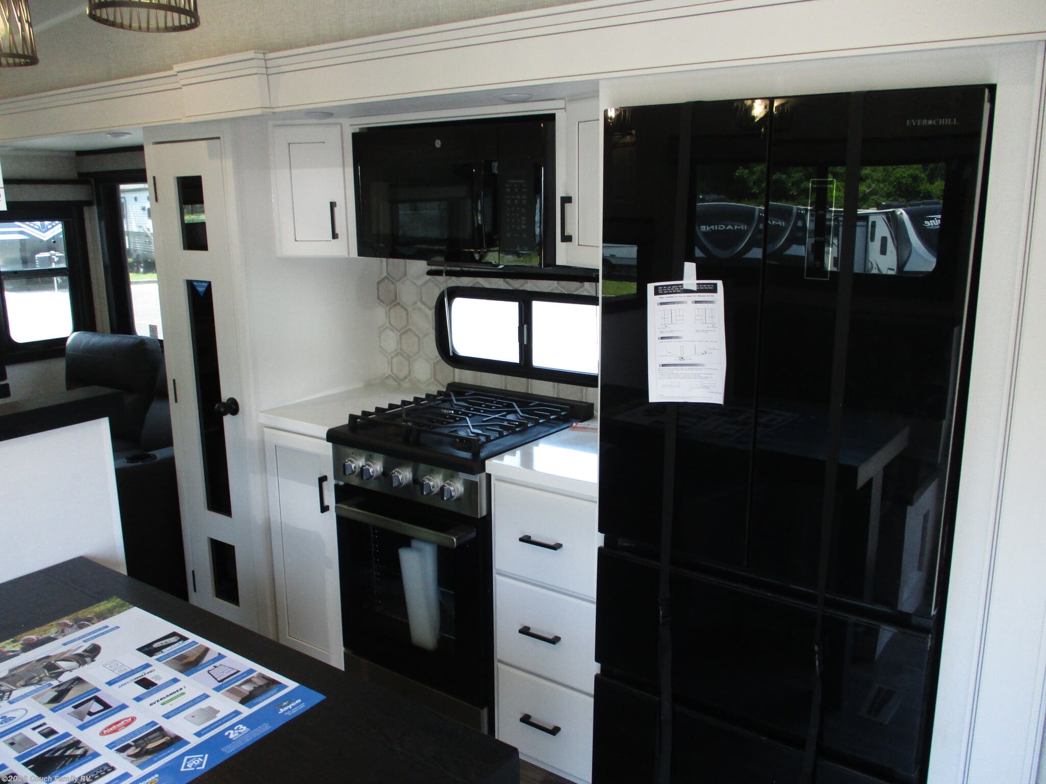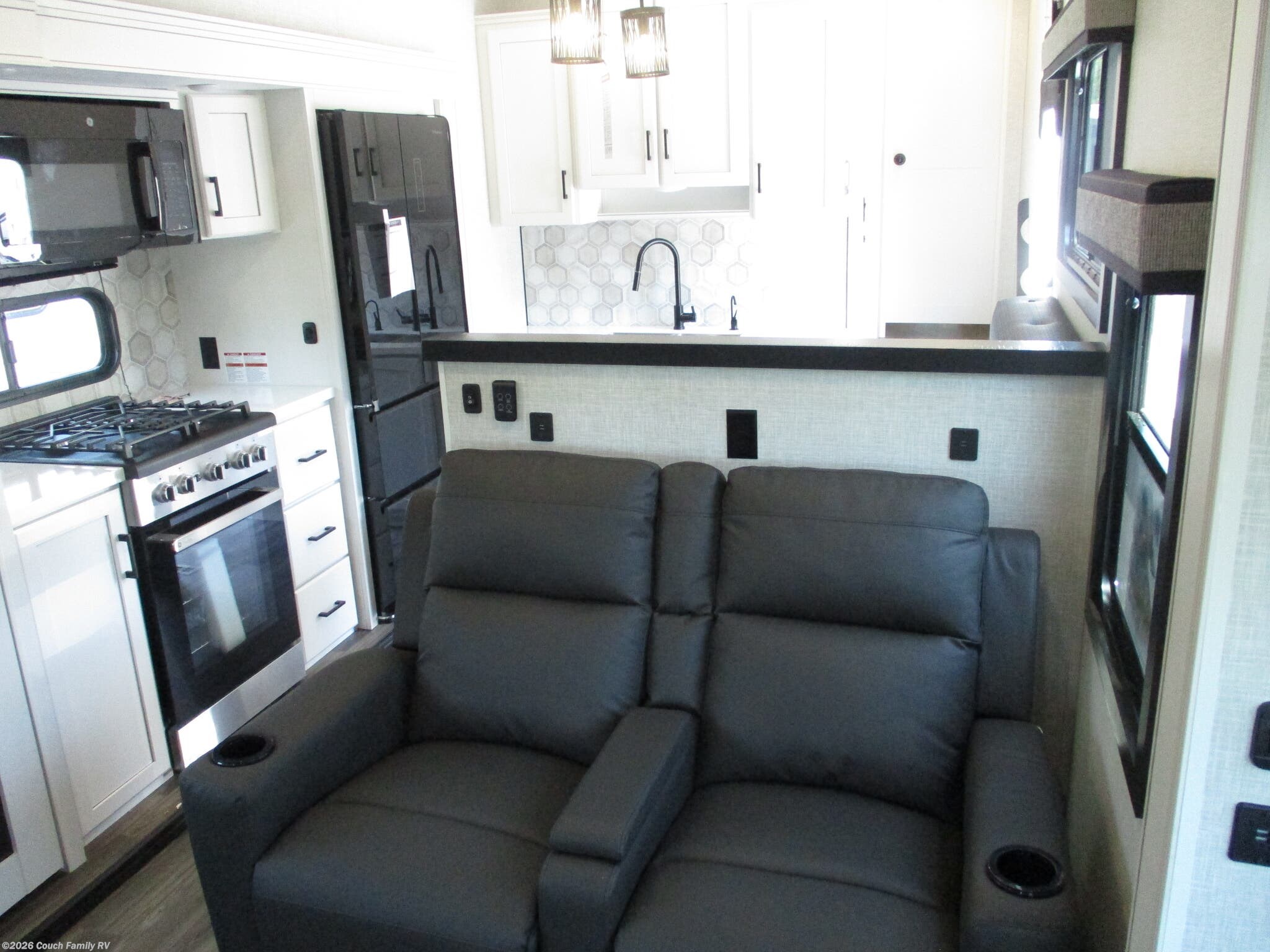 This fifth wheel is loaded with modern amenities that elevate your travel experience. The interior includes a cozy fireplace, a king-size bed, and comfortable rocker recliners, offering premium comfort after a day of adventure. The spacious bathroom features a shower and toilet, complemented by a convenient medicine cabinet. Stay entertained with a surround sound system and multiple TV options, perfect for movie nights or catching up on your favorite shows.