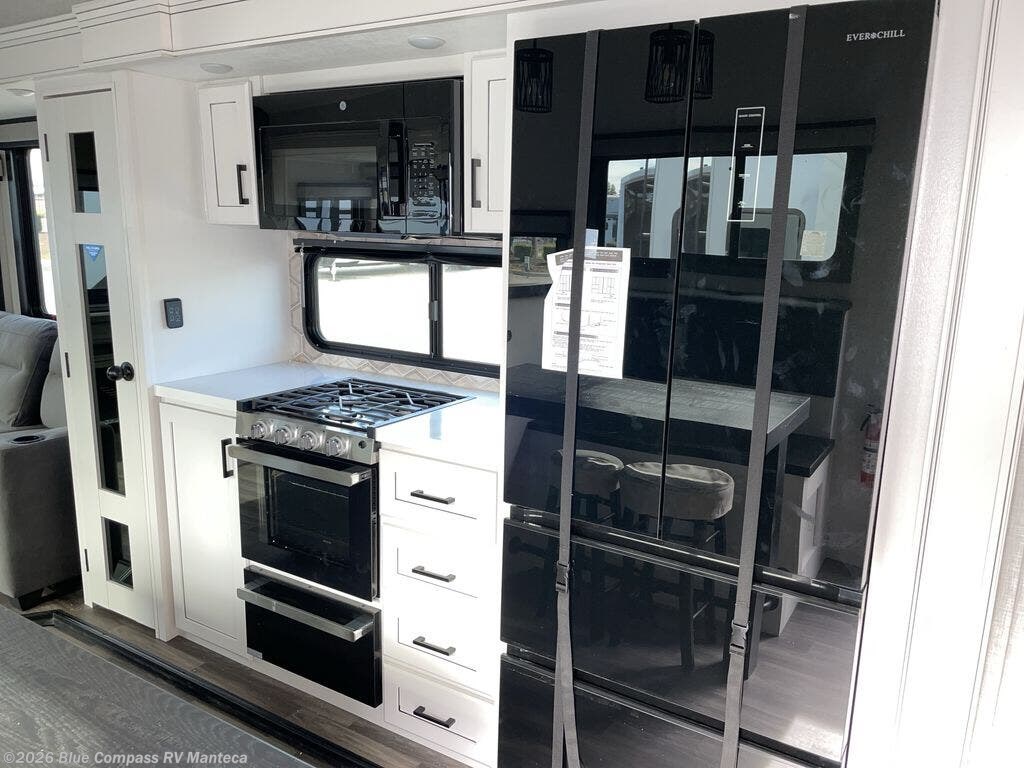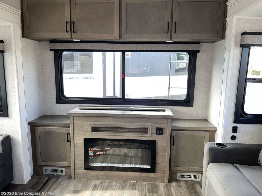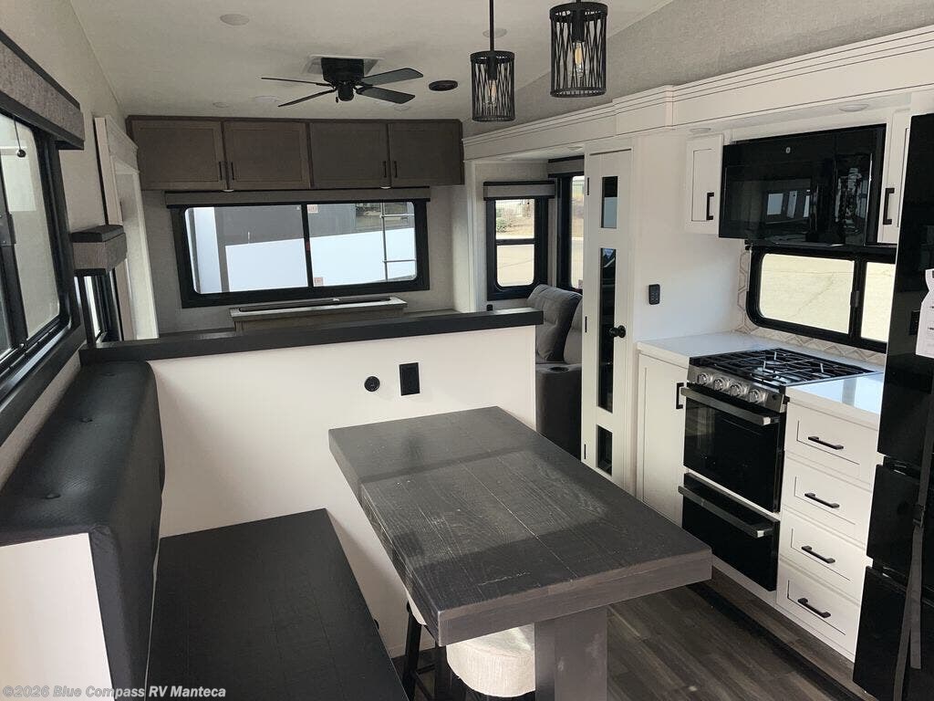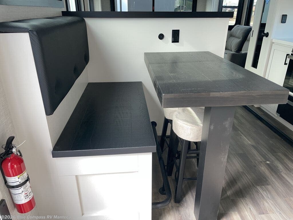 Head out on a great weekend adventure with this fifth wheel! It features a front private bedroom with a king bed that could be switched out for an optional Olympic bed, a chest with TV prep above, and a front walk-in closet with washer and dryer prep. The full bathroom has a residential style glass door and a linen closet to keep your towels close. The chef will enjoy preparing meals in the kitchen with the three burner cooktop, but might love using the outside kitchen even more. When you're ready to wind down your nights you can either play card games at the table and chairs with a bench or head to the rear living area and relax on one of the two tri-fold sofas or theater seating across from the entertainment center with a fireplace!