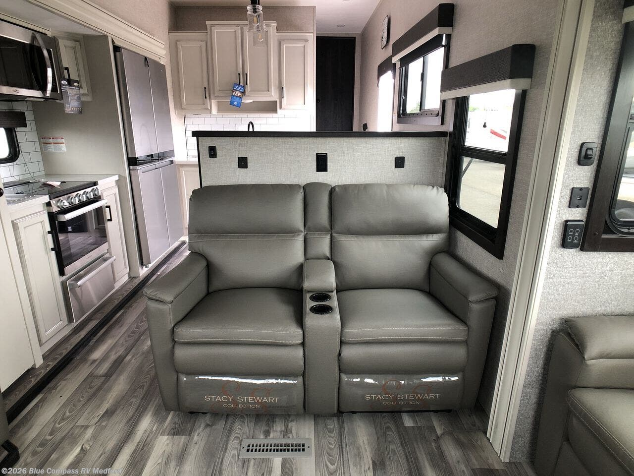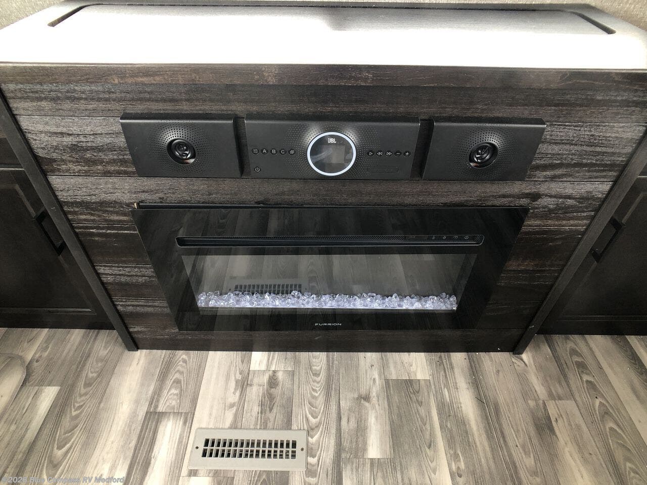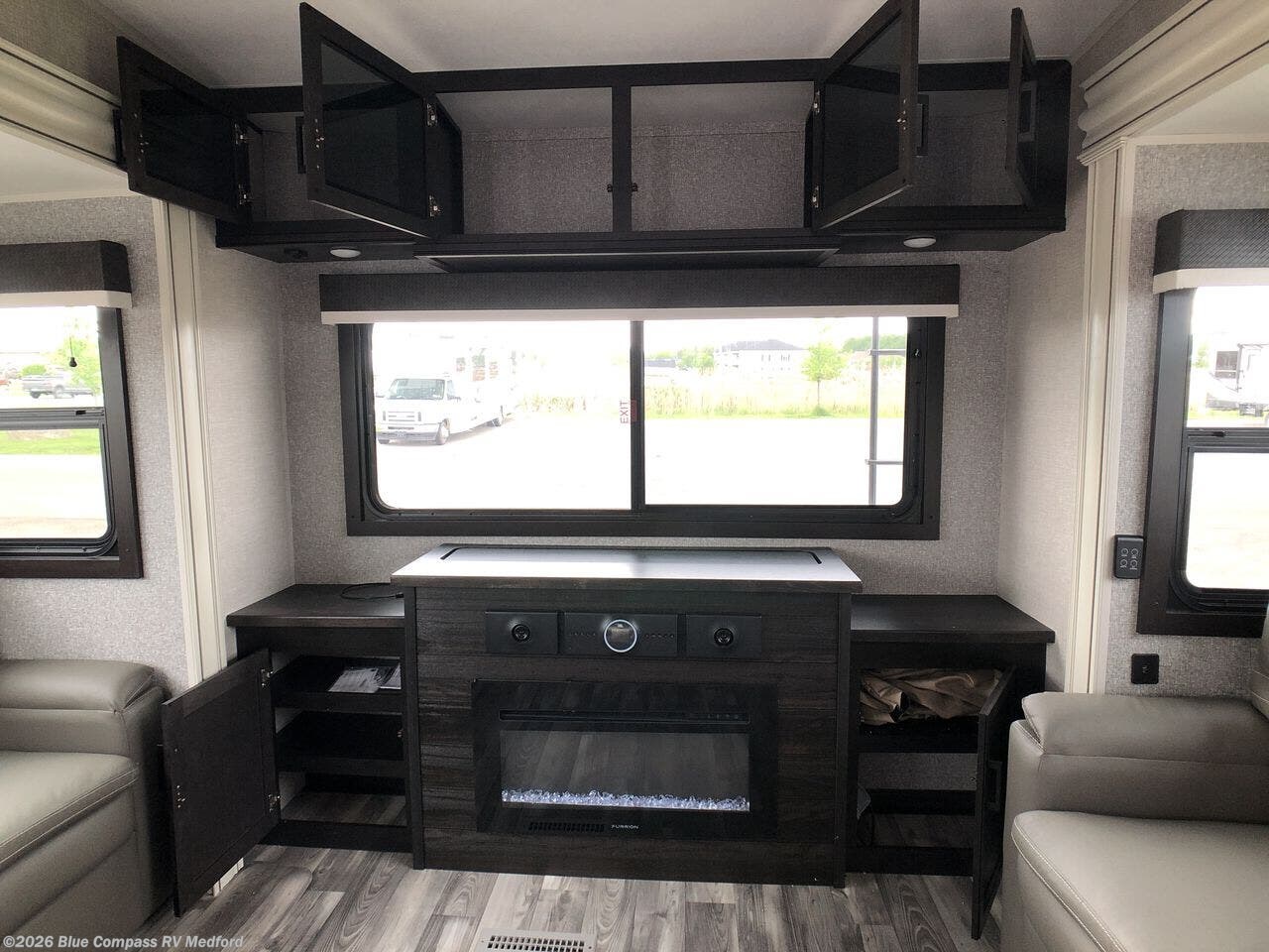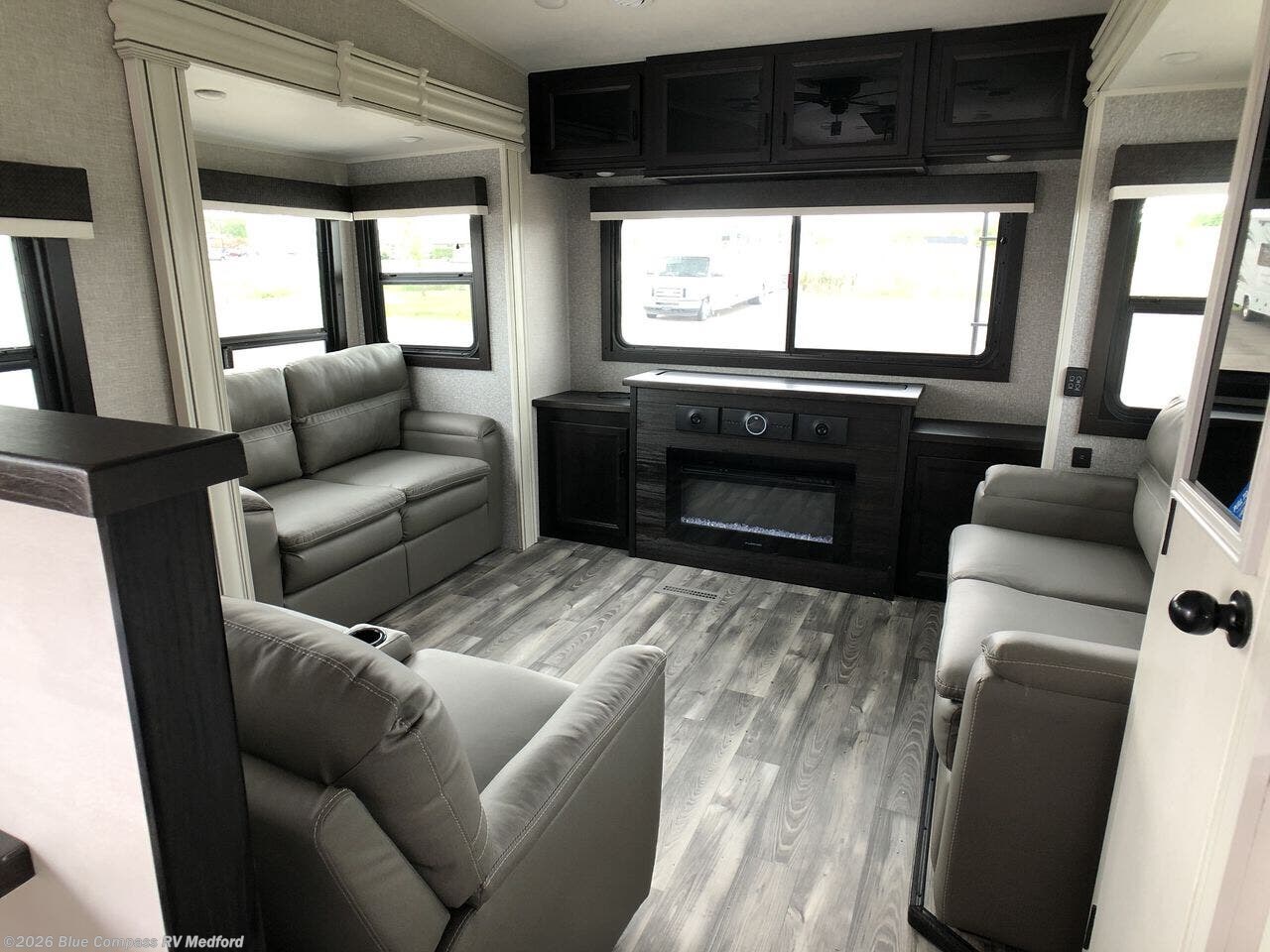 Head out on a great weekend adventure with this fifth wheel! It features a front private bedroom with a king bed that could be switched out for an optional Olympic bed, a chest with TV prep above, and a front walk-in closet with washer and dryer prep. The full bathroom has a residential style glass door and a linen closet to keep your towels close. The chef will enjoy preparing meals in the kitchen with the three burner cooktop, but might love using the outside kitchen even more. When you're ready to wind down your nights you can either play card games at the table and chairs with a bench or head to the rear living area and relax on one of the two tri-fold sofas or theater seating across from the entertainment center with a fireplace!