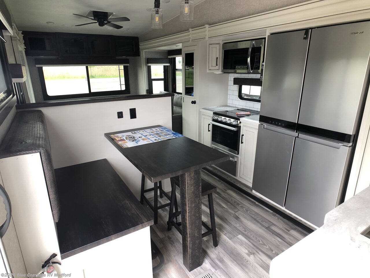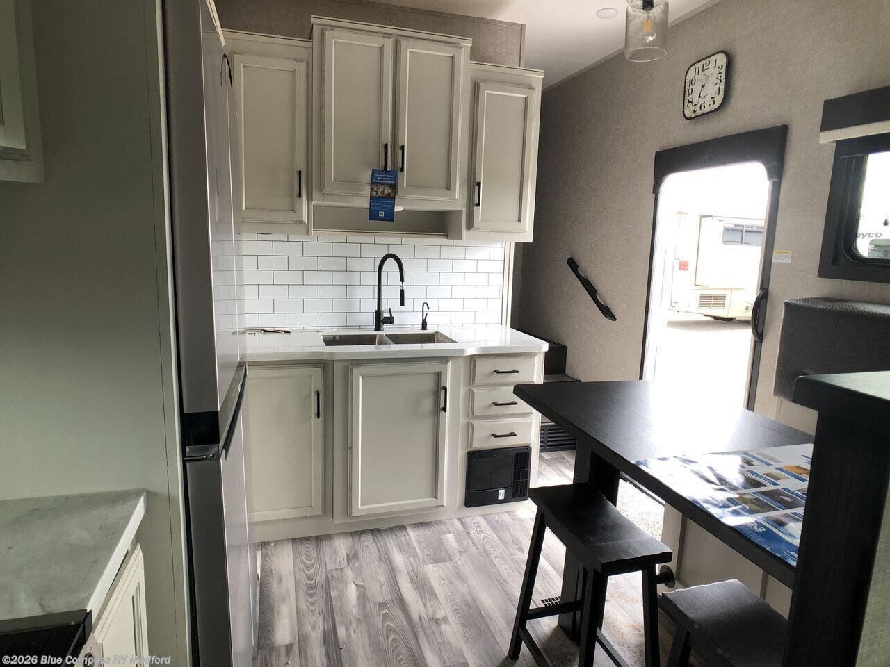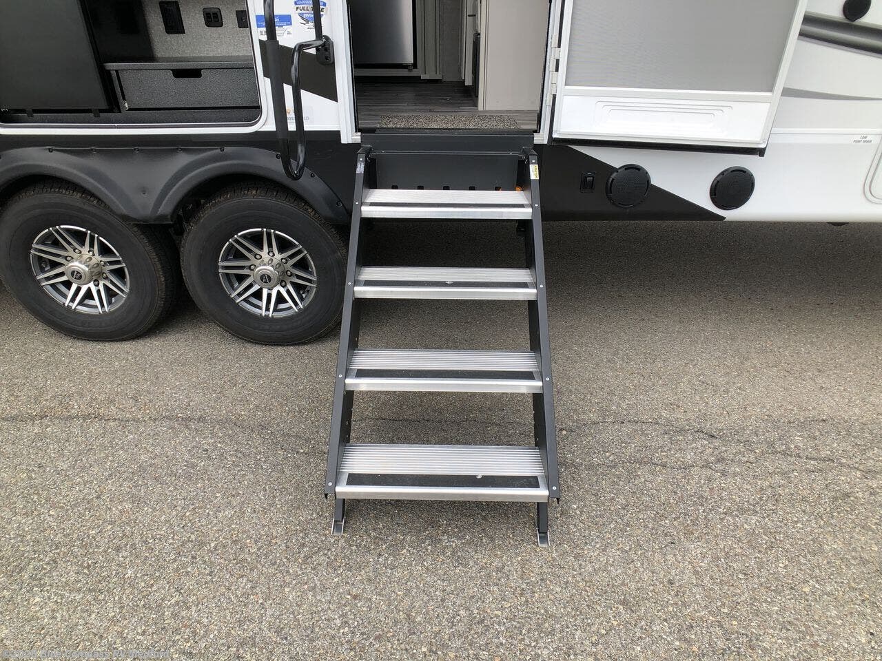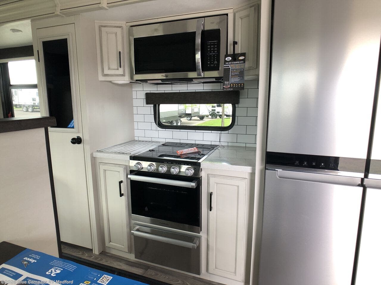 Head out on a great weekend adventure with this fifth wheel! It features a front private bedroom with a king bed that could be switched out for an optional Olympic bed, a chest with TV prep above, and a front walk-in closet with washer and dryer prep. The full bathroom has a residential style glass door and a linen closet to keep your towels close. The chef will enjoy preparing meals in the kitchen with the three burner cooktop, but might love using the outside kitchen even more. When you're ready to wind down your nights you can either play card games at the table and chairs with a bench or head to the rear living area and relax on one of the two tri-fold sofas or theater seating across from the entertainment center with a fireplace!