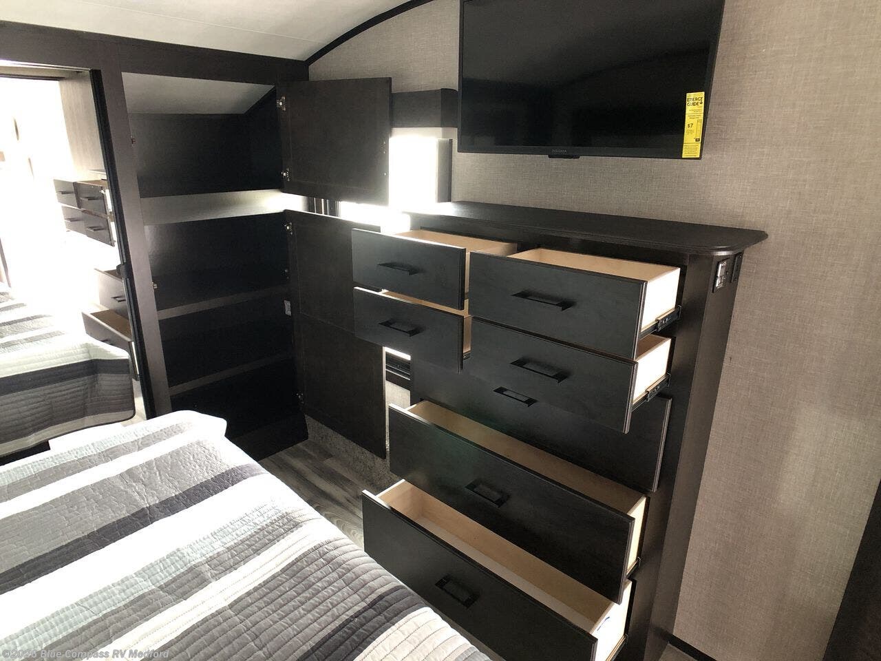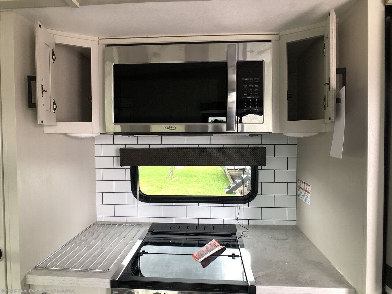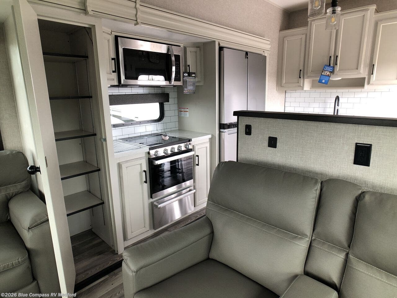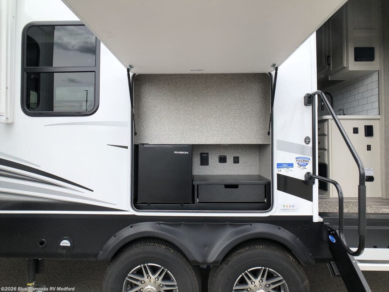 Head out on a great weekend adventure with this fifth wheel! It features a front private bedroom with a king bed that could be switched out for an optional Olympic bed, a chest with TV prep above, and a front walk-in closet with washer and dryer prep. The full bathroom has a residential style glass door and a linen closet to keep your towels close. The chef will enjoy preparing meals in the kitchen with the three burner cooktop, but might love using the outside kitchen even more. When you're ready to wind down your nights you can either play card games at the table and chairs with a bench or head to the rear living area and relax on one of the two tri-fold sofas or theater seating across from the entertainment center with a fireplace!