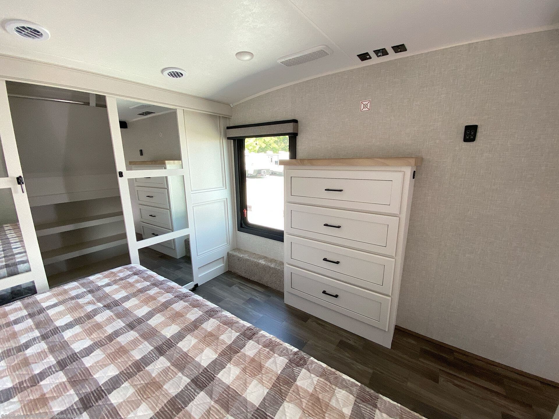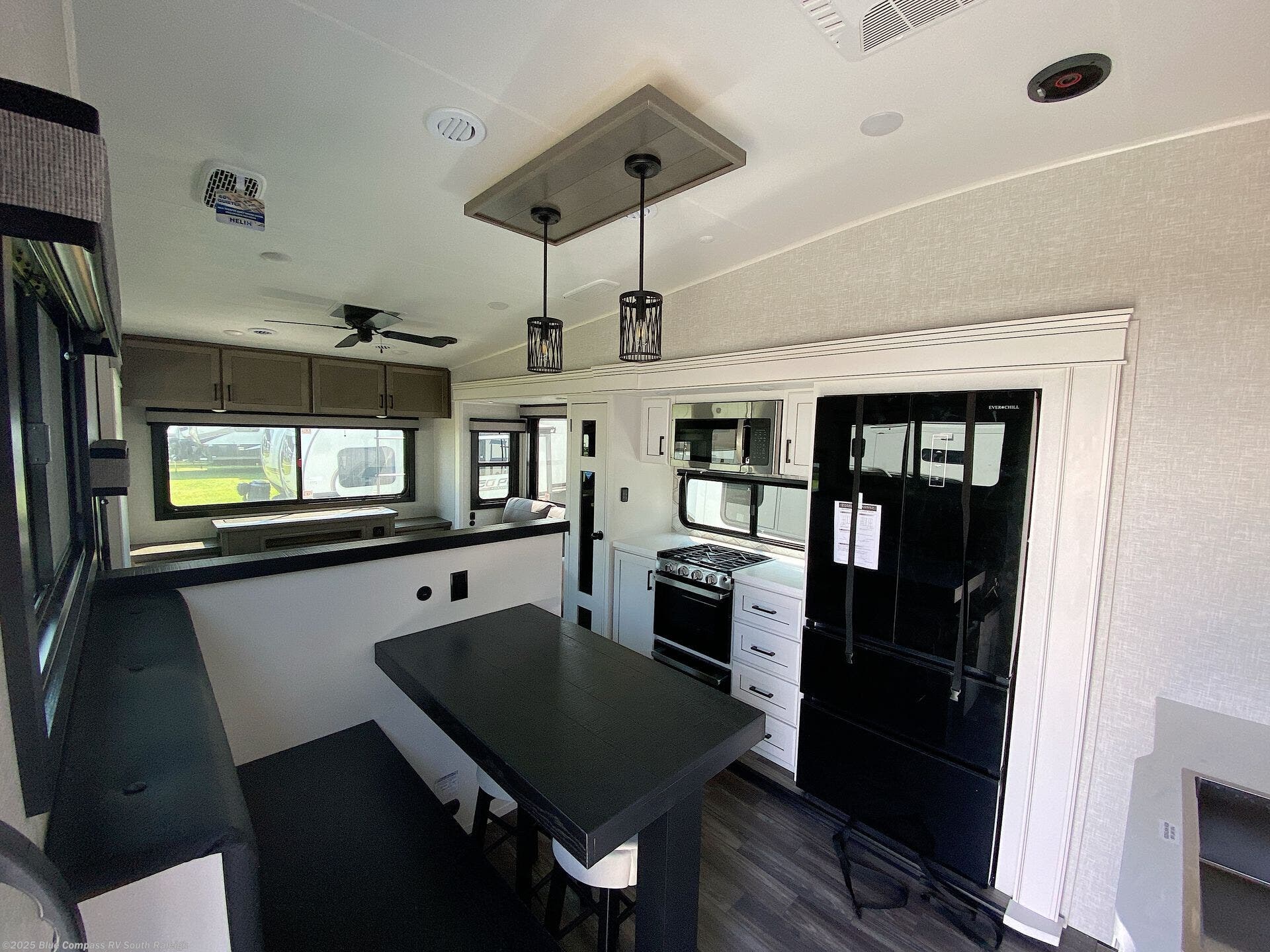 Head out on a great weekend adventure with this fifth wheel! It features a front private bedroom with a king bed that could be switched out for an optional Olympic bed, a chest with TV prep above, and a front walk-in closet with washer and dryer prep. The full bathroom has a residential style glass door and a linen closet to keep your towels close. The chef will enjoy preparing meals in the kitchen with the three burner cooktop, but might love using the outside kitchen even more. When you're ready to wind down your nights you can either play card games at the table and chairs with a bench or head to the rear living area and relax on one of the two tri-fold sofas or theater seating across from the entertainment center with a fireplace!