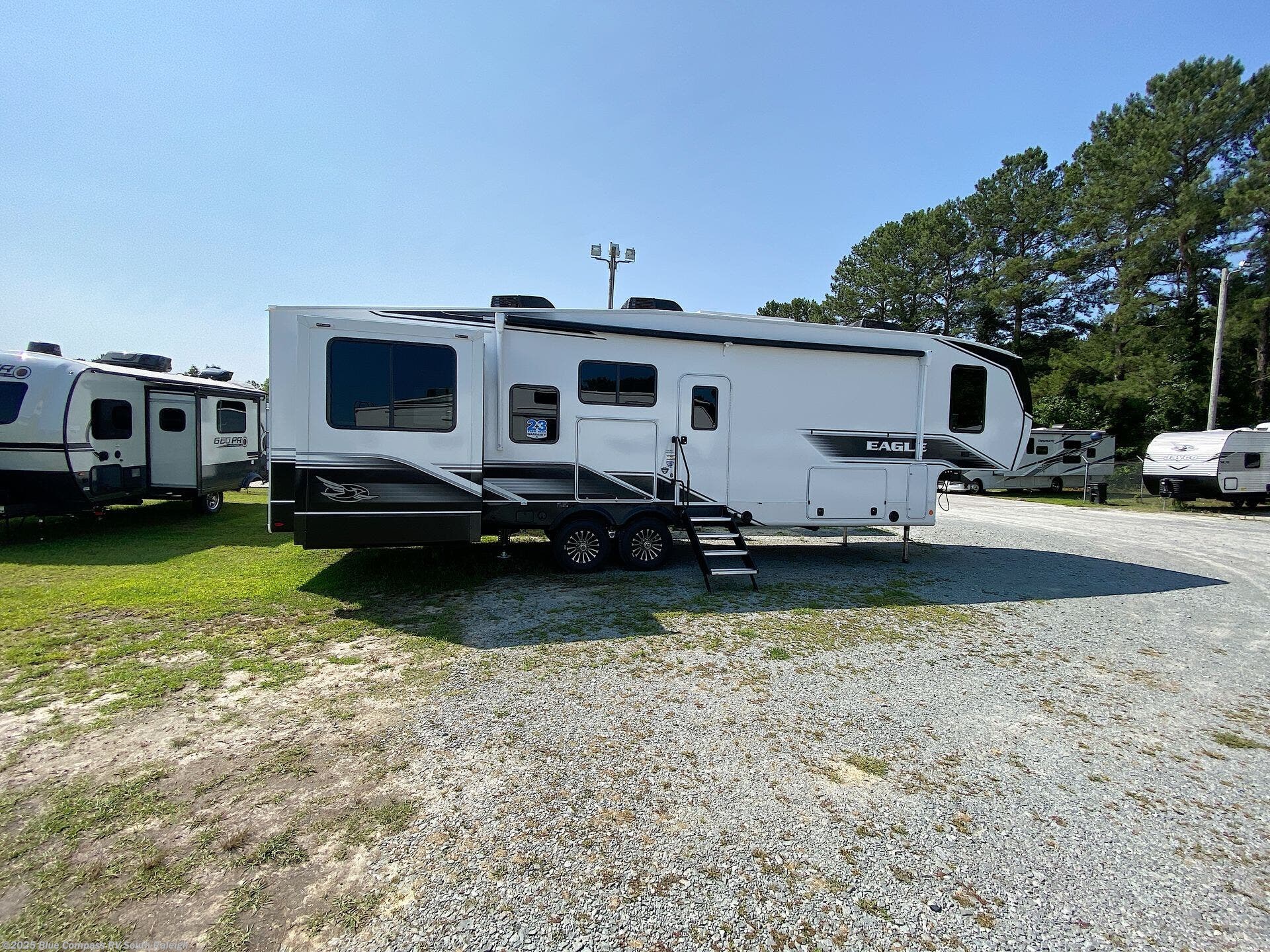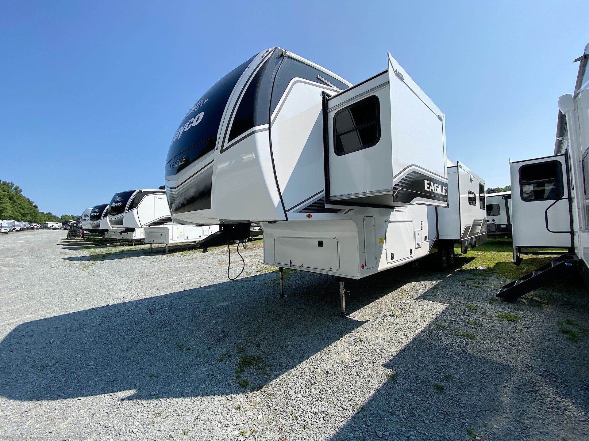 With any Eagle fifth wheel by Jayco you will appreciate durable construction materials, like the Magnum Truss Roof and the Stronghold VBL laminated walls. The JAYCOMMAND Smart RV system puts you in control of your RV's functions, and the 5 Star Handling Package will provide smooth towing from home to camp. Each model features Climate Shield zero-degree tested weather protection and the industry-exclusive HELIX cooling system that features two 15,000 BTU Whisper Quiet A/C's to keep you comfortable year around. Some of the exterior conveniences you are sure to love are the pass-through storage with Slam-Latch baggage doors and an automotive style front cap with max turn radius. The Eagle fifth wheels are designed to make you feel at home with solid hardwood slide fascia, residential vinyl flooring throughout, 100% no floor vents, and blackout roller shades with reflective side throughout for added privacy and insulation.