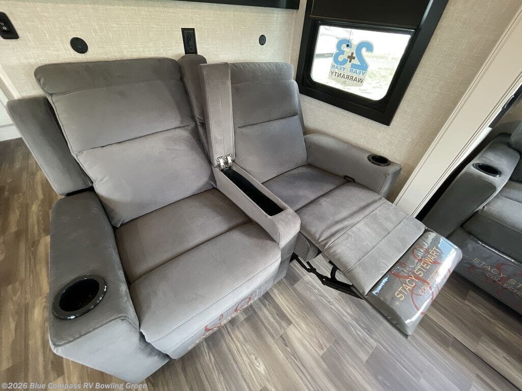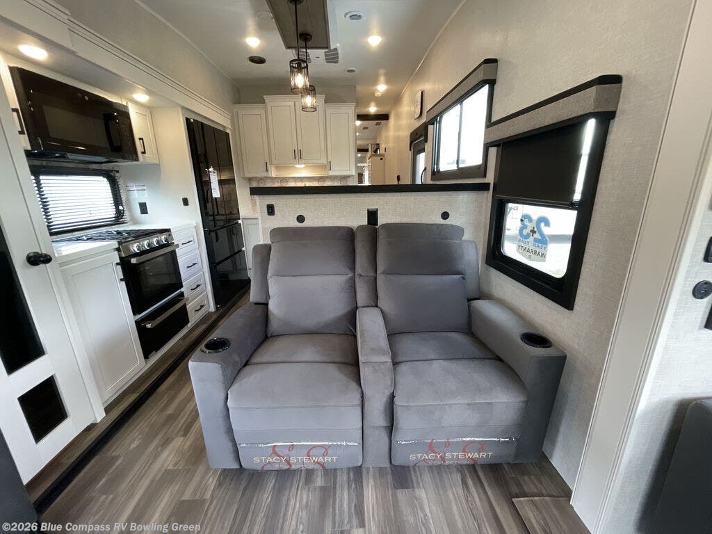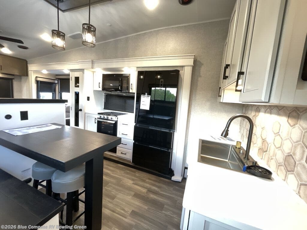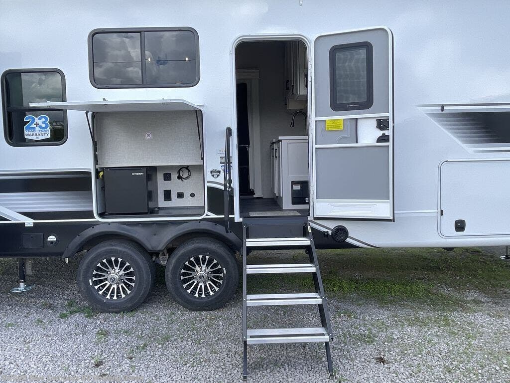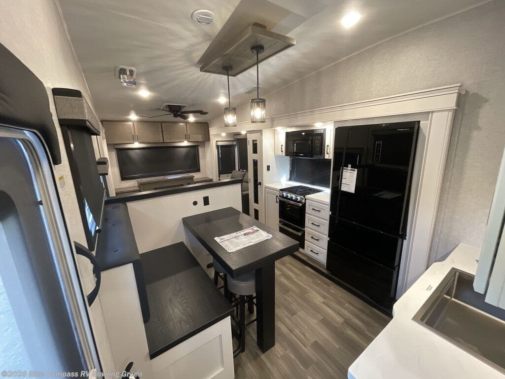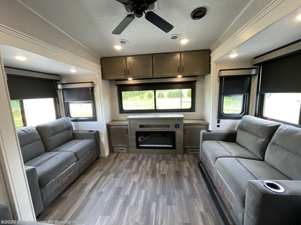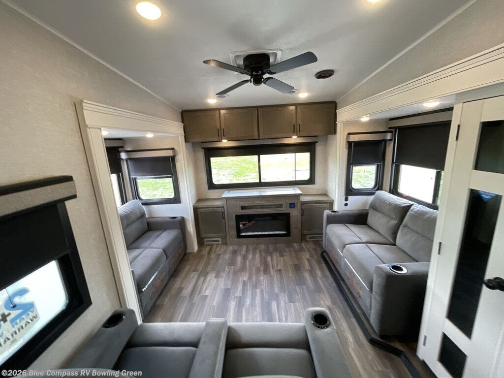 Head out on a great weekend adventure with this fifth wheel! It features a front private bedroom with a king bed that could be switched out for an optional Olympic bed, a chest with TV prep above, and a front walk-in closet with washer and dryer prep. The full bathroom has a residential style glass door and a linen closet to keep your towels close. The chef will enjoy preparing meals in the kitchen with the three burner cooktop, but might love using the outside kitchen even more. When you're ready to wind down your nights you can either play card games at the table and chairs with a bench or head to the rear living area and relax on one of the two tri-fold sofas or theater seating across from the entertainment center with a fireplace!