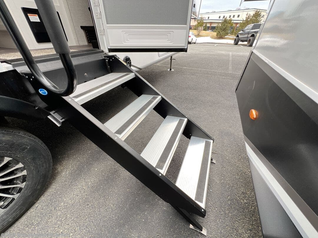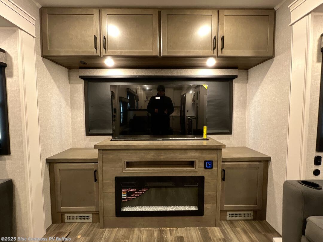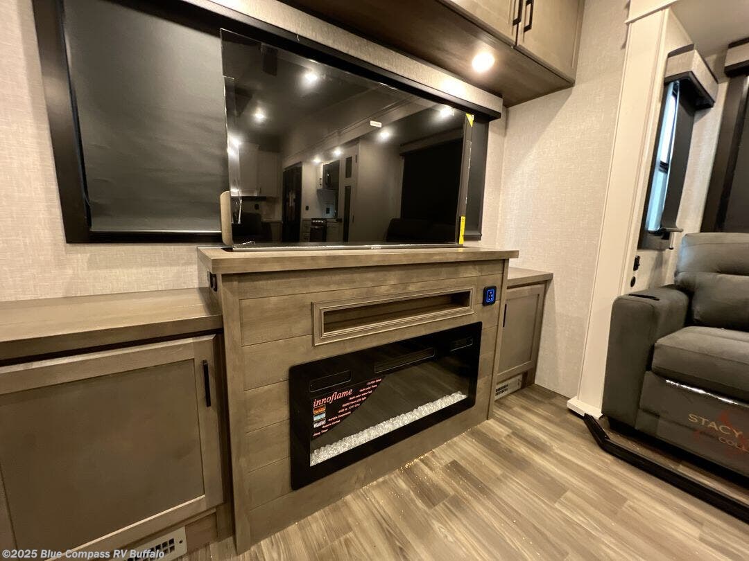 Head out on a great weekend adventure with this fifth wheel! It features a front private bedroom with a king bed that could be switched out for an optional Olympic bed, a chest with TV prep above, and a front walk-in closet with washer and dryer prep. The full bathroom has a residential style glass door and a linen closet to keep your towels close. The chef will enjoy preparing meals in the kitchen with the three burner cooktop, but might love using the outside kitchen even more. When you're ready to wind down your nights you can either play card games at the table and chairs with a bench or head to the rear living area and relax on one of the two tri-fold sofas or theater seating across from the entertainment center with a fireplace!