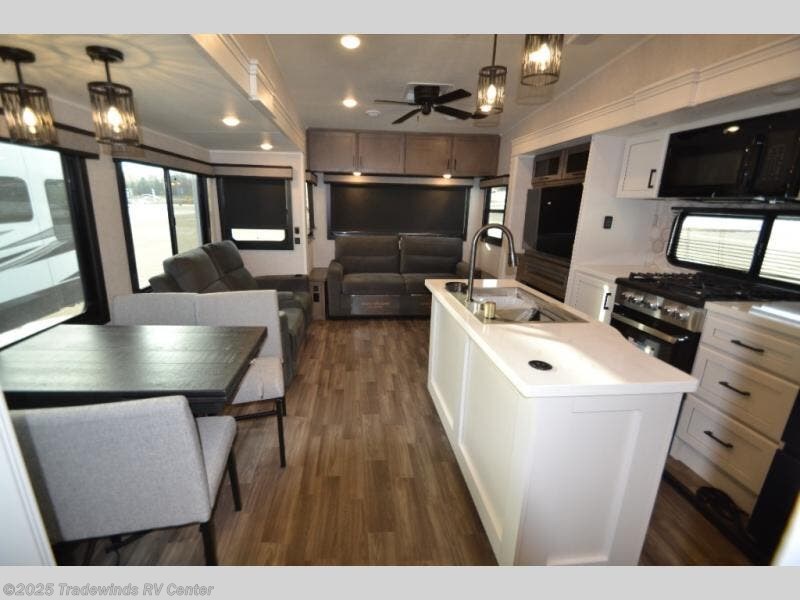 This fifth wheel with four slides is one your whole crew will love! There is a middle bedroom/den with a tri-fold sofa and a desk, allowing this room to become an office if you need it. The loft above this room will be a big hit with the little ones, and the full bath is centrally located so everyone can use it easily. You will have the front private bedroom all to yourselves with a king bed slide out, a chest with TV prep, plus washer and dryer prep in the walk-in closet. The main living area includes everything you need to relax in comfort, like the theater seats, tri-fold sofa, and entertainment center with a fireplace. The chef will enjoy the extra counter space provided by the kitchen island, and there is plenty of storage with the pantry, hutch, and 16 cu. ft. 12V refrigerator. This model even has an outside kitchen, two power awnings, and outside storage for all your gear!