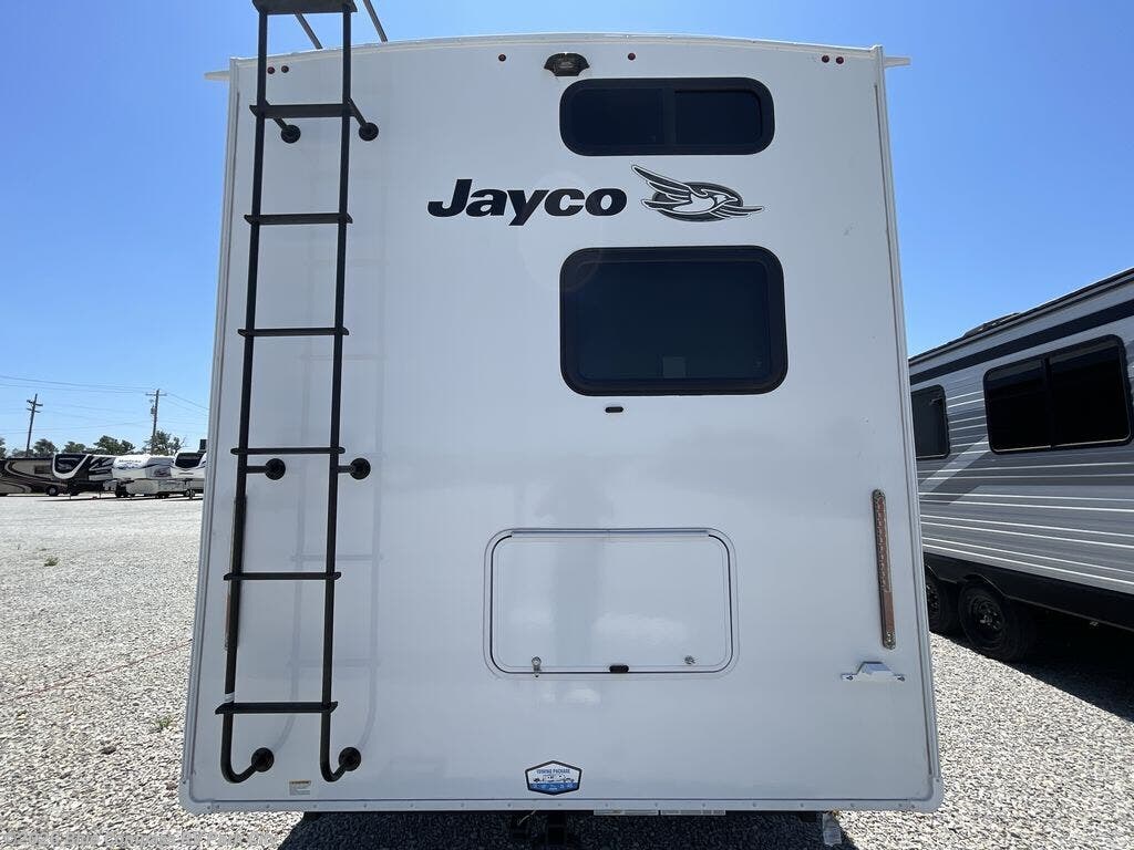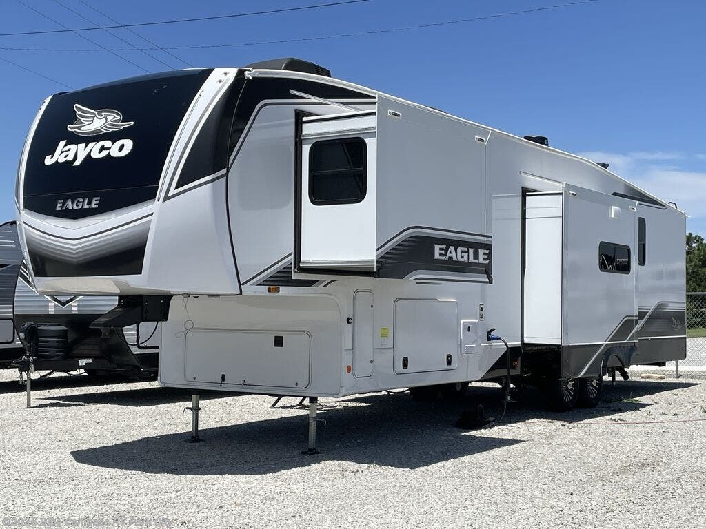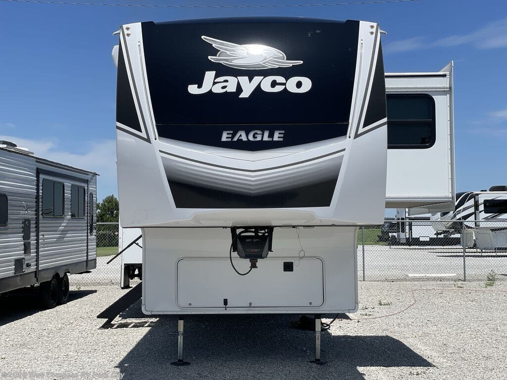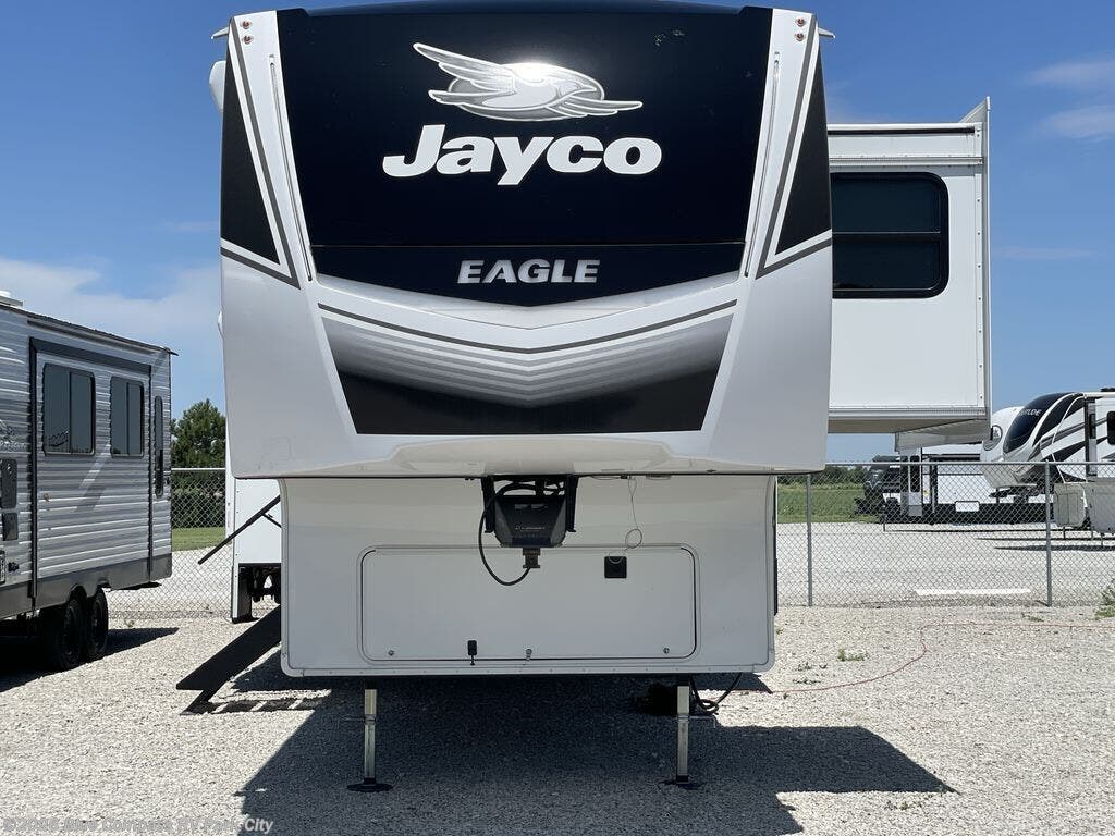 With any Eagle fifth wheel by Jayco you will appreciate durable construction materials, like the Magnum Truss Roof and the Stronghold VBL laminated walls. The JAYCOMMAND Smart RV system puts you in control of your RV's functions, and the 5 Star Handling Package will provide smooth towing from home to camp. Each model features Climate Shield zero-degree tested weather protection and the industry-exclusive HELIX cooling system that features two 15,000 BTU Whisper Quiet A/C's to keep you comfortable year around. Some of the exterior conveniences you are sure to love are the pass-through storage with Slam-Latch baggage doors and an automotive style front cap with max turn radius. The Eagle fifth wheels are designed to make you feel at home with solid hardwood slide fascia, residential vinyl flooring throughout, 100% no floor vents, and blackout roller shades with reflective side throughout for added privacy and insulation.