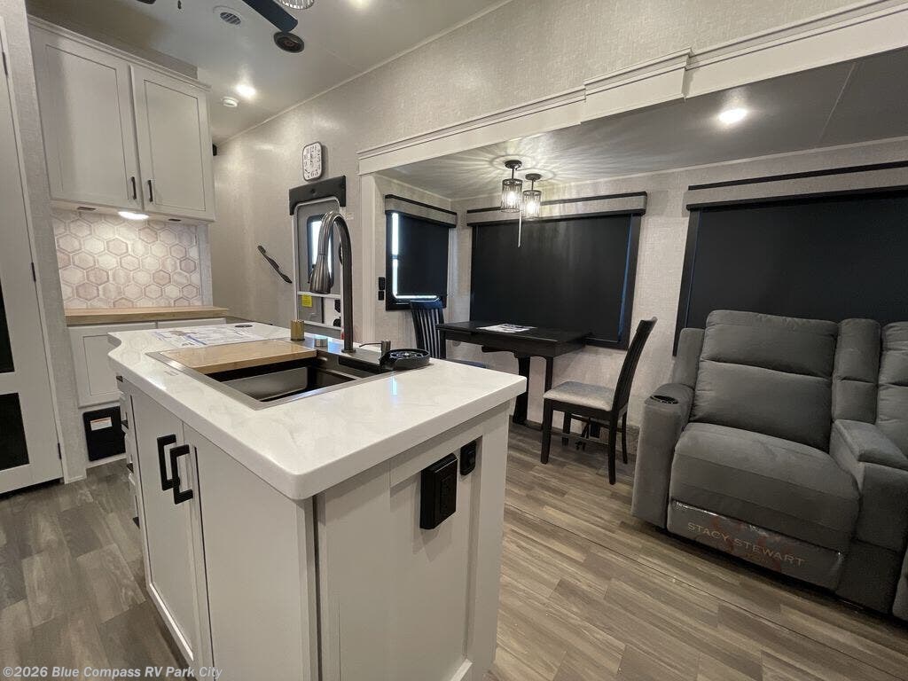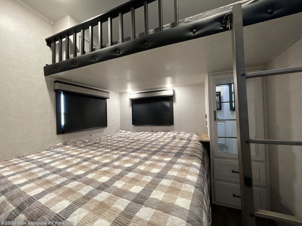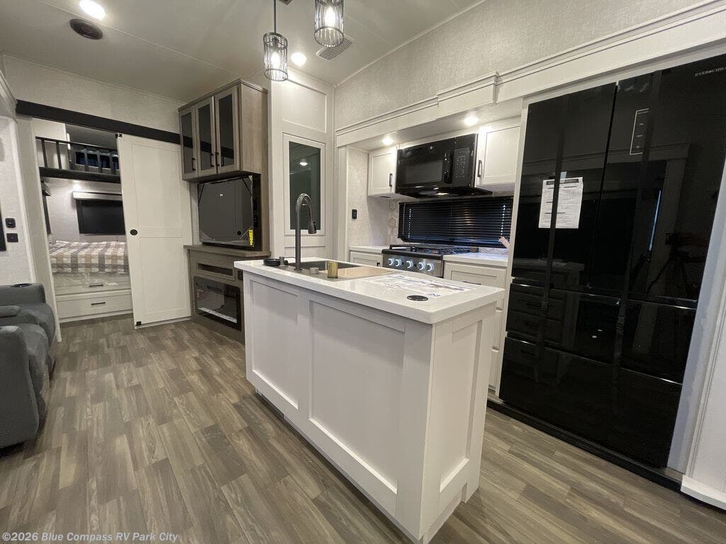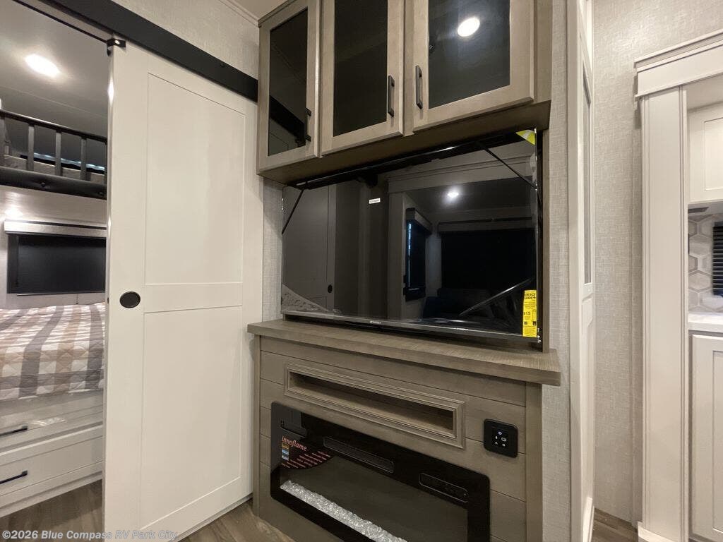 This fifth wheel is decked out in features you will love! The dual slides in the main living area create an open floorplan, and then there is a kitchen island that will make meal prepping easier. The theater seats and free standing table with chairs have a great view of the entertainment center and fireplace, and there is a ceiling fan here to keep the air moving. And did we mention there is an outside kitchen, complete with an outdoor refrigerator? This model also features a front private bedroom with a king bed slide out, a chest, and a front closet with convenient washer and dryer prep. There is also a rear private bunkhouse that has a 54" x 74" upper loft bed above a 66" x 80" Olympic bed with wardrobe storage drawers, as well as its very own half bathroom!