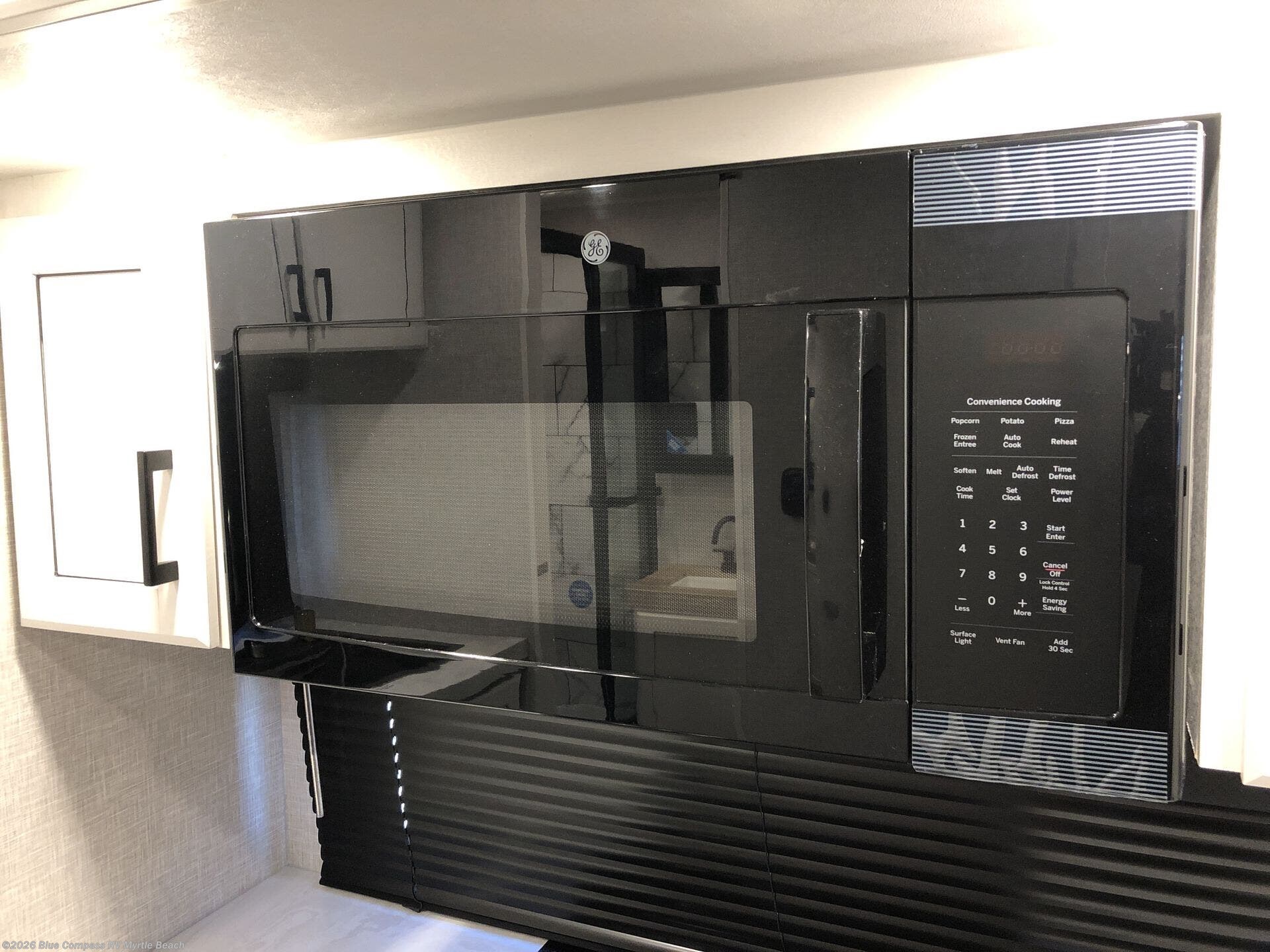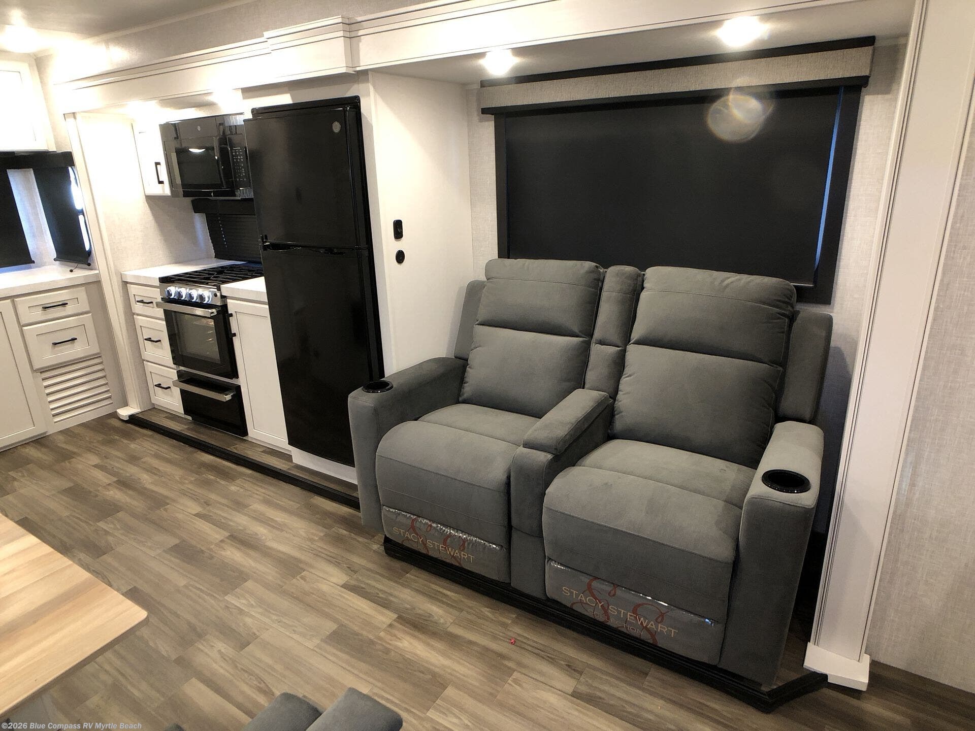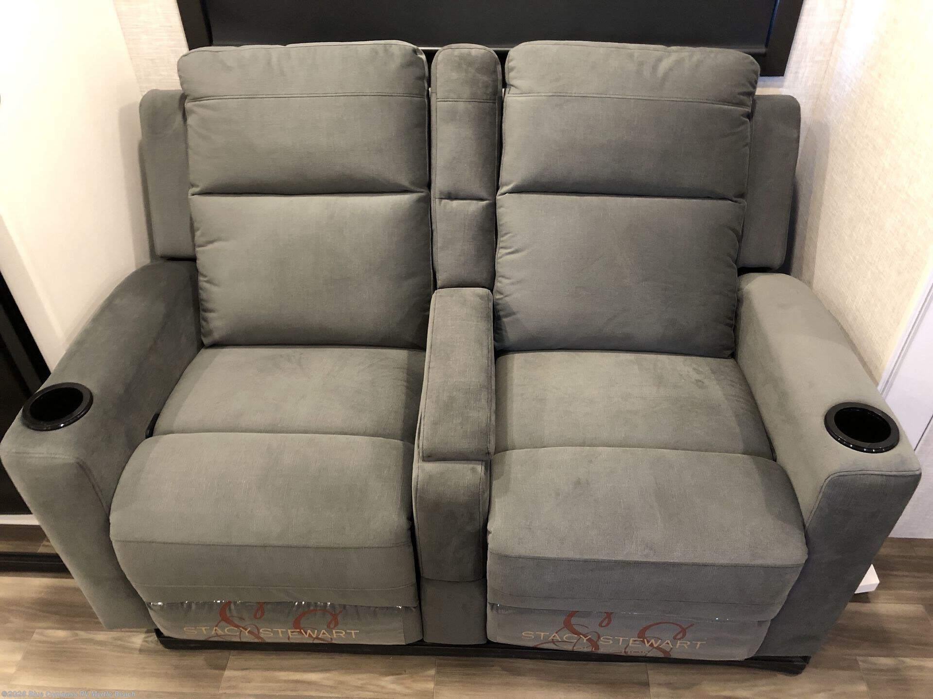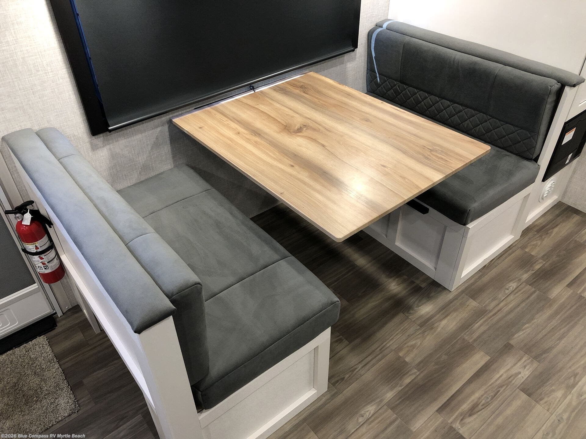 It will be so easy to enjoy camping trips when you're in this travel trailer! A full kitchen, complete with a three burner cooktop, over-the-range microwave, and 10 cu. ft. 12V refrigerator will let you cook and store meals, and the booth dinette provides a place to dine. Within the large slide, you'll find the 60" theater sofa with cup holders which is across from the 40" 4K Ultra LED HD Smart TV! You'll love having a 66" x 80" Olympic queen bed to sleep on, and there are dual wardrobes to keep your clothes organized. And larger camp gear can go outside in the pass-thru storage!