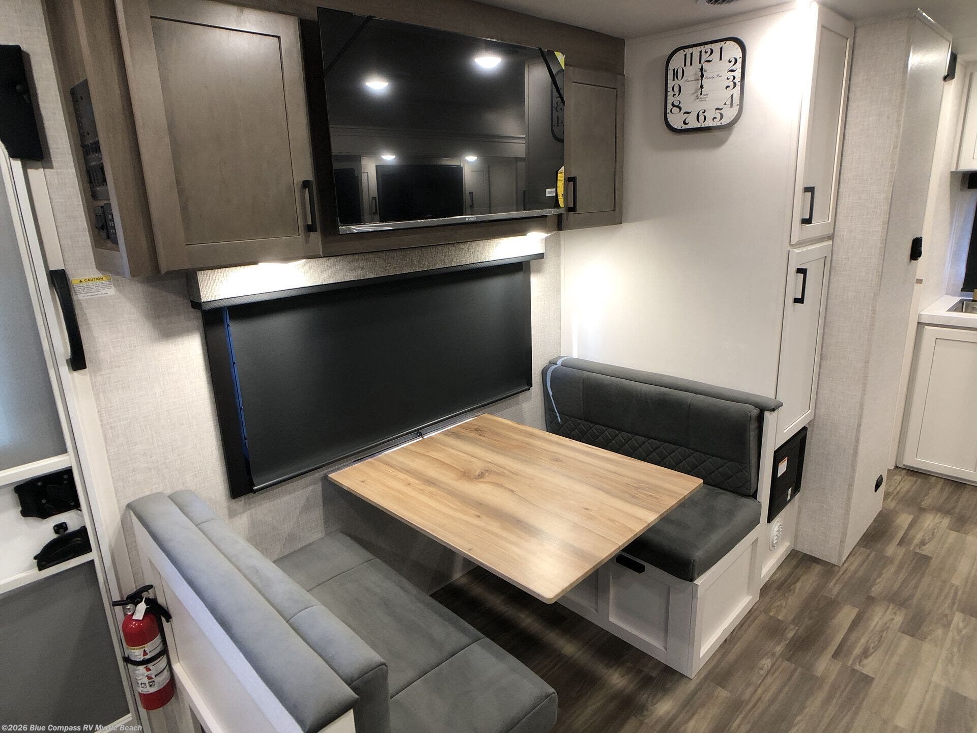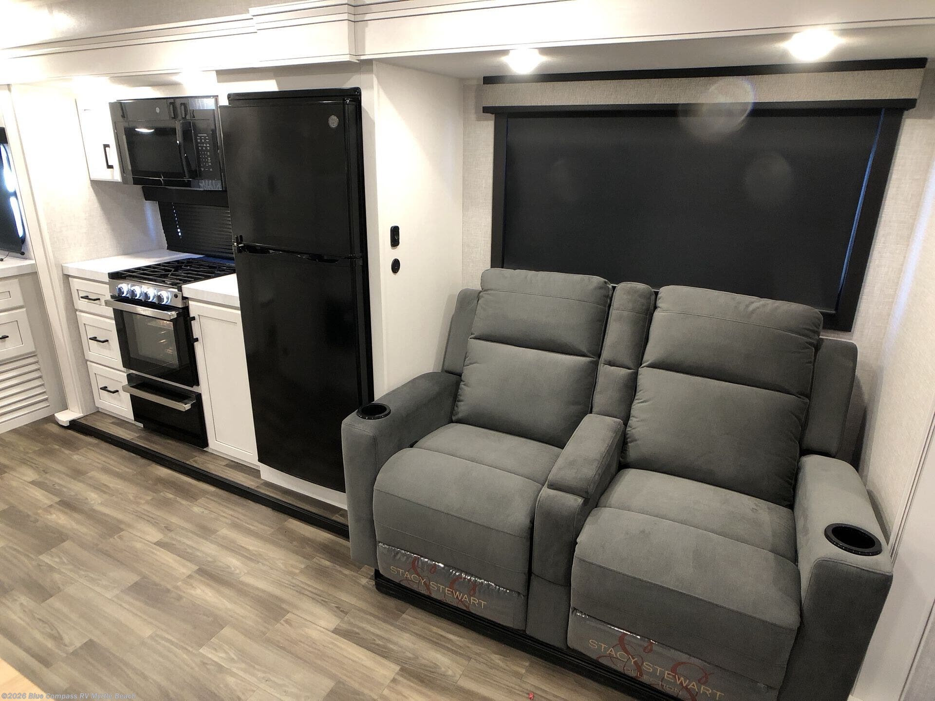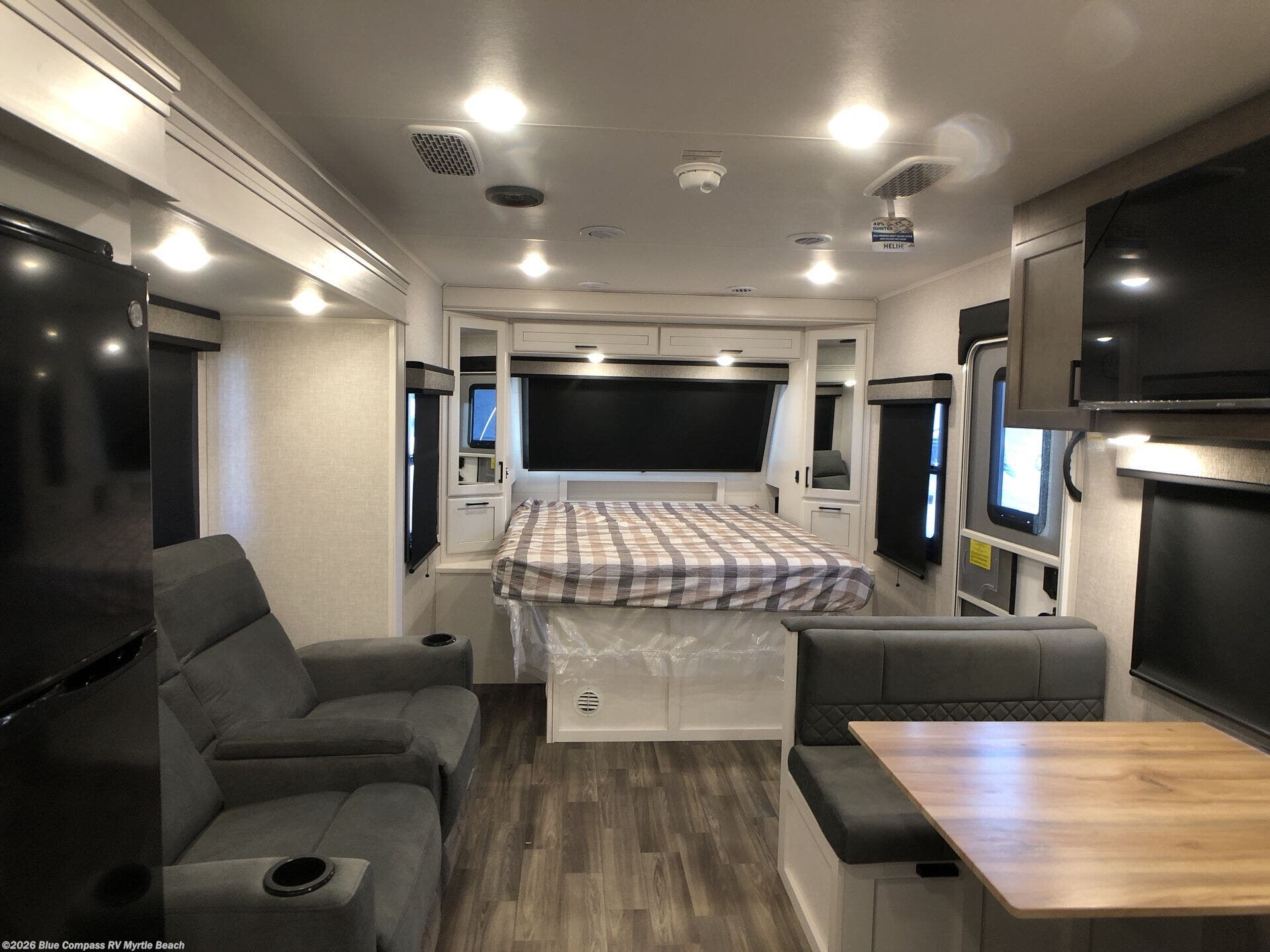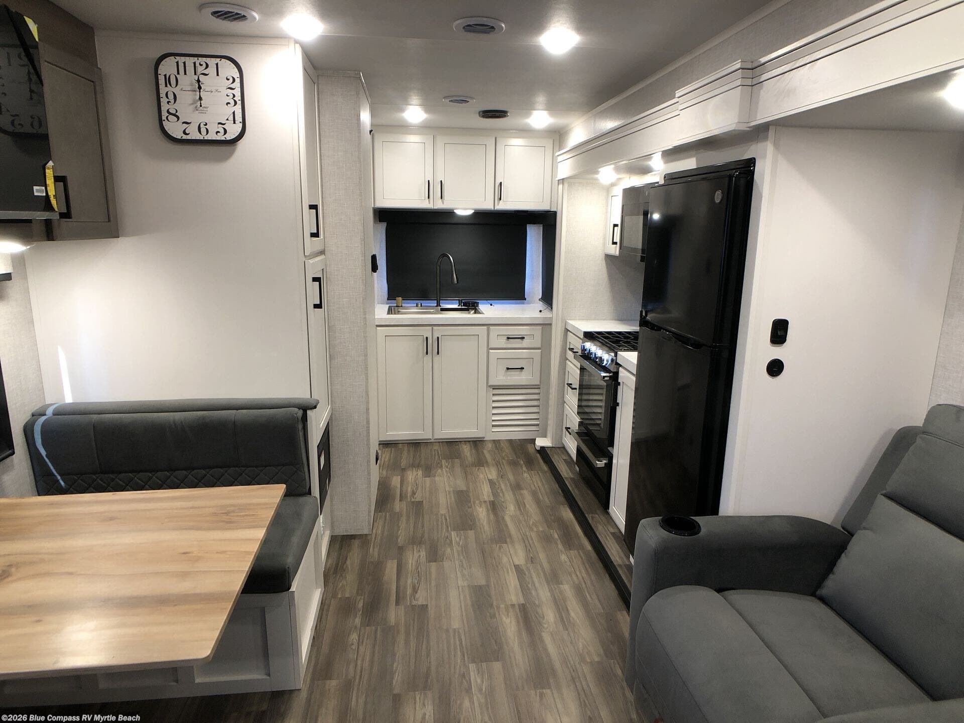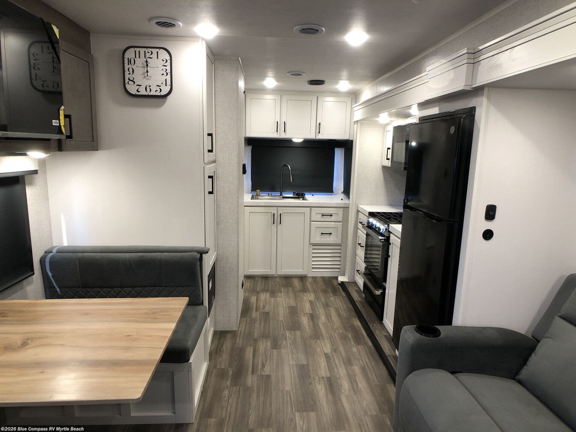 It will be so easy to enjoy camping trips when you're in this travel trailer! A full kitchen, complete with a three burner cooktop, over-the-range microwave, and 10 cu. ft. 12V refrigerator will let you cook and store meals, and the booth dinette provides a place to dine. Within the large slide, you'll find the 60" theater sofa with cup holders which is across from the 40" 4K Ultra LED HD Smart TV! You'll love having a 66" x 80" Olympic queen bed to sleep on, and there are dual wardrobes to keep your clothes organized. And larger camp gear can go outside in the pass-thru storage!