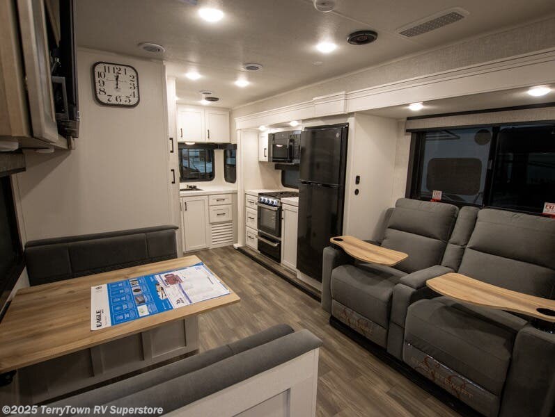 With any Eagle HT fifth wheel or travel trailer by Jayco you will enjoy a smooth drive thanks to the 4 Star Handling Package, Goodyear Endurance tires, and MORryde CRE-3000 rubberized suspension. The Customer Value Package includes amenities that are sure to make camping easier than ever, like the 60K on-demand water heater, Keyed-Alike lock system, 15,000 BTU "Whisper Quiet" A/C, and more. Handcrafted and glazed door/drawer fronts will make your space feel more like home, along with residential vinyl flooring throughout, GE appliances, and blackout roller shades with reflective side throughout to keep the sun out when you want to sleep in. Each model also includes a NuVo H2O water treatment system with filters included, interior and exterior "Blue Sync" audio connect with MB Quart Sound for your TV and phone, and 100% no floor vents for added comfort and convenience!