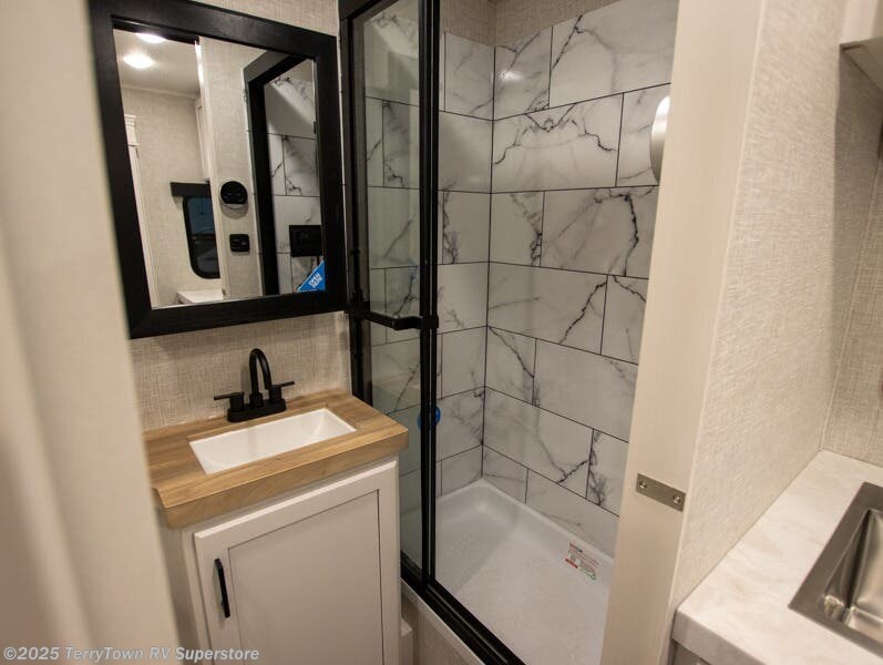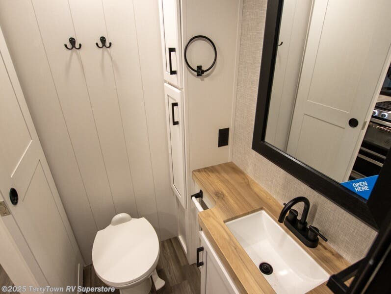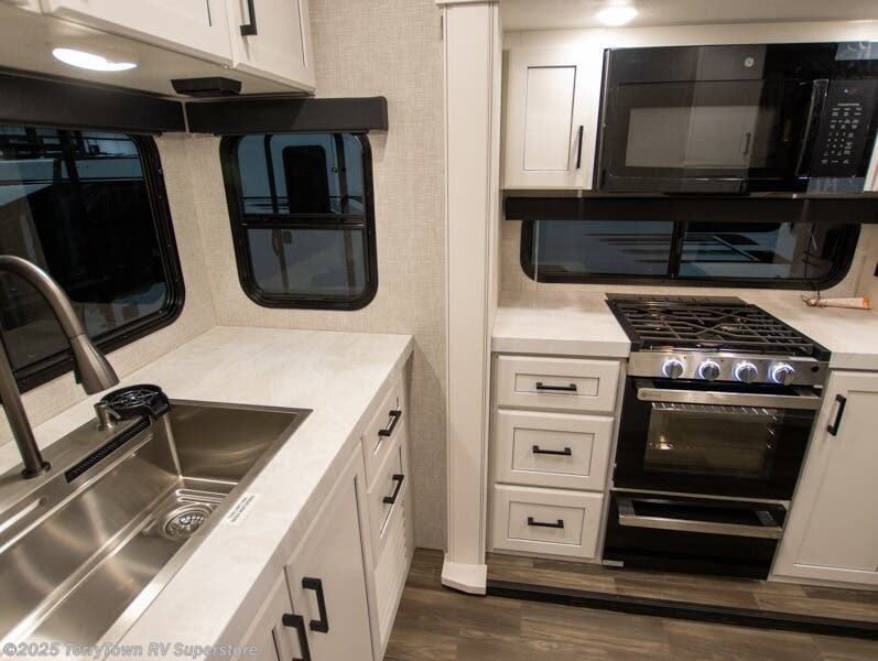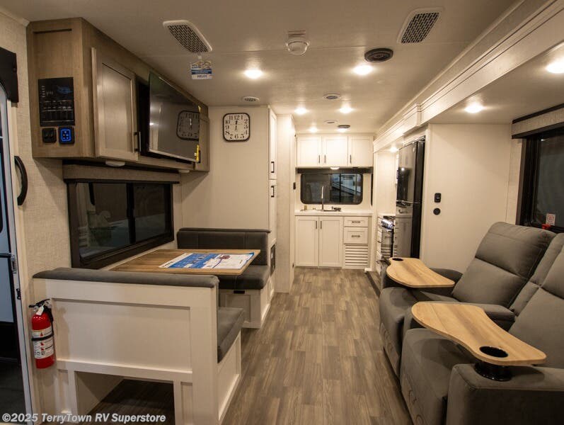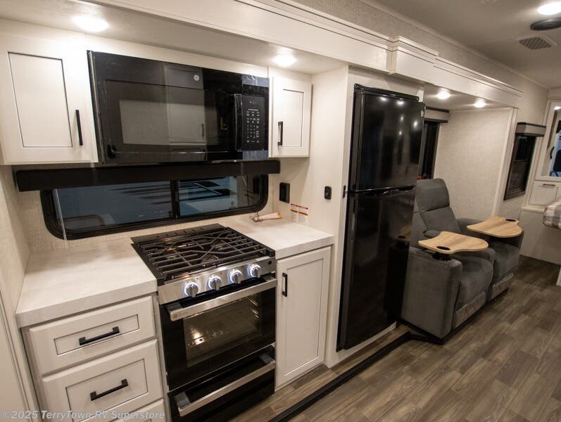 It will be so easy to enjoy camping trips when you're in this travel trailer! A full kitchen, complete with a three burner cooktop, over-the-range microwave, and 10 cu. ft. 12V refrigerator will let you cook and store meals, and the booth dinette provides a place to dine. Within the large slide, you'll find the 60" theater sofa with cup holders which is across from the 40" 4K Ultra LED HD Smart TV! You'll love having a 66" x 80" Olympic queen bed to sleep on, and there are dual wardrobes to keep your clothes organized. And larger camp gear can go outside in the pass-thru storage!