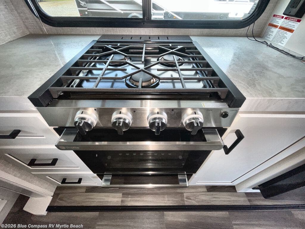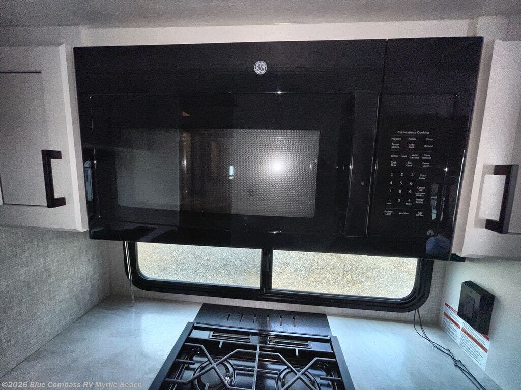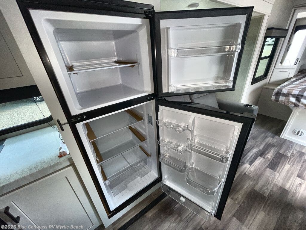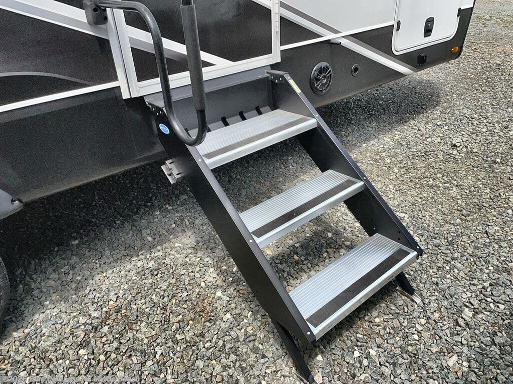 It will be so easy to enjoy camping trips when you're in this travel trailer! A full kitchen, complete with a three burner cooktop, over-the-range microwave, and 10 cu. ft. 12V refrigerator will let you cook and store meals, and the booth dinette provides a place to dine. Within the large slide, you'll find the 60" theater sofa with cup holders which is across from the 40" 4K Ultra LED HD Smart TV! You'll love having a 66" x 80" Olympic queen bed to sleep on, and there are dual wardrobes to keep your clothes organized. And larger camp gear can go outside in the pass-thru storage!