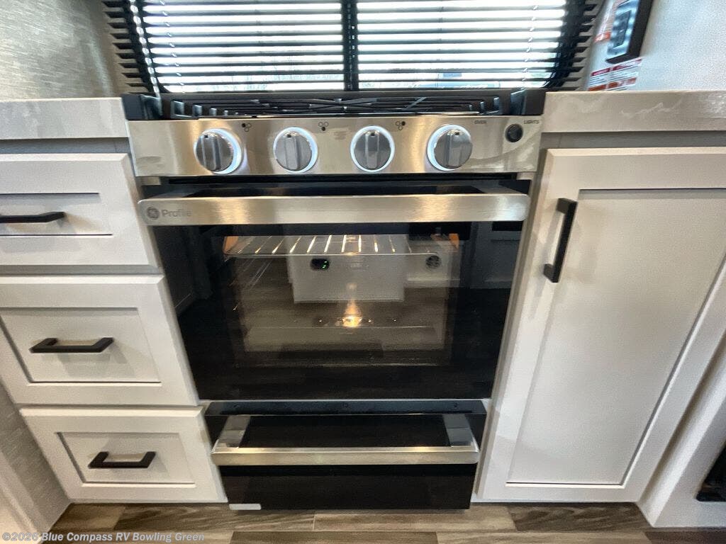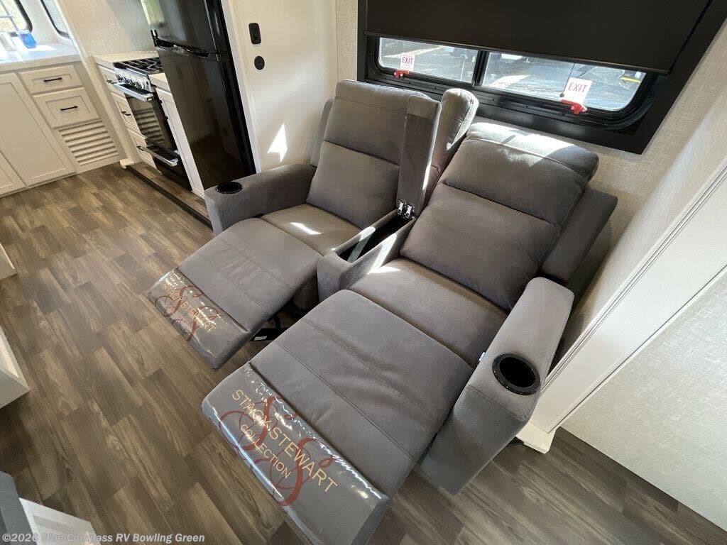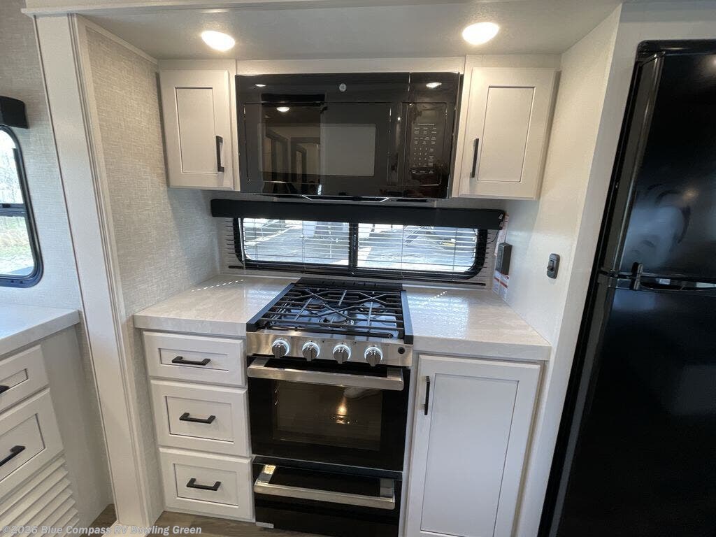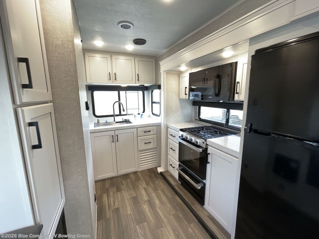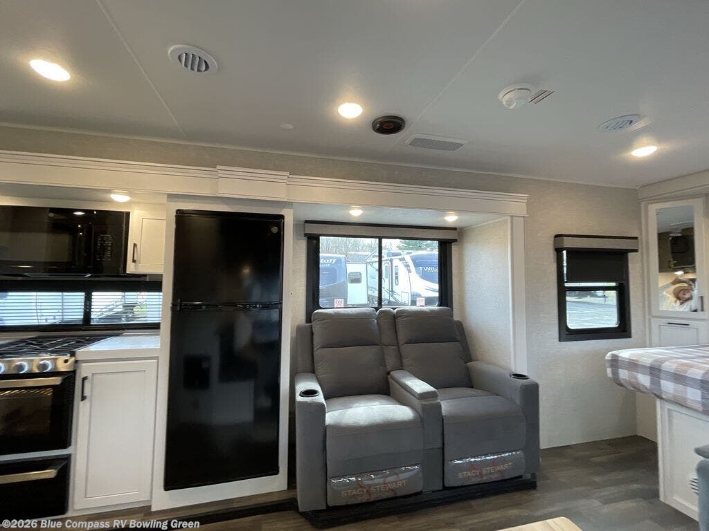 It will be so easy to enjoy camping trips when you're in this travel trailer! A full kitchen, complete with a three burner cooktop, over-the-range microwave, and 10 cu. ft. 12V refrigerator will let you cook and store meals, and the booth dinette provides a place to dine. Within the large slide, you'll find the 60" theater sofa with cup holders which is across from the 40" 4K Ultra LED HD Smart TV! You'll love having a 66" x 80" Olympic queen bed to sleep on, and there are dual wardrobes to keep your clothes organized. And larger camp gear can go outside in the pass-thru storage!