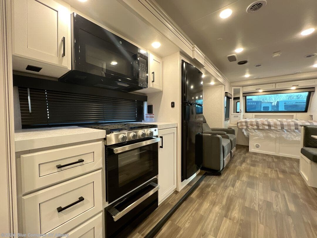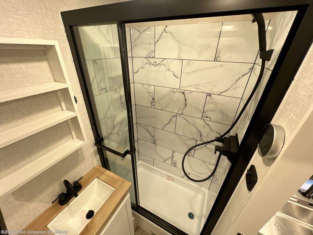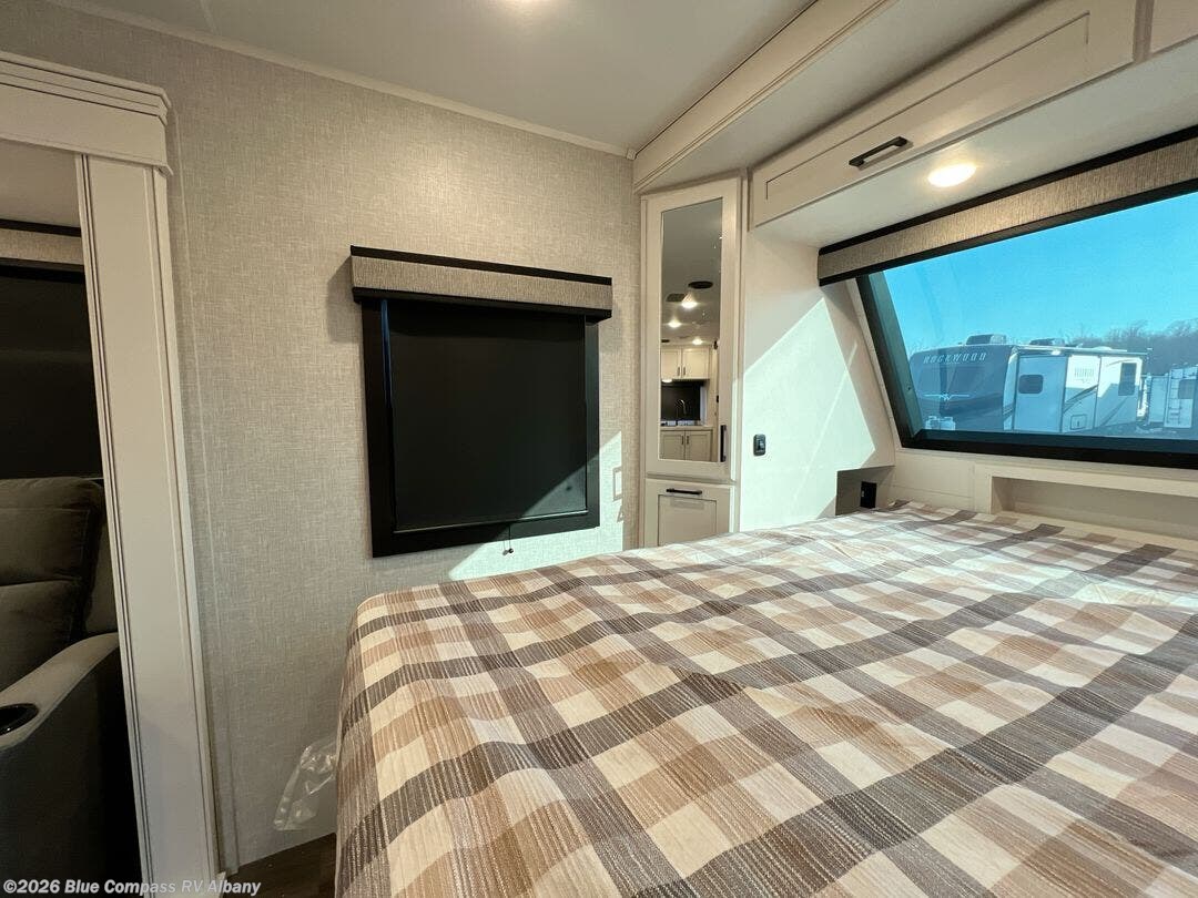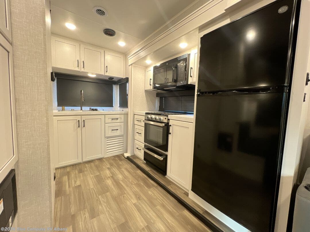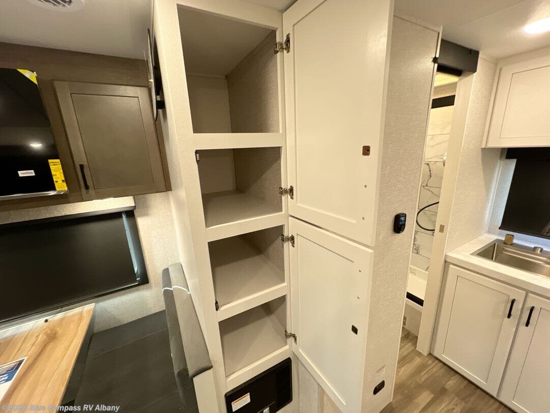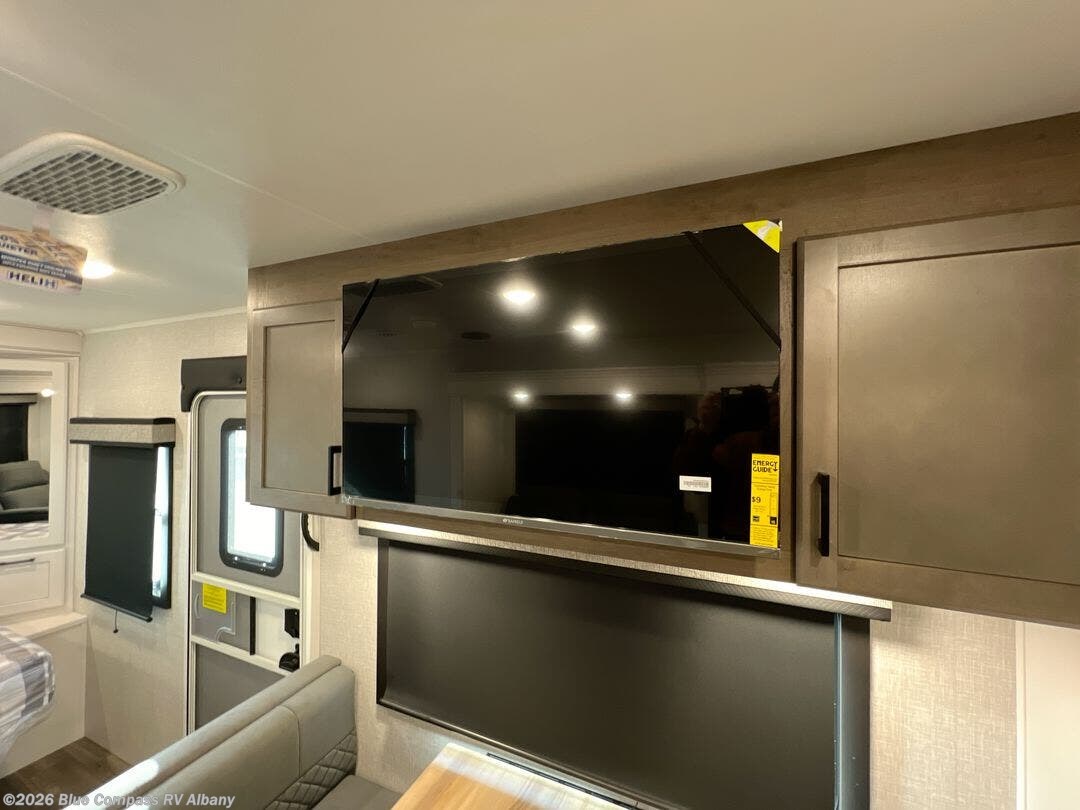 It will be so easy to enjoy camping trips when you're in this travel trailer! A full kitchen, complete with a three burner cooktop, over-the-range microwave, and 10 cu. ft. 12V refrigerator will let you cook and store meals, and the booth dinette provides a place to dine. Within the large slide, you'll find the 60" theater sofa with cup holders which is across from the 40" 4K Ultra LED HD Smart TV! You'll love having a 66" x 80" Olympic queen bed to sleep on, and there are dual wardrobes to keep your clothes organized. And larger camp gear can go outside in the pass-thru storage!
