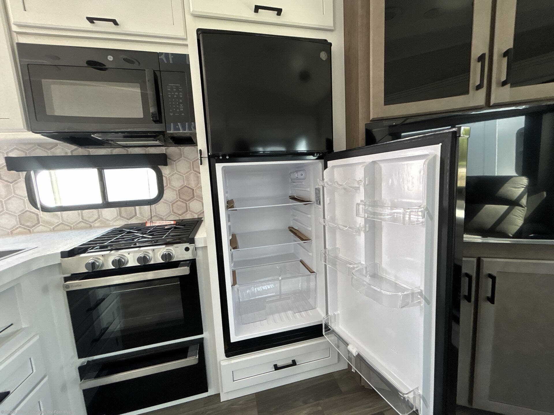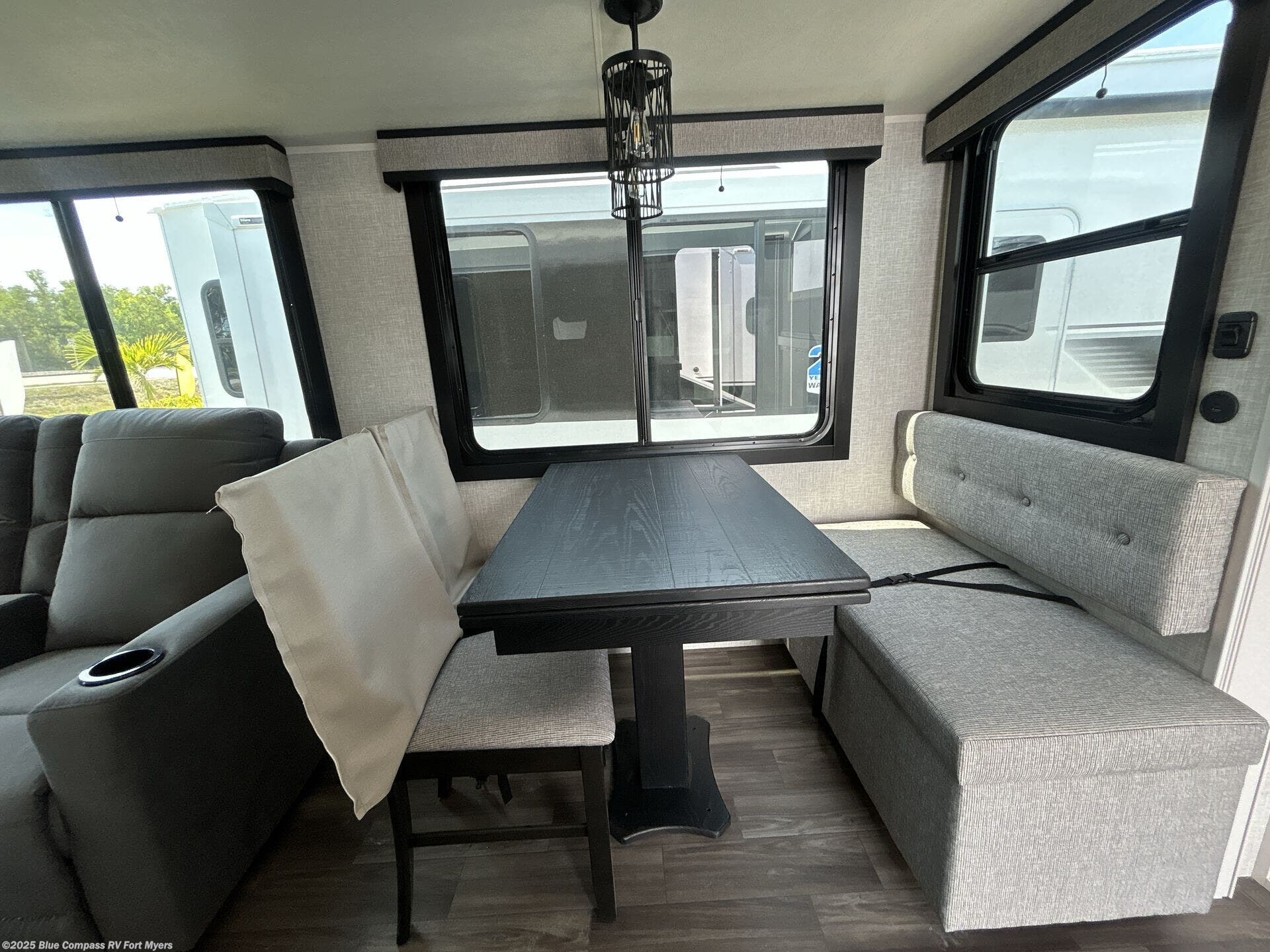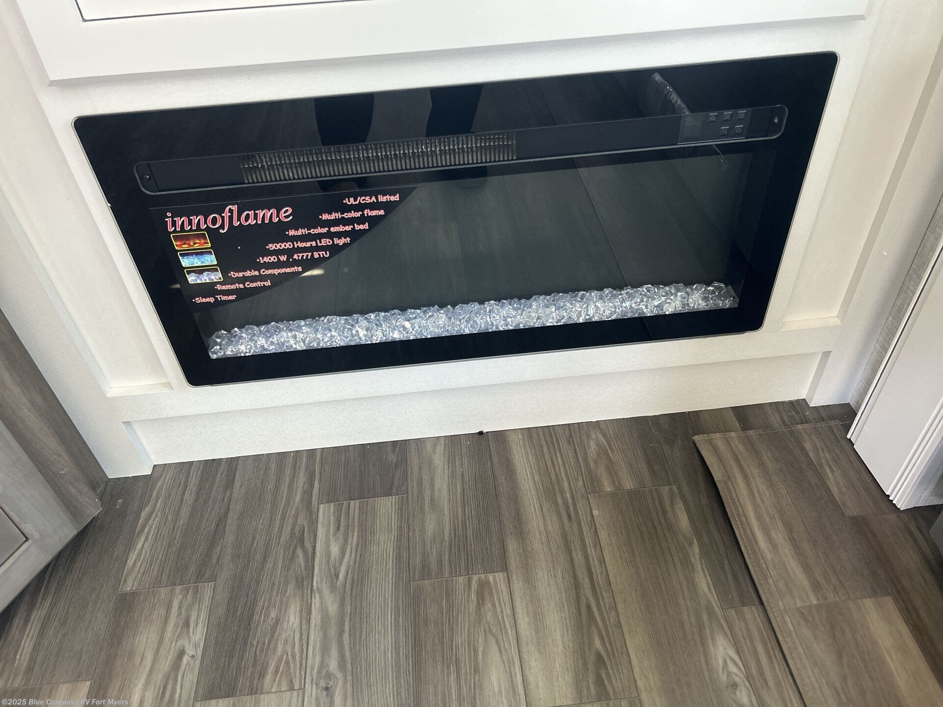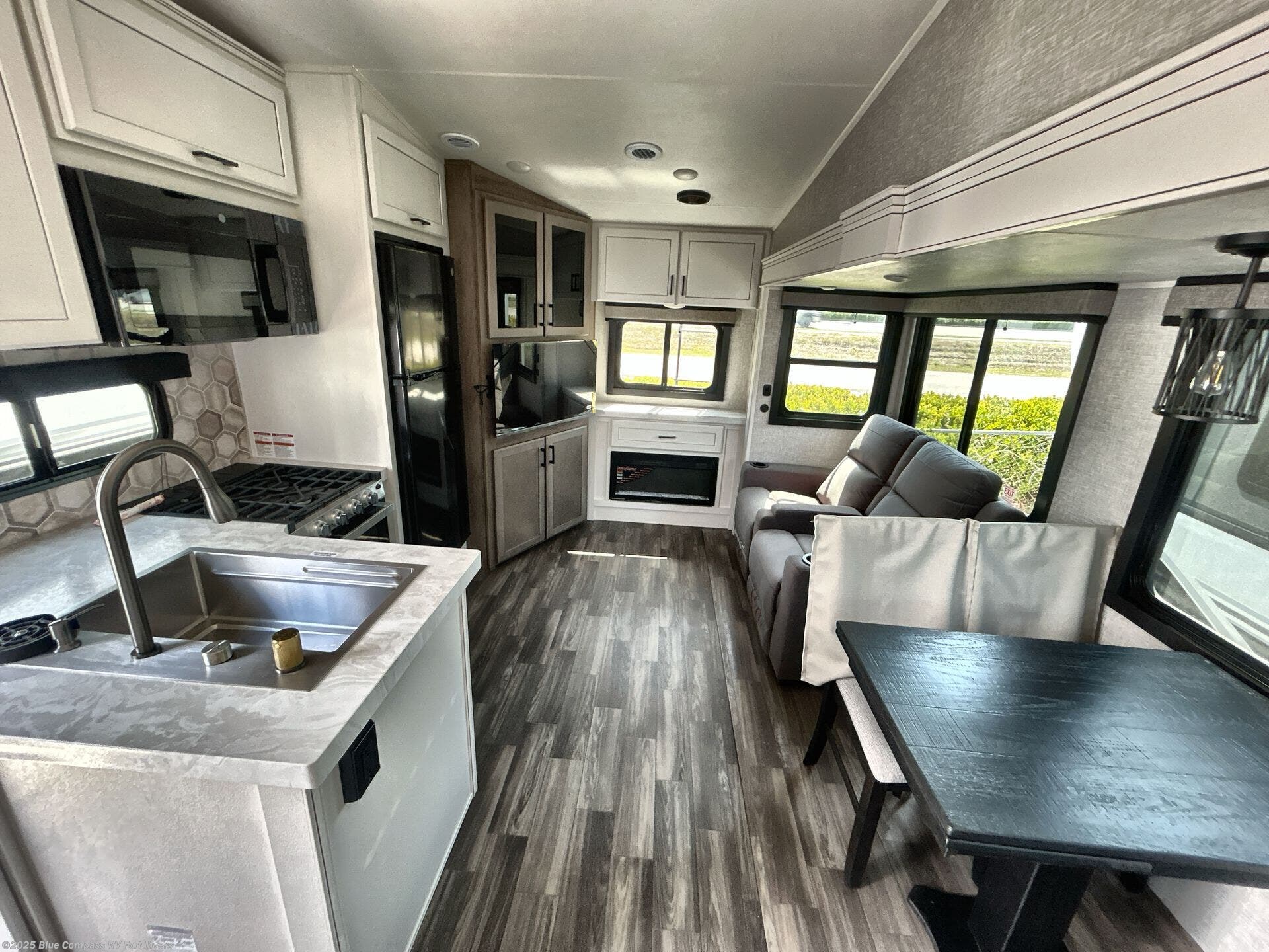 This is the perfect couple's fifth wheel since it features sleeping space for two up front! You can use the dual bedroom wardrobes to store your clothes in, and the full bath is close by so you can get ready each morning. After you've whipped up breakfast in the kitchen, you can dine at the table and chairs with bench seating, then relax with your coffee on the theater seat. There is an entertainment center across from the sofa for convenience, plus a hidden walk-in pantry behind the TV. You might even like to add the fireplace option to make it feel more like home!