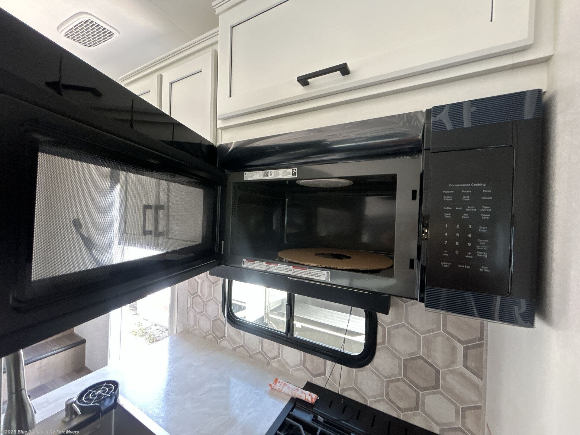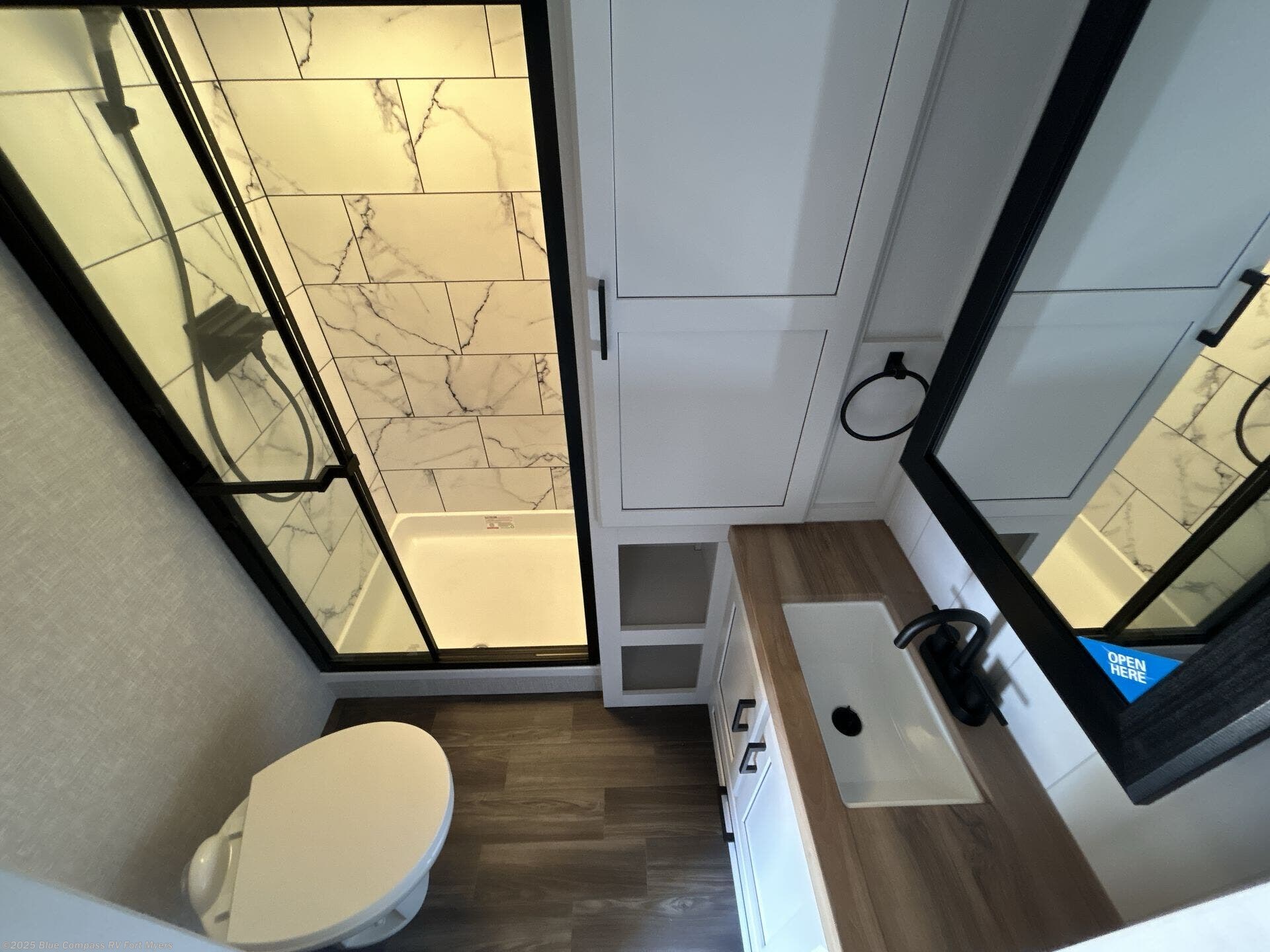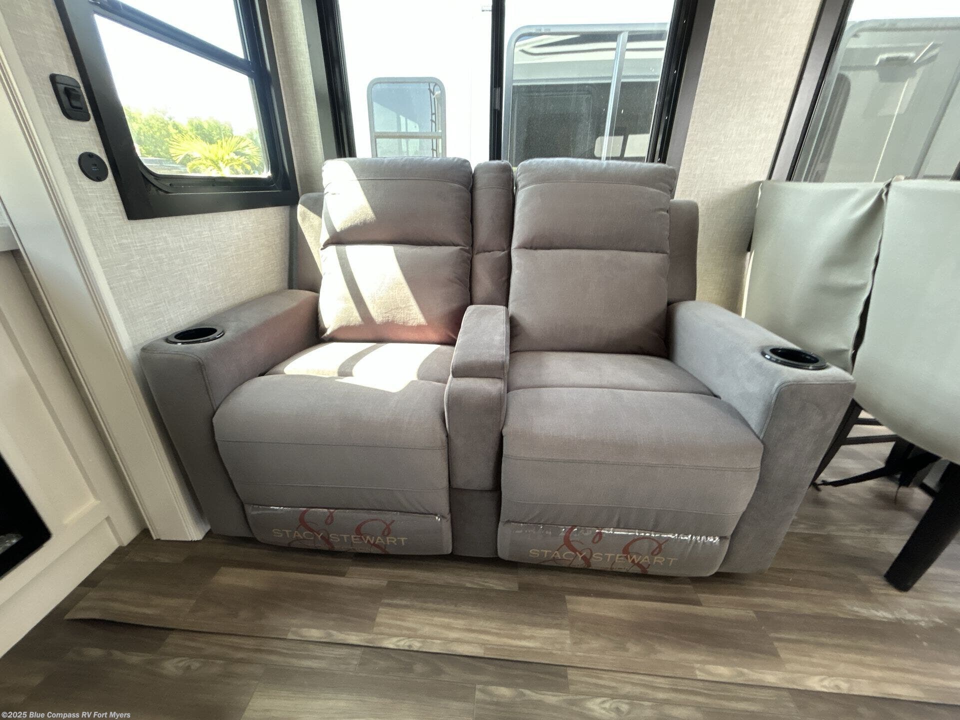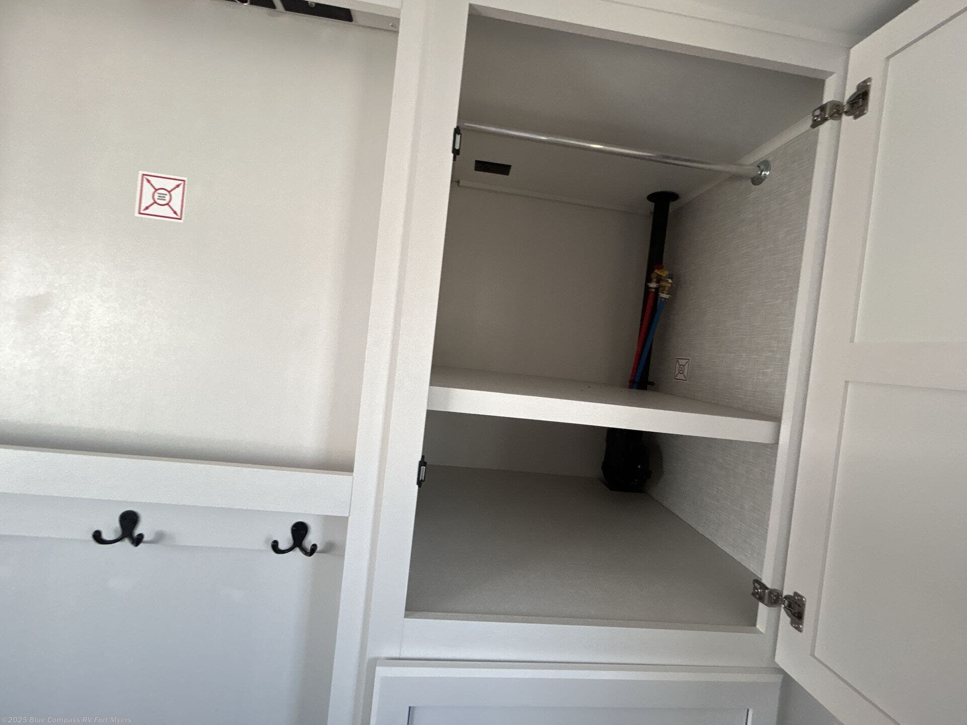 This is the perfect couple's fifth wheel since it features sleeping space for two up front! You can use the dual bedroom wardrobes to store your clothes in, and the full bath is close by so you can get ready each morning. After you've whipped up breakfast in the kitchen, you can dine at the table and chairs with bench seating, then relax with your coffee on the theater seat. There is an entertainment center across from the sofa for convenience, plus a hidden walk-in pantry behind the TV. You might even like to add the fireplace option to make it feel more like home!