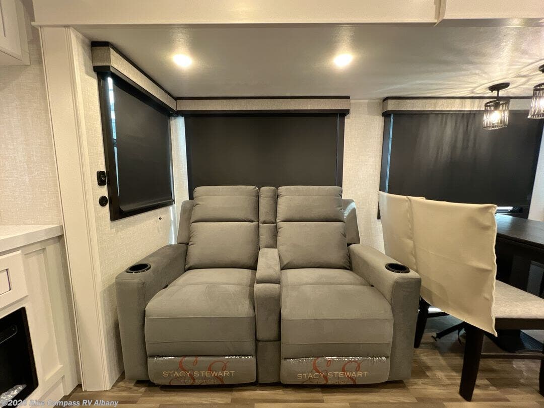 This is the perfect couple's fifth wheel since it features sleeping space for two up front! You can use the dual bedroom wardrobes to store your clothes in, and the full bath is close by so you can get ready each morning. After you've whipped up breakfast in the kitchen, you can dine at the table and chairs with bench seating, then relax with your coffee on the theater seat. There is an entertainment center across from the sofa for convenience, plus a hidden walk-in pantry behind the TV. You might even like to add the fireplace option to make it feel more like home!