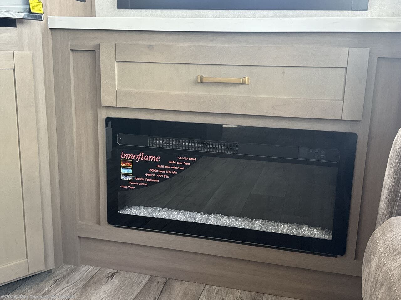 This is the perfect couple's fifth wheel since it features sleeping space for two up front! You can use the dual bedroom wardrobes to store your clothes in, and the full bath is close by so you can get ready each morning. After you've whipped up breakfast in the kitchen, you can dine at the table and chairs with bench seating, then relax with your coffee on the theater seat. There is an entertainment center across from the sofa for convenience, plus a hidden walk-in pantry behind the TV. You might even like to add the fireplace option to make it feel more like home!