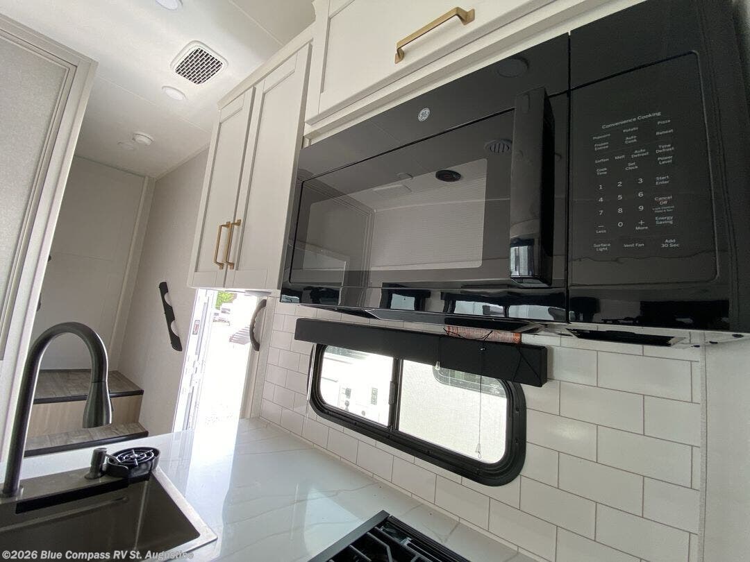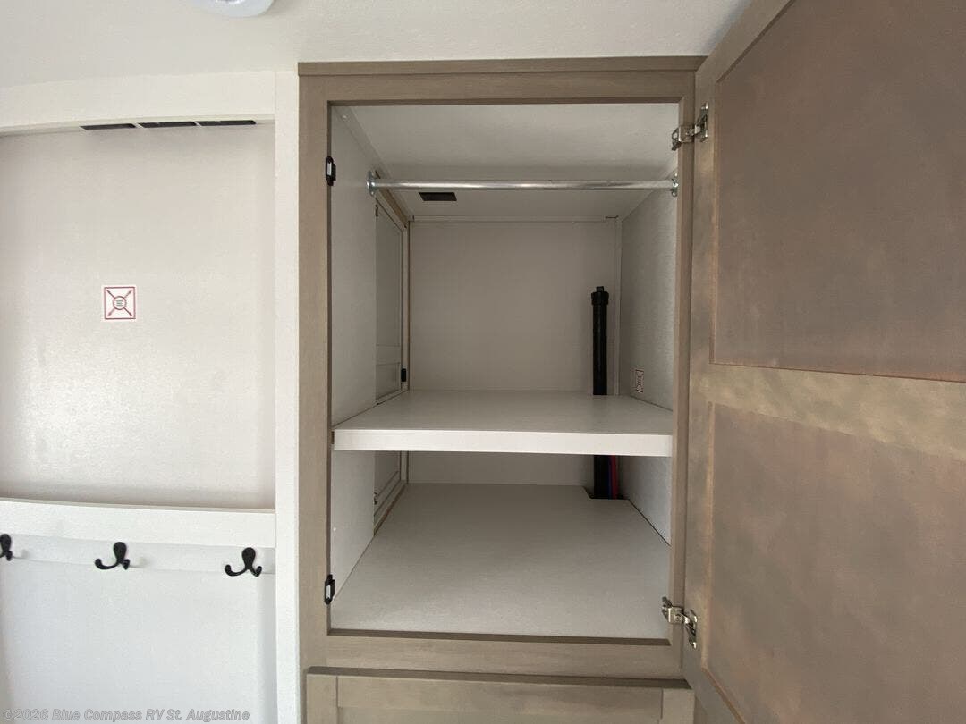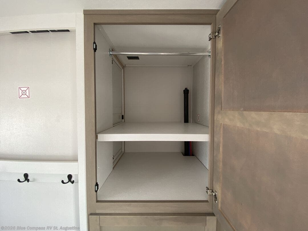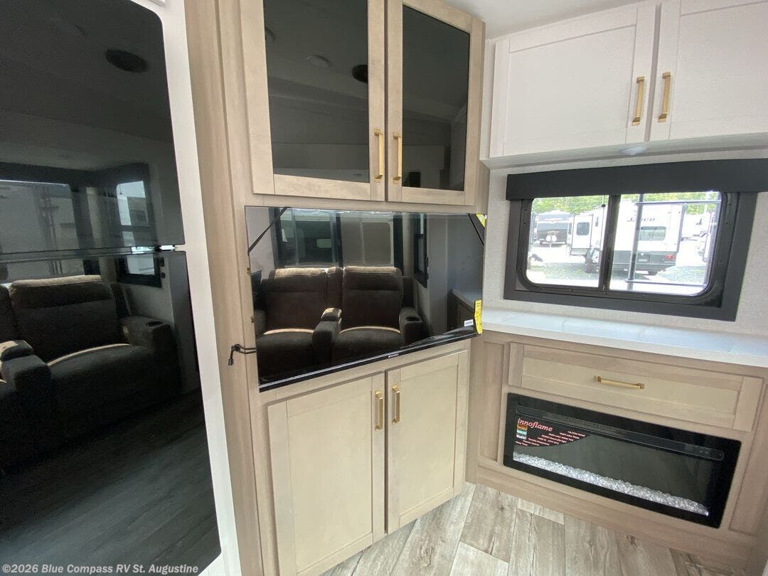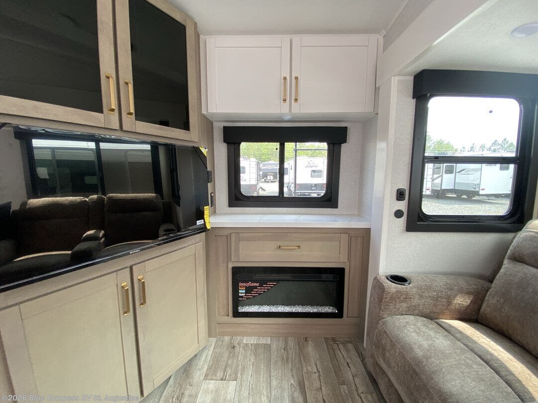 This is the perfect couple's fifth wheel since it features sleeping space for two up front! You can use the dual bedroom wardrobes to store your clothes in, and the full bath is close by so you can get ready each morning. After you've whipped up breakfast in the kitchen, you can dine at the table and chairs with bench seating, then relax with your coffee on the theater seat. There is an entertainment center across from the sofa for convenience, plus a hidden walk-in pantry behind the TV. You might even like to add the fireplace option to make it feel more like home!