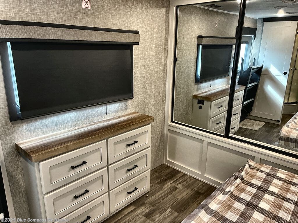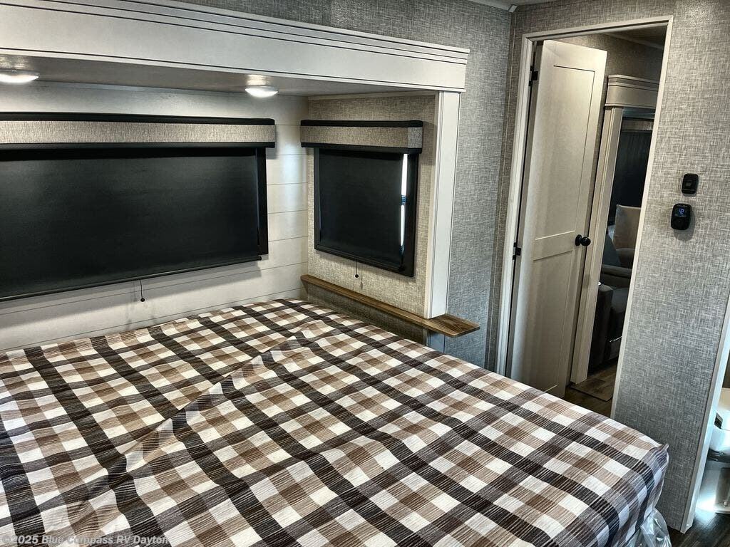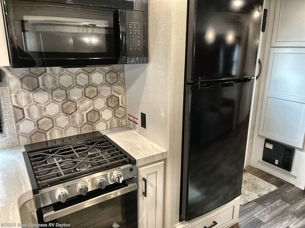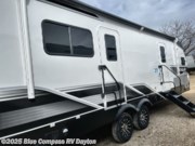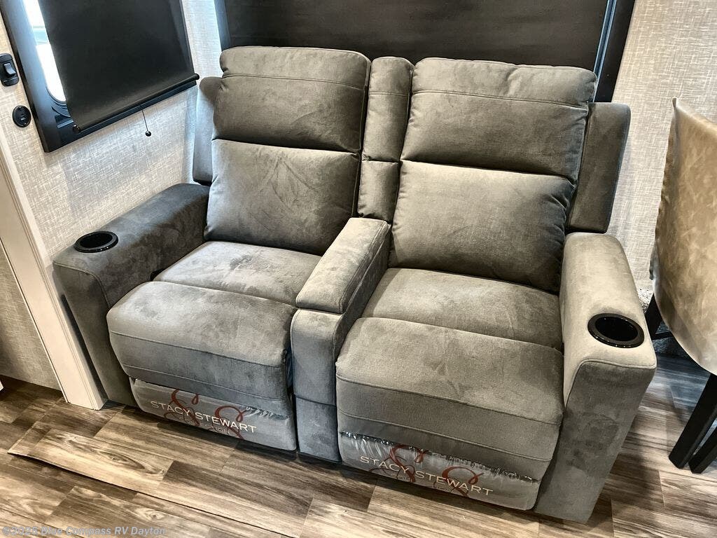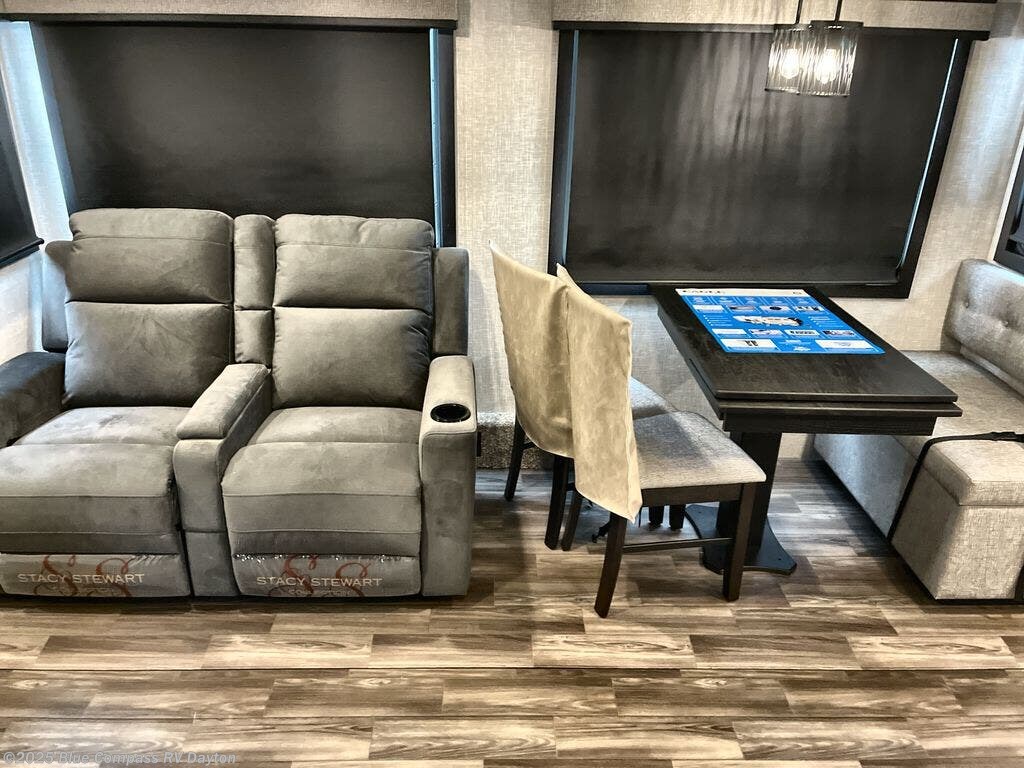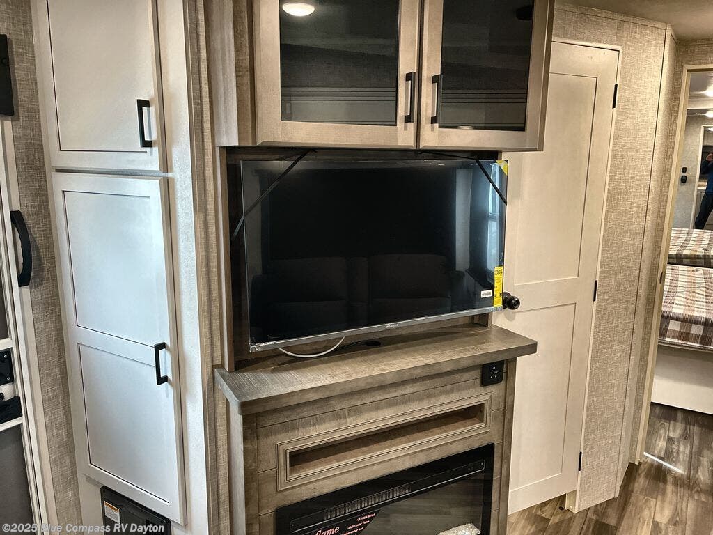 Escape the busyness of life for tranquil trips to the campground with this trailer. You will love the front kitchen with generous counter space, GE appliances, and a pantry by the entryway that can be used for food and more. If you're all hiked out, stay inside to relax on the theater seat across from the fireplace and entertainment center. There is also a free-standing table to dine at or play a game of cards. The dual entry bath will create a rear master suite, complete with a 66" x 80" Olympic queen bed across from a dresser, a private exit door, plus a full-width wardrobe with washer and dryer prep!