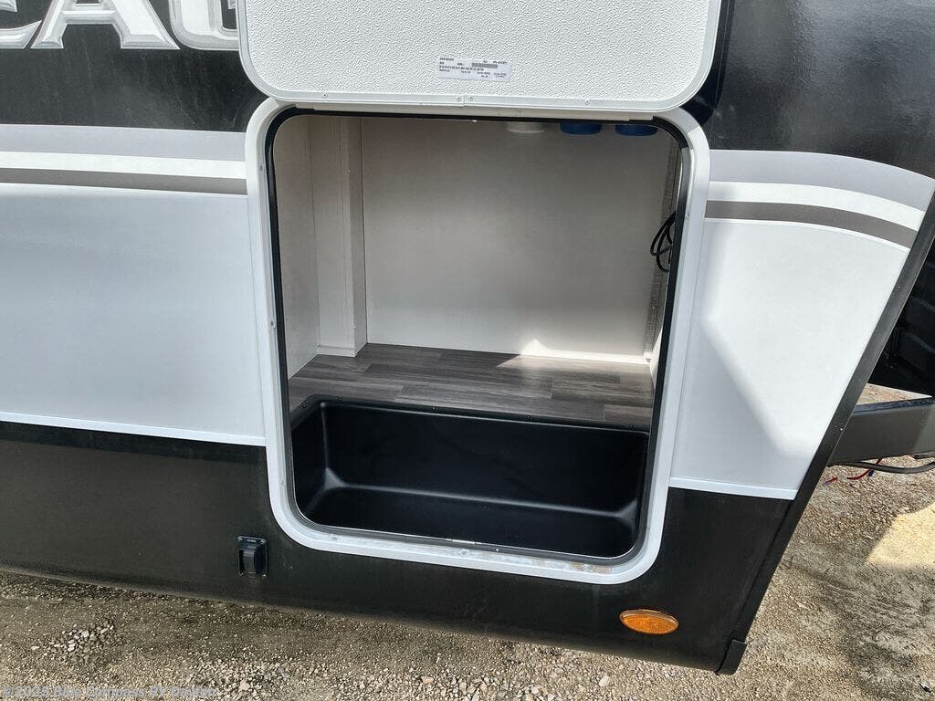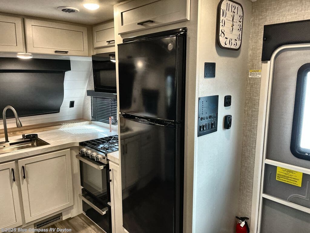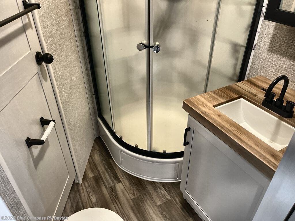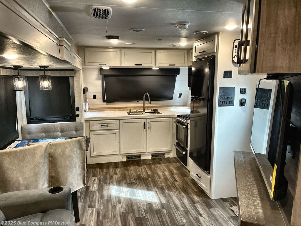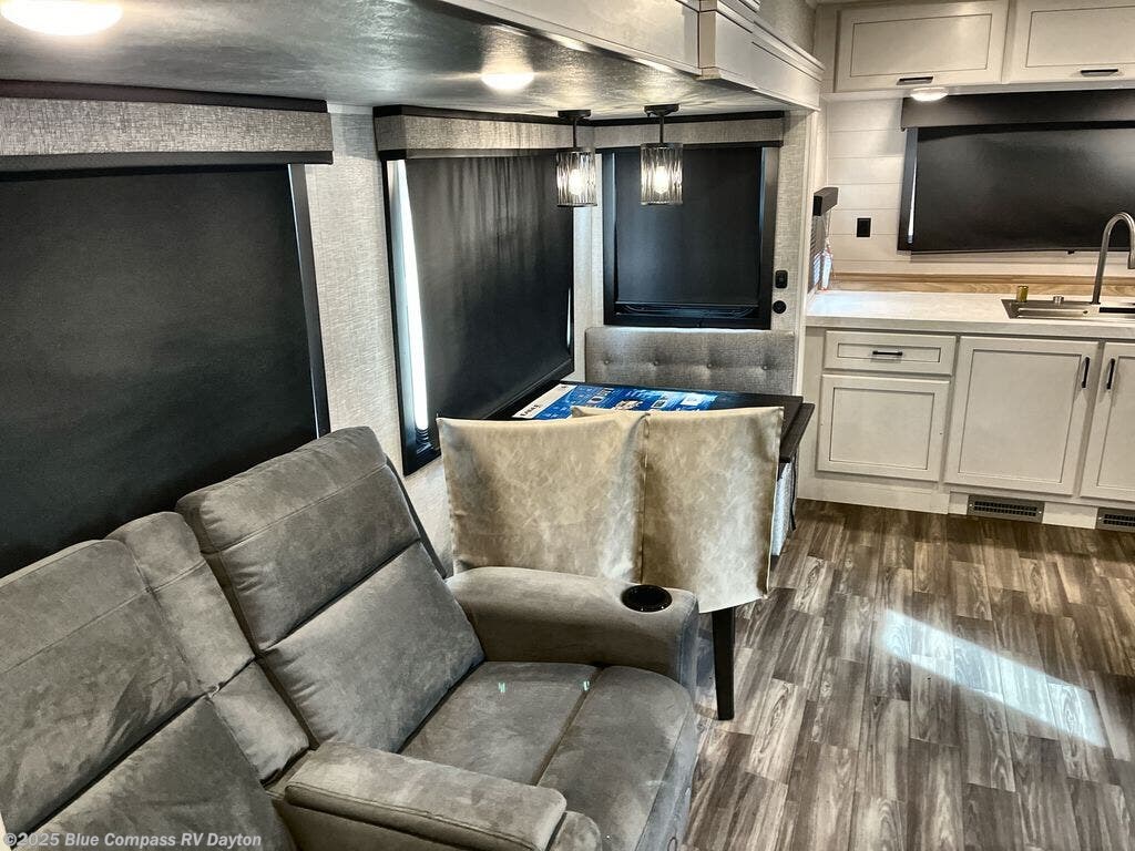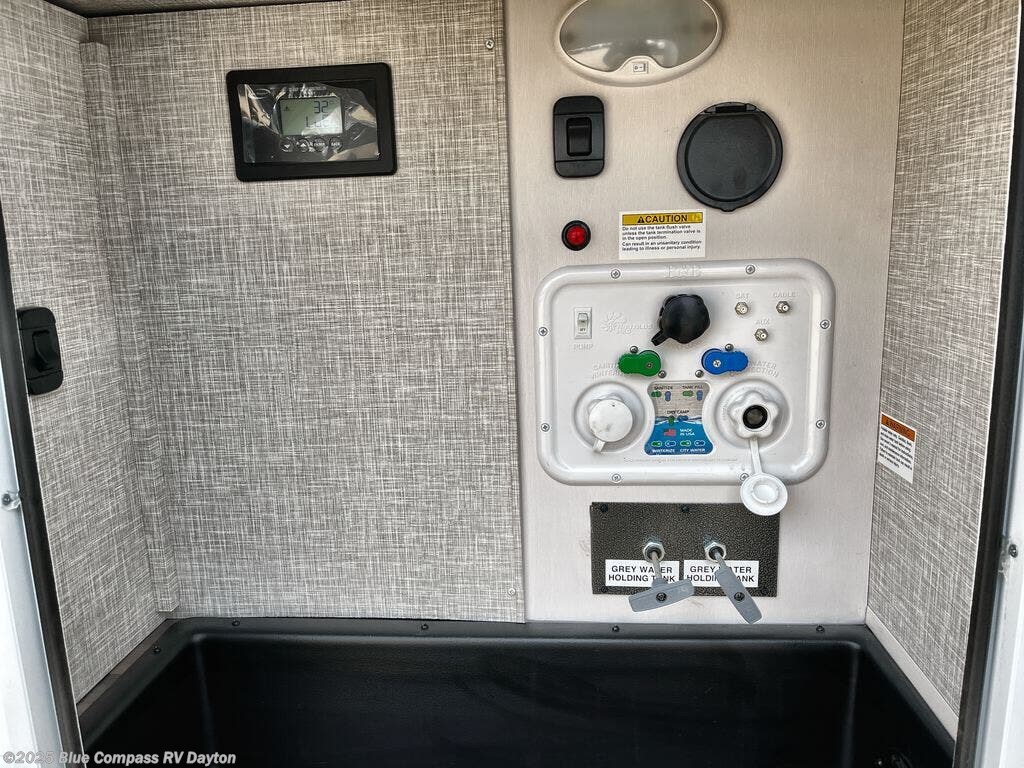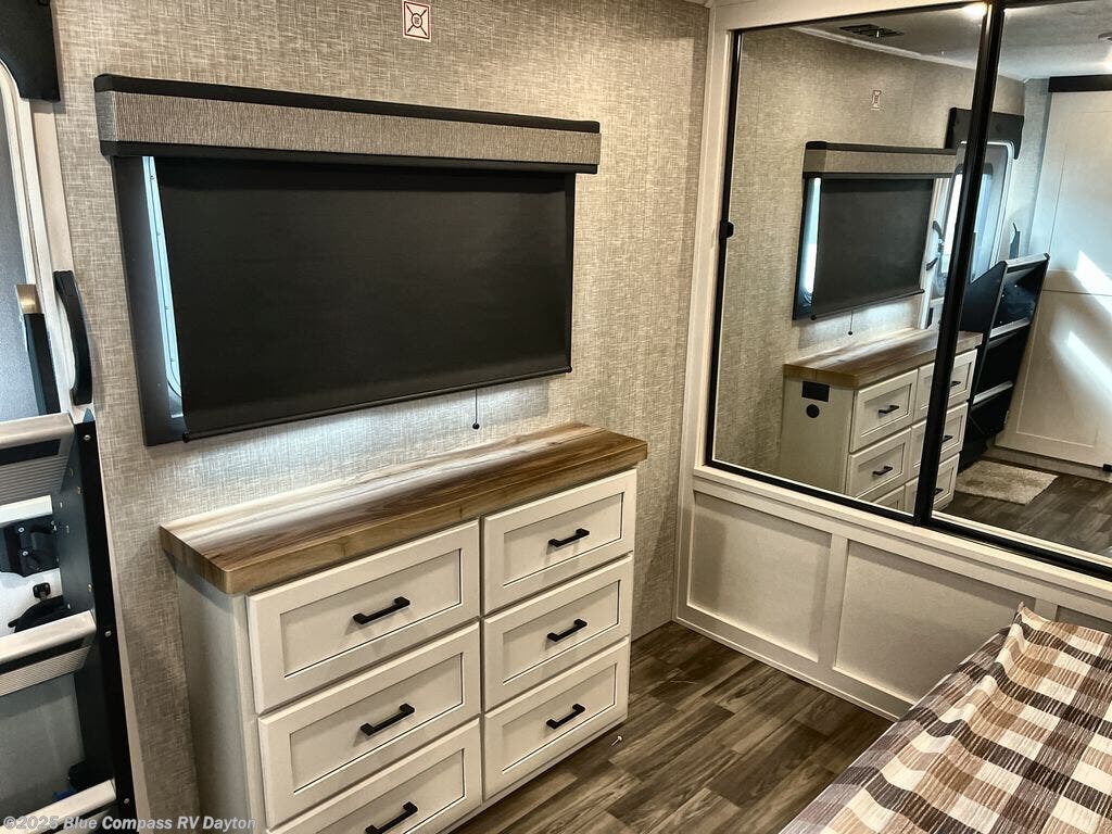 Escape the busyness of life for tranquil trips to the campground with this trailer. You will love the front kitchen with generous counter space, GE appliances, and a pantry by the entryway that can be used for food and more. If you're all hiked out, stay inside to relax on the theater seat across from the fireplace and entertainment center. There is also a free-standing table to dine at or play a game of cards. The dual entry bath will create a rear master suite, complete with a 66" x 80" Olympic queen bed across from a dresser, a private exit door, plus a full-width wardrobe with washer and dryer prep!