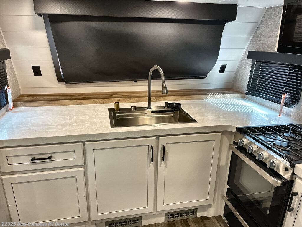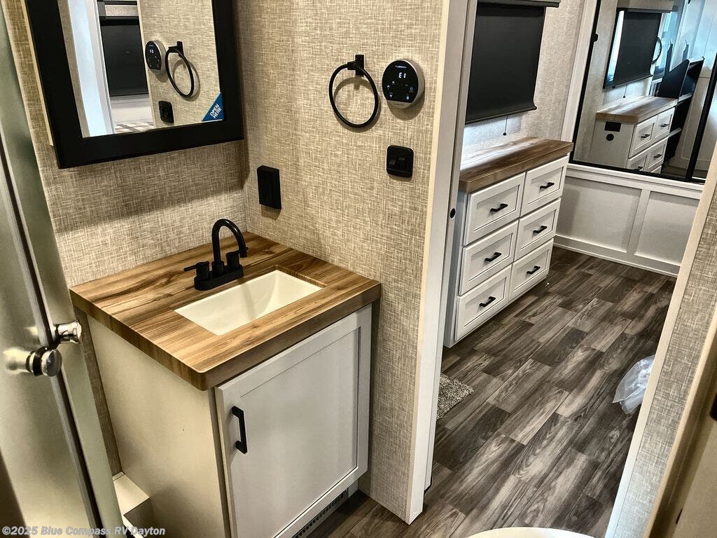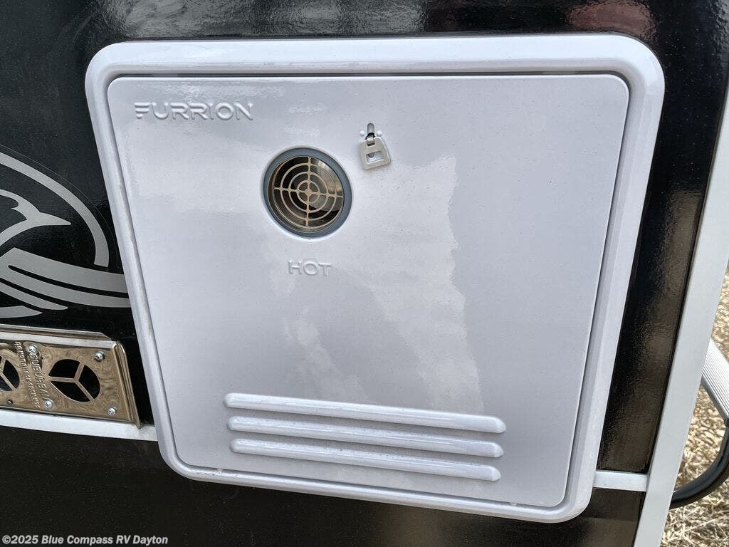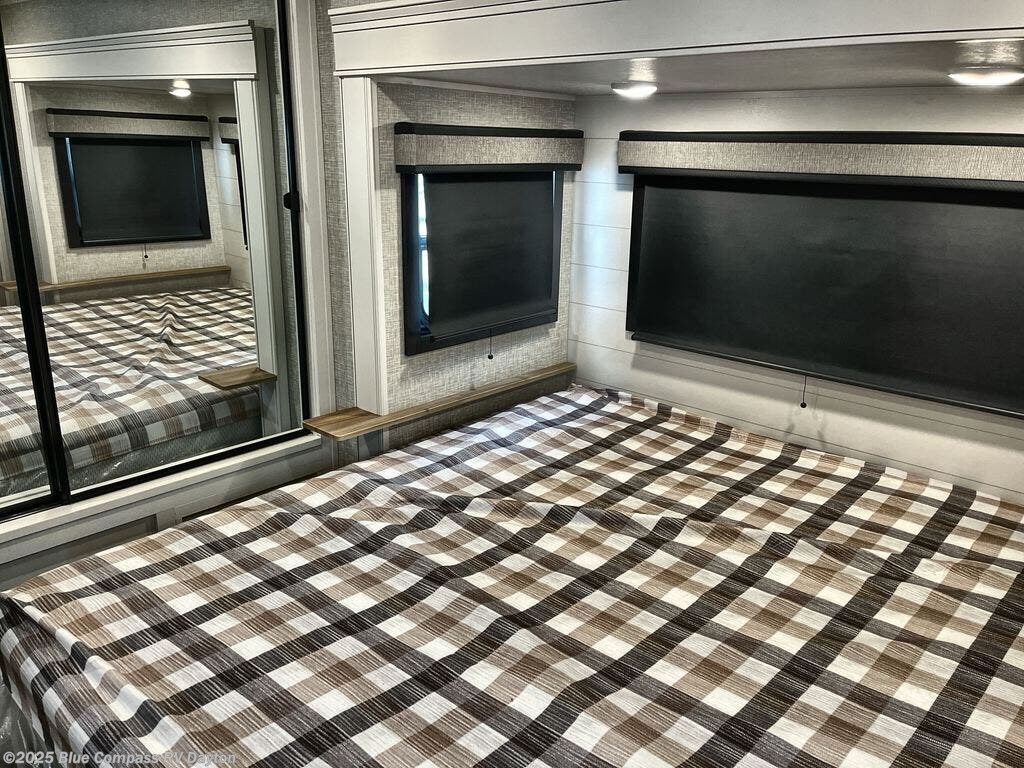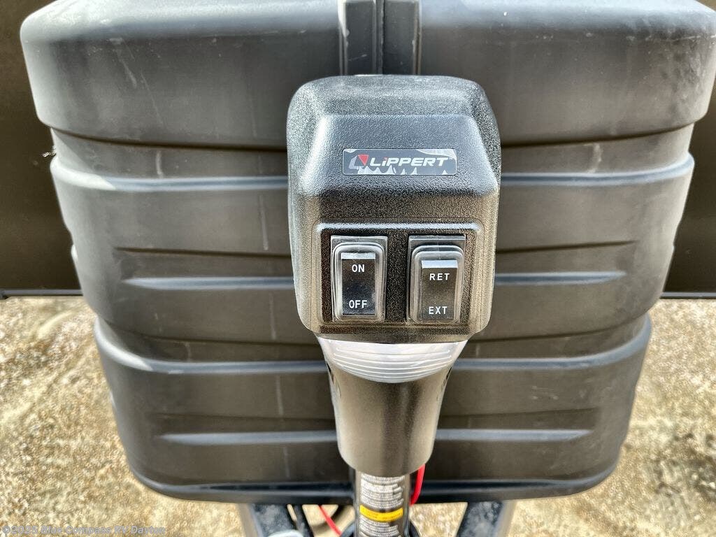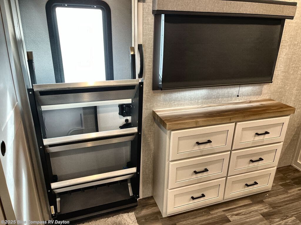 Escape the busyness of life for tranquil trips to the campground with this trailer. You will love the front kitchen with generous counter space, GE appliances, and a pantry by the entryway that can be used for food and more. If you're all hiked out, stay inside to relax on the theater seat across from the fireplace and entertainment center. There is also a free-standing table to dine at or play a game of cards. The dual entry bath will create a rear master suite, complete with a 66" x 80" Olympic queen bed across from a dresser, a private exit door, plus a full-width wardrobe with washer and dryer prep!