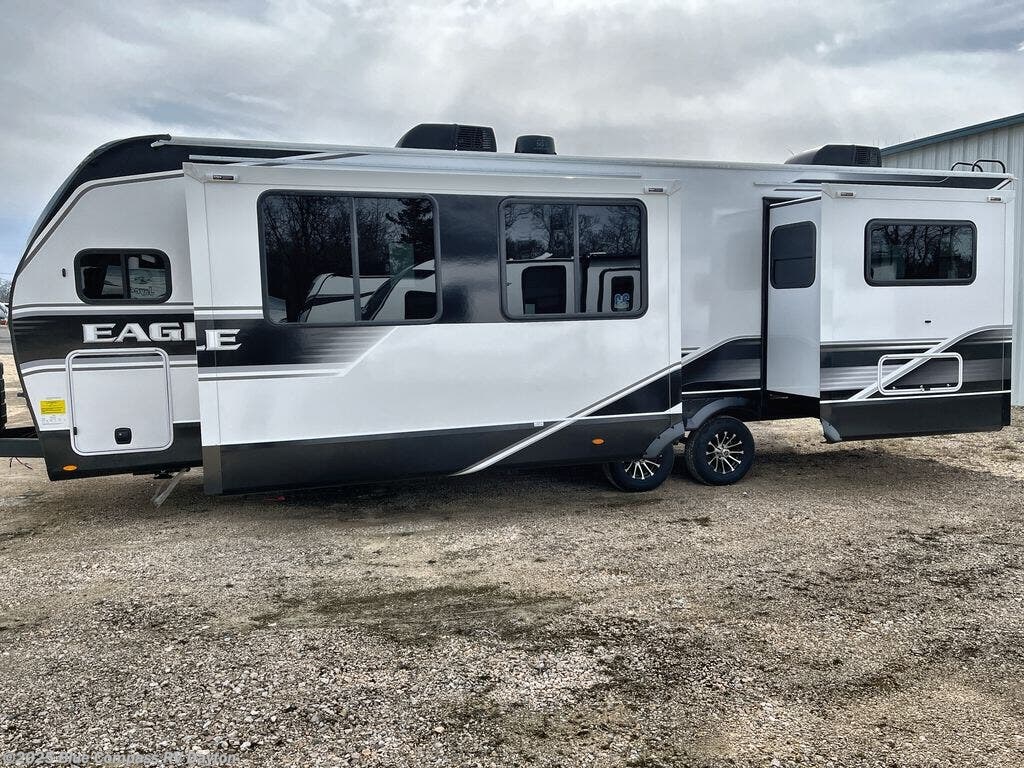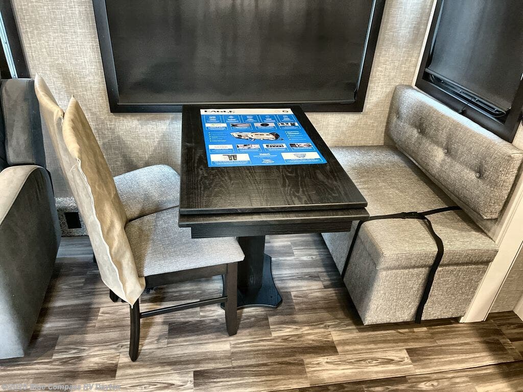 With any Eagle HT fifth wheel or travel trailer by Jayco you will enjoy a smooth drive thanks to the 4 Star Handling Package, Goodyear Endurance tires, and MORryde CRE-3000 rubberized suspension. The Customer Value Package includes amenities that are sure to make camping easier than ever, like the 60K on-demand water heater, Keyed-Alike lock system, 15,000 BTU "Whisper Quiet" A/C, and more. Handcrafted and glazed door/drawer fronts will make your space feel more like home, along with residential vinyl flooring throughout, GE appliances, and blackout roller shades with reflective side throughout to keep the sun out when you want to sleep in. Each model also includes a NuVo H2O water treatment system with filters included, interior and exterior "Blue Sync" audio connect with MB Quart Sound for your TV and phone, and 100% no floor vents for added comfort and convenience!