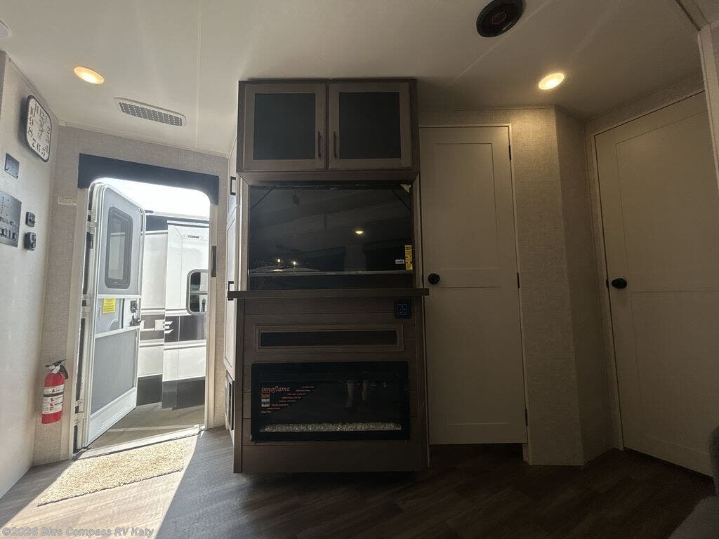 Escape the busyness of life for tranquil trips to the campground with this trailer. You will love the front kitchen with generous counter space, GE appliances, and a pantry by the entryway that can be used for food and more. If you're all hiked out, stay inside to relax on the theater seat across from the fireplace and entertainment center. There is also a free-standing table to dine at or play a game of cards. The dual entry bath will create a rear master suite, complete with a 66" x 80" Olympic queen bed across from a dresser, a private exit door, plus a full-width wardrobe with washer and dryer prep!