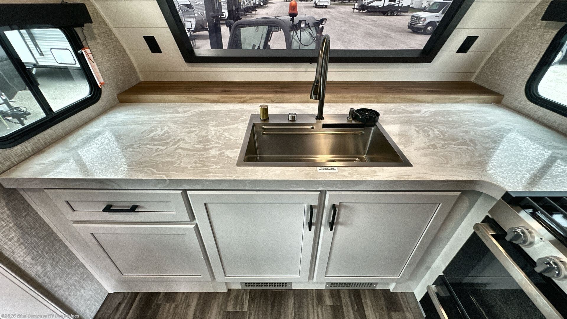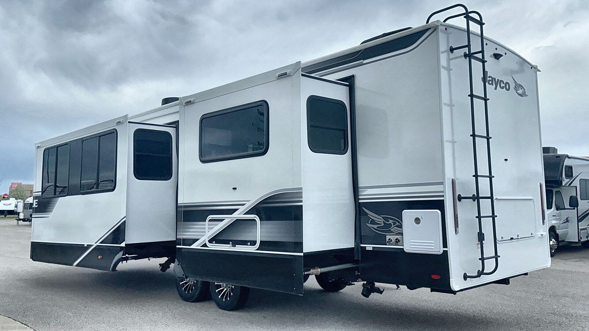 With any Eagle HT fifth wheel or travel trailer by Jayco you will enjoy a smooth drive thanks to the 4 Star Handling Package, Goodyear Endurance tires, and MORryde CRE-3000 rubberized suspension. The Customer Value Package includes amenities that are sure to make camping easier than ever, like the 60K on-demand water heater, Keyed-Alike lock system, 15,000 BTU "Whisper Quiet" A/C, and more. Handcrafted and glazed door/drawer fronts will make your space feel more like home, along with residential vinyl flooring throughout, GE appliances, and blackout roller shades with reflective side throughout to keep the sun out when you want to sleep in. Each model also includes a NuVo H2O water treatment system with filters included, interior and exterior "Blue Sync" audio connect with MB Quart Sound for your TV and phone, and 100% no floor vents for added comfort and convenience!