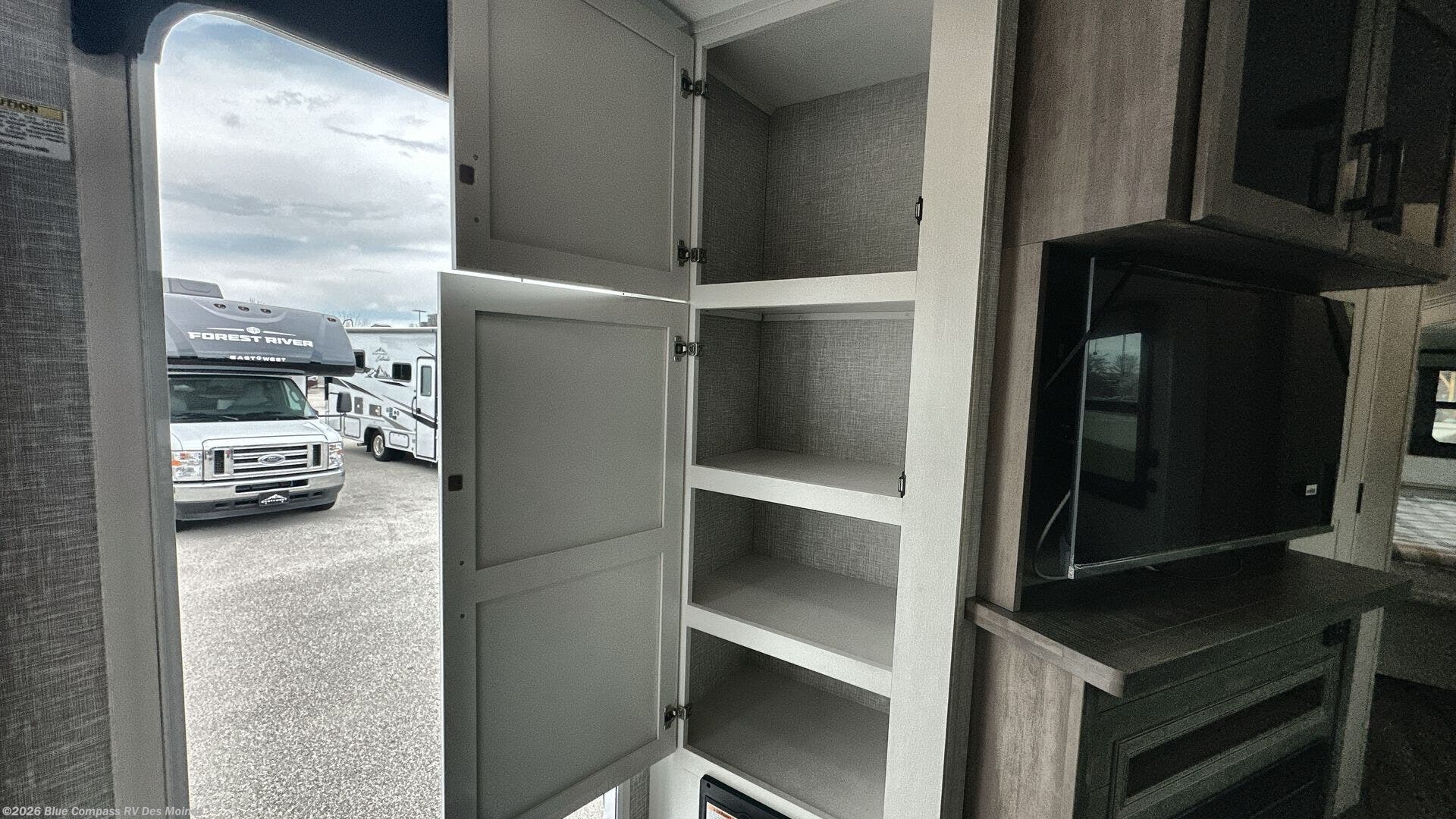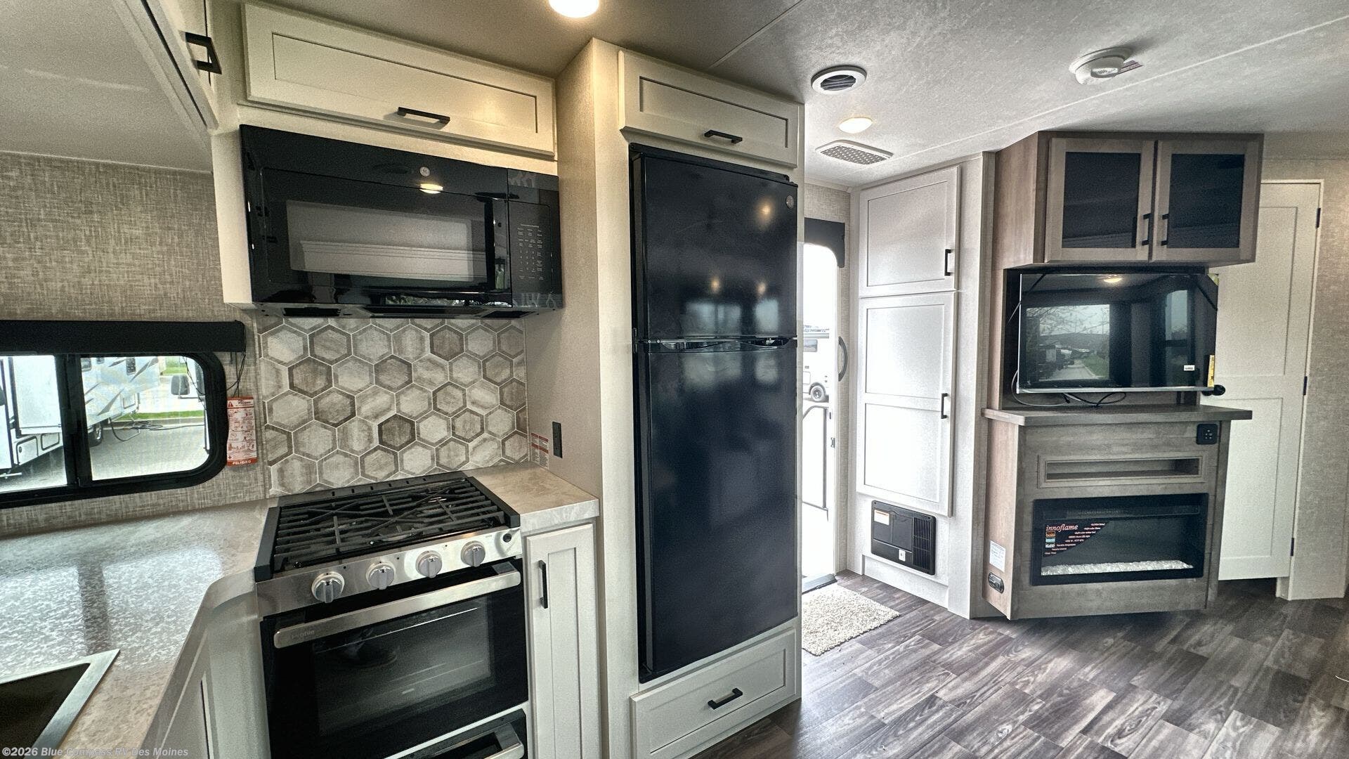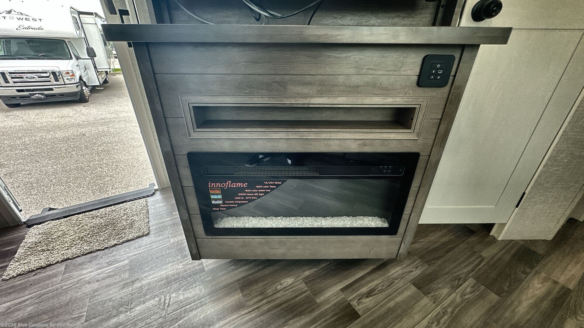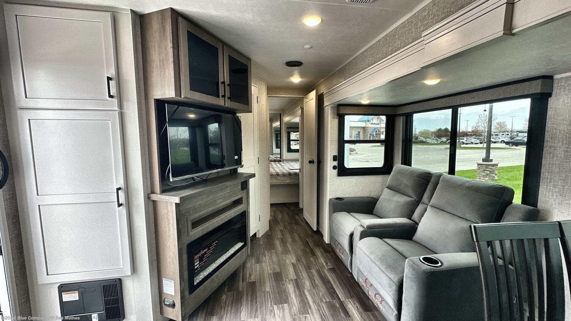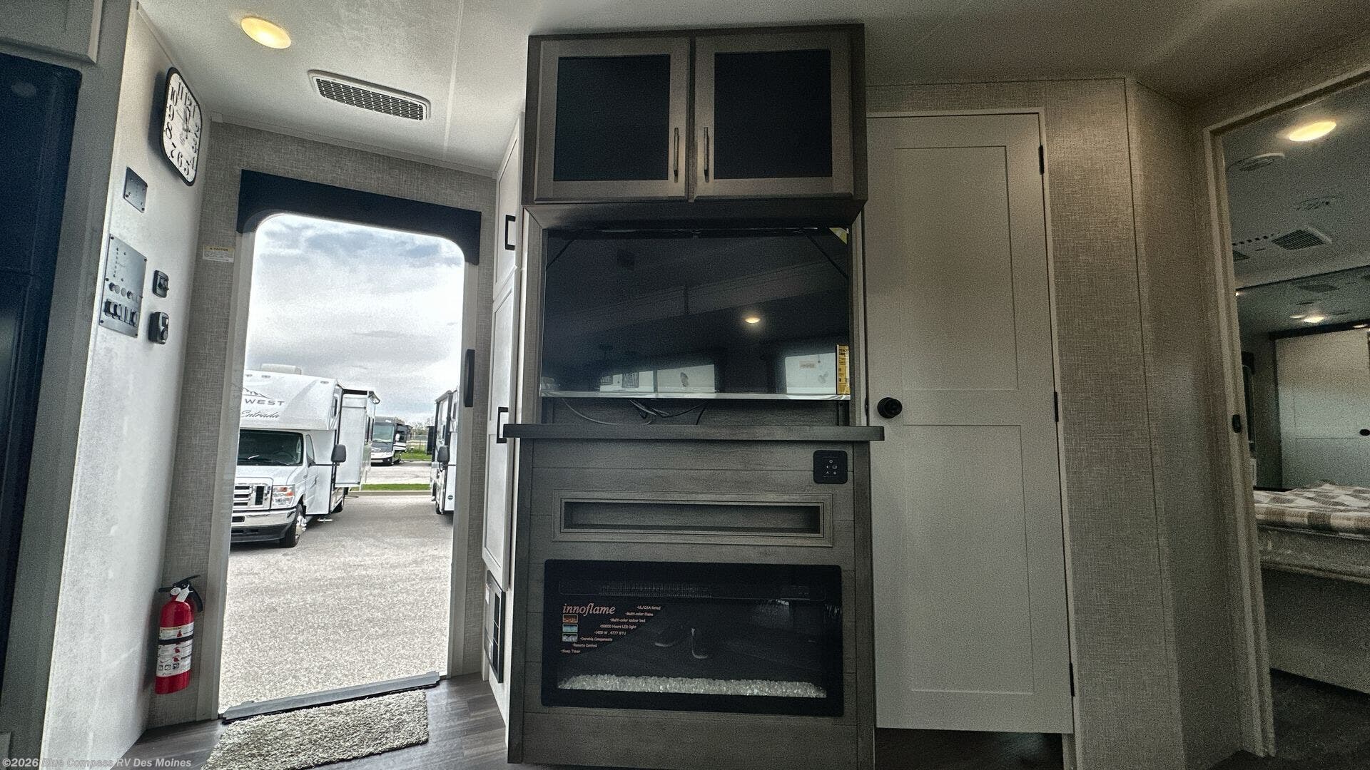 Escape the busyness of life for tranquil trips to the campground with this trailer. You will love the front kitchen with generous counter space, GE appliances, and a pantry by the entryway that can be used for food and more. If you're all hiked out, stay inside to relax on the theater seat across from the fireplace and entertainment center. There is also a free-standing table to dine at or play a game of cards. The dual entry bath will create a rear master suite, complete with a 66" x 80" Olympic queen bed across from a dresser, a private exit door, plus a full-width wardrobe with washer and dryer prep!