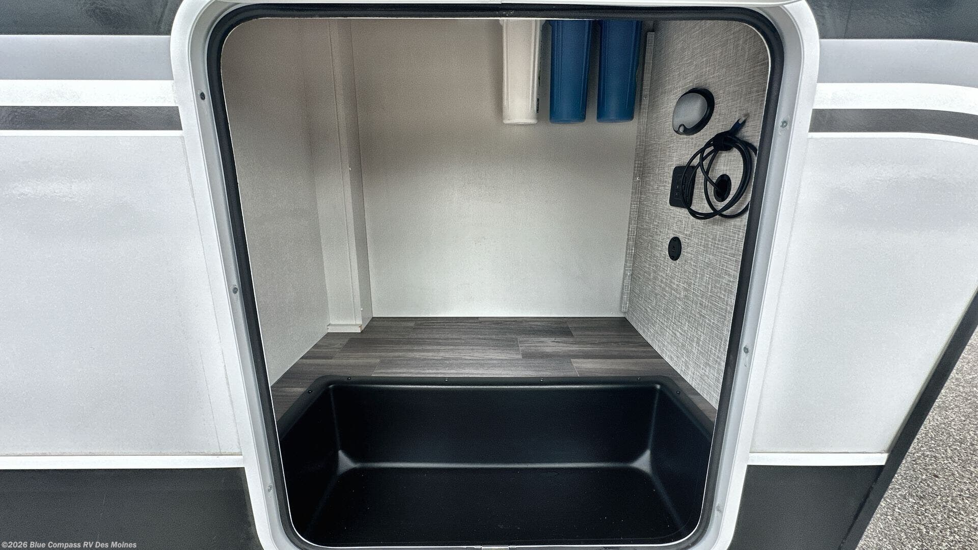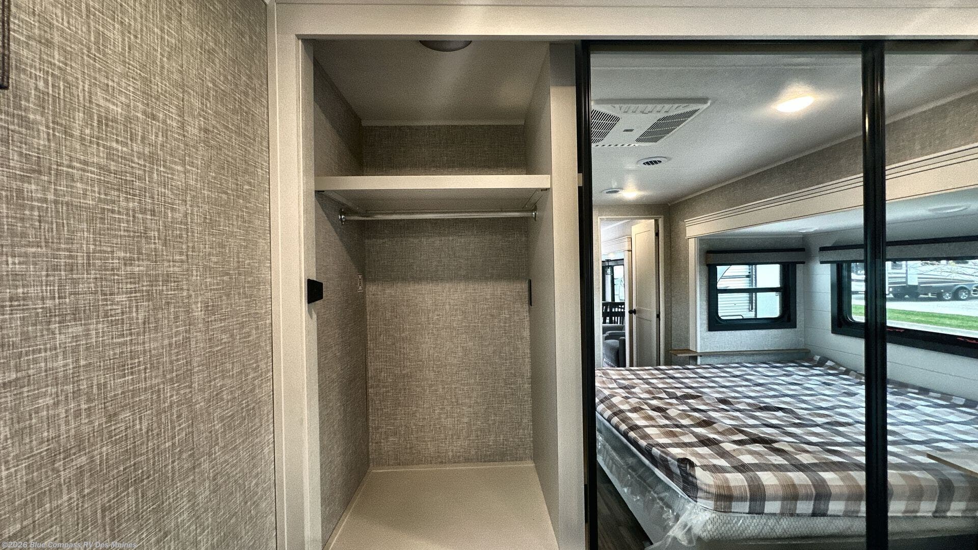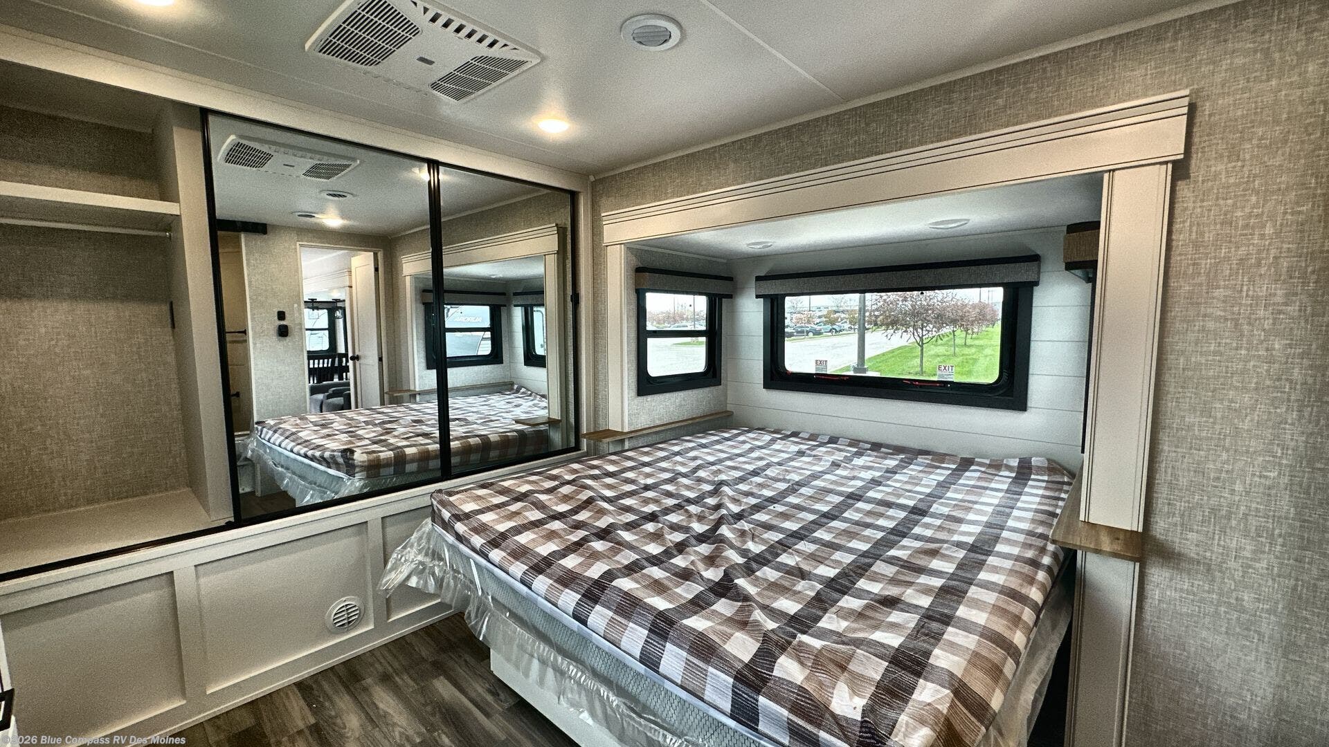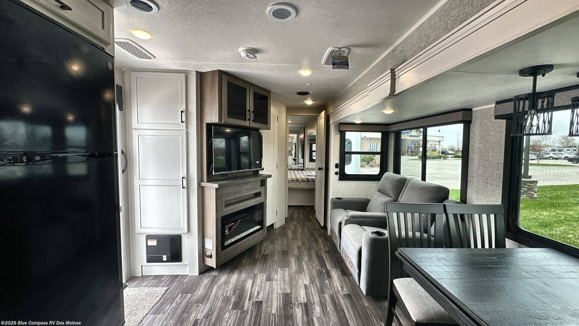 Escape the busyness of life for tranquil trips to the campground with this trailer. You will love the front kitchen with generous counter space, GE appliances, and a pantry by the entryway that can be used for food and more. If you're all hiked out, stay inside to relax on the theater seat across from the fireplace and entertainment center. There is also a free-standing table to dine at or play a game of cards. The dual entry bath will create a rear master suite, complete with a 66" x 80" Olympic queen bed across from a dresser, a private exit door, plus a full-width wardrobe with washer and dryer prep!