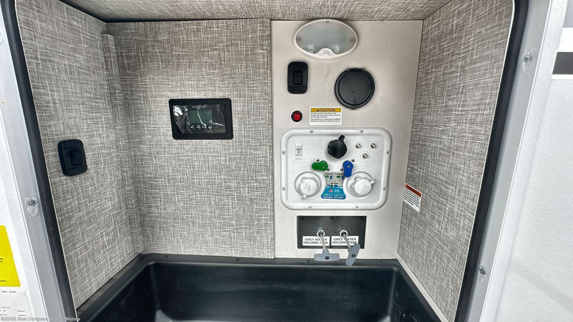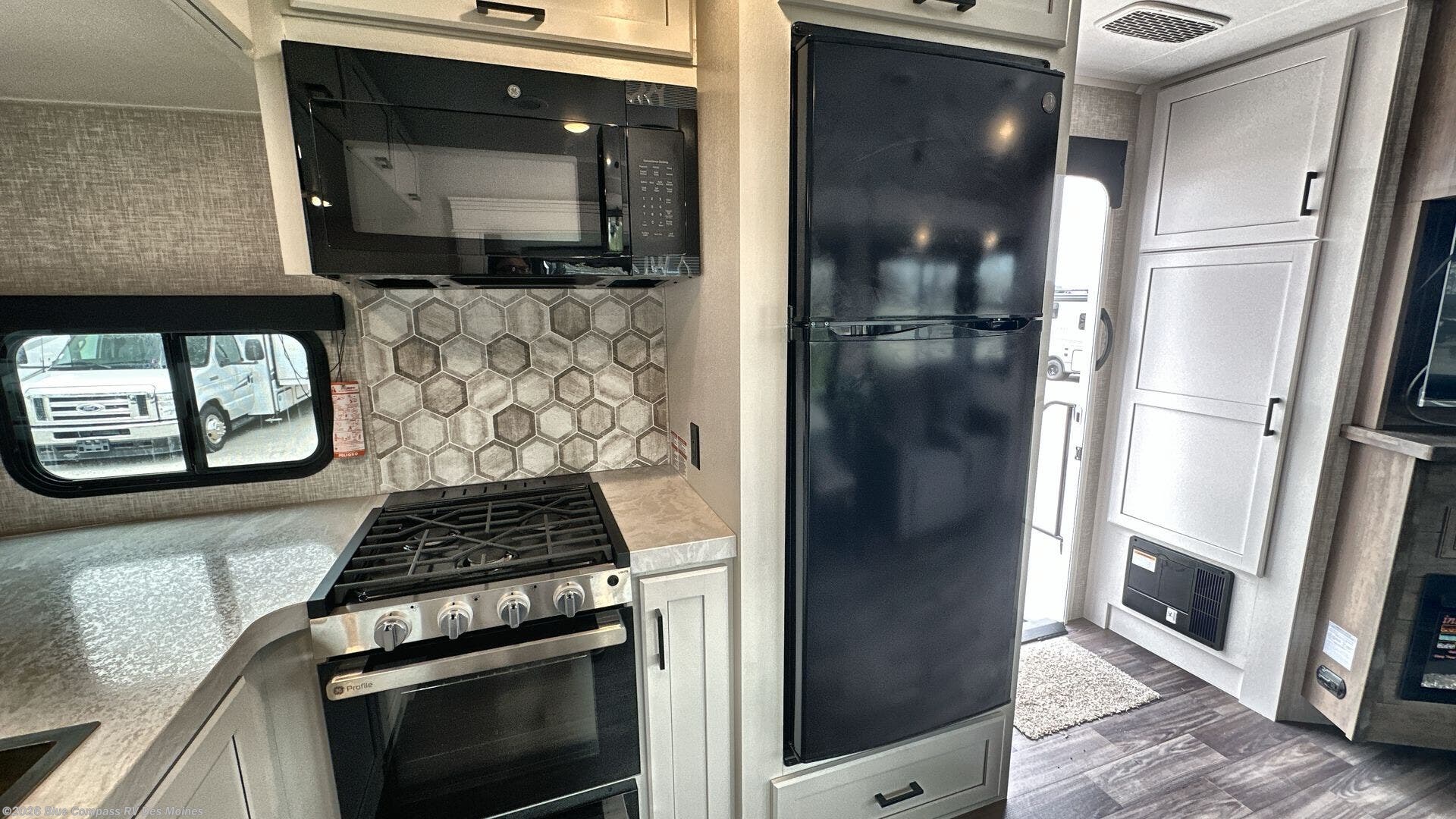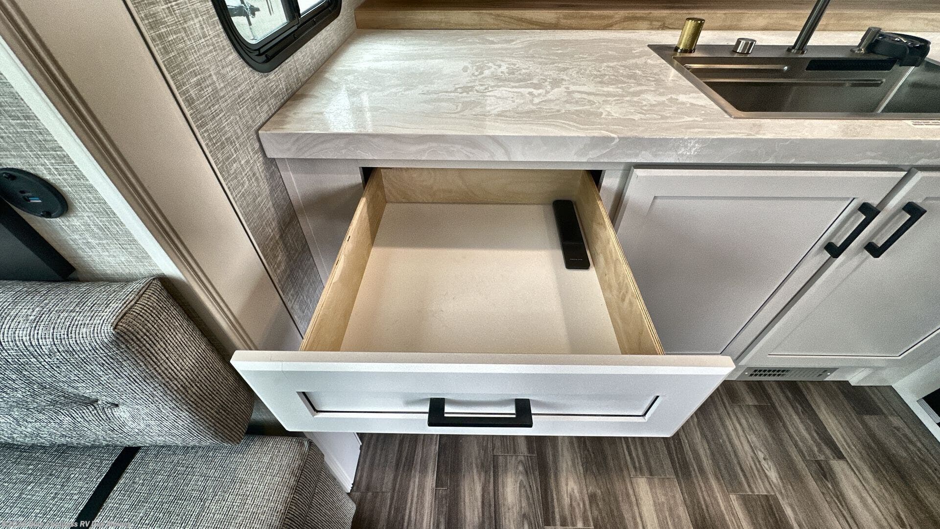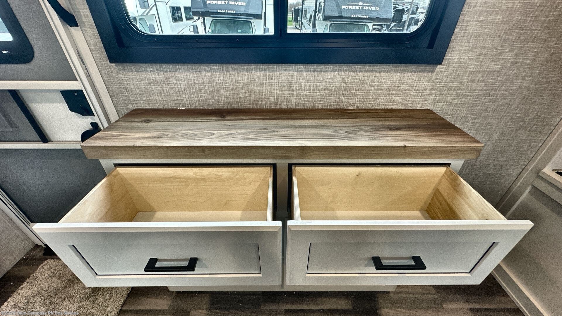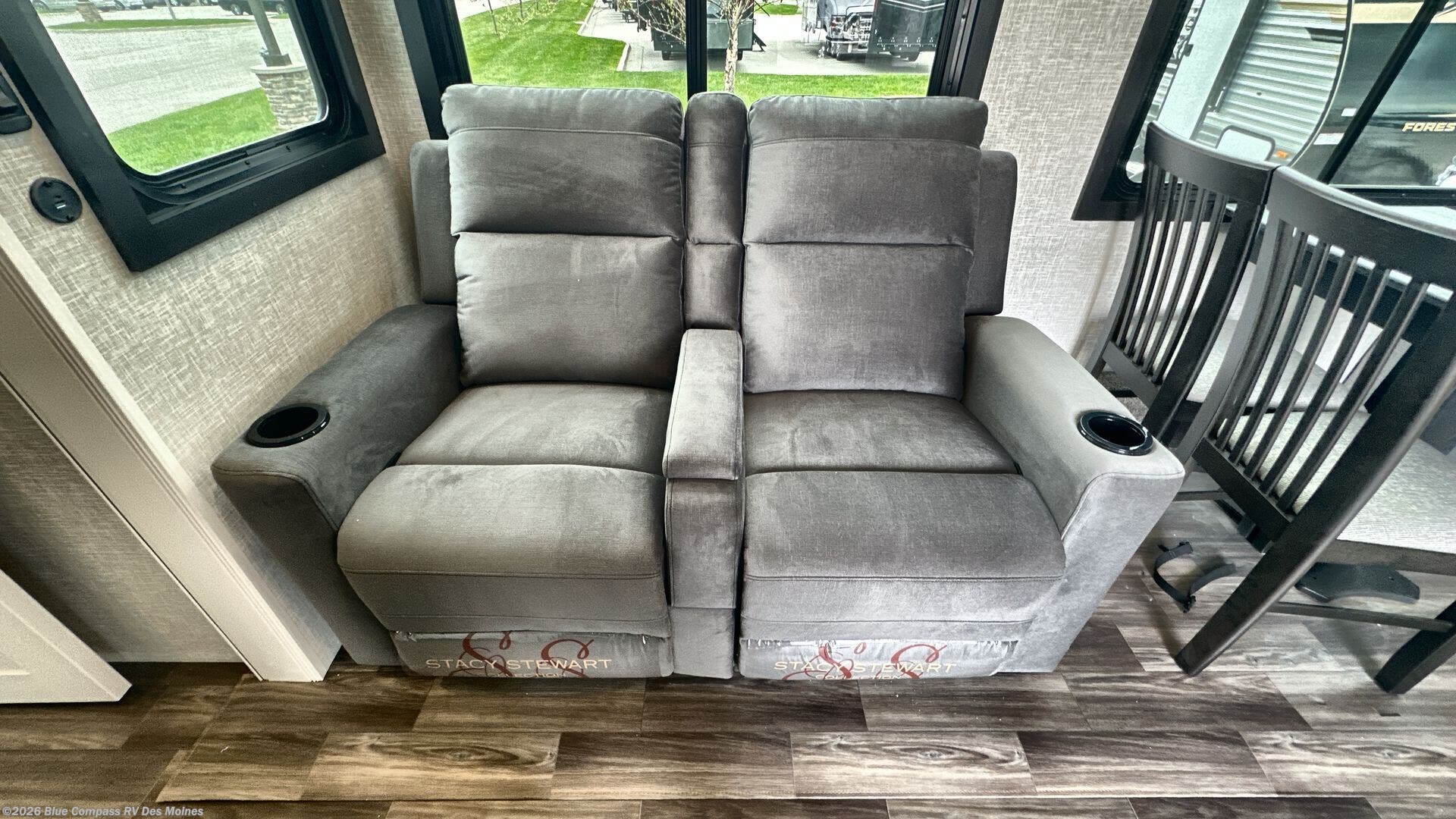 Escape the busyness of life for tranquil trips to the campground with this trailer. You will love the front kitchen with generous counter space, GE appliances, and a pantry by the entryway that can be used for food and more. If you're all hiked out, stay inside to relax on the theater seat across from the fireplace and entertainment center. There is also a free-standing table to dine at or play a game of cards. The dual entry bath will create a rear master suite, complete with a 66" x 80" Olympic queen bed across from a dresser, a private exit door, plus a full-width wardrobe with washer and dryer prep!