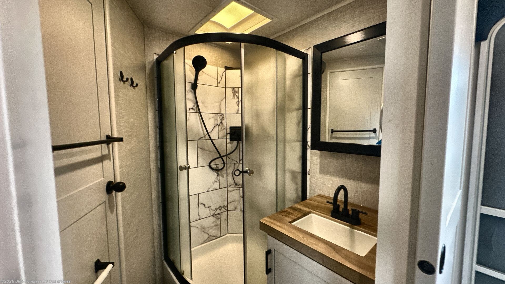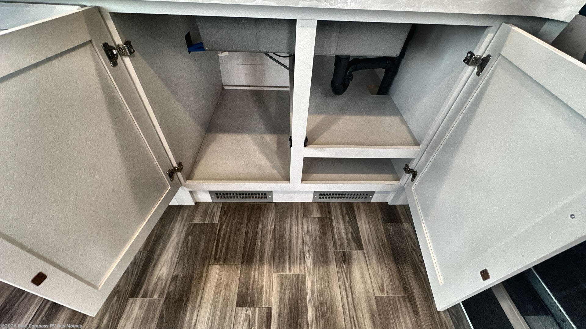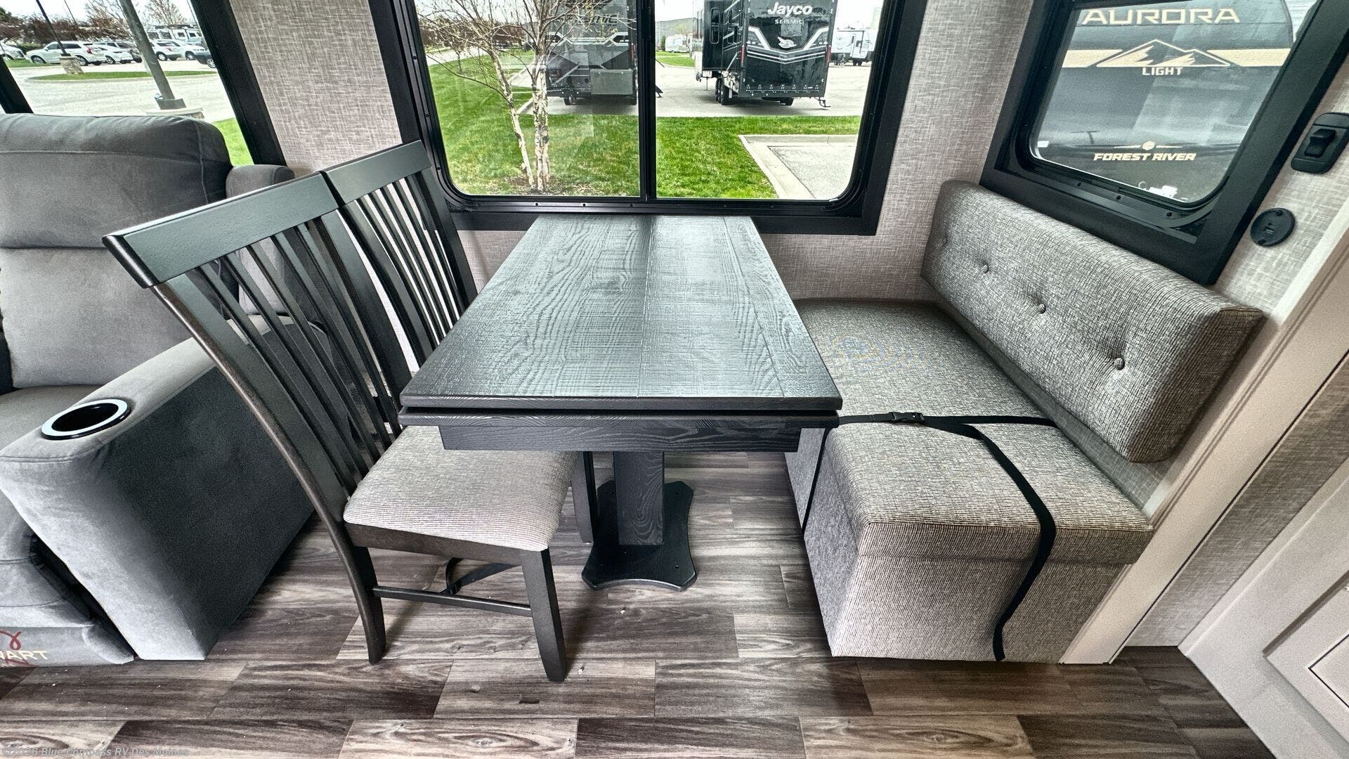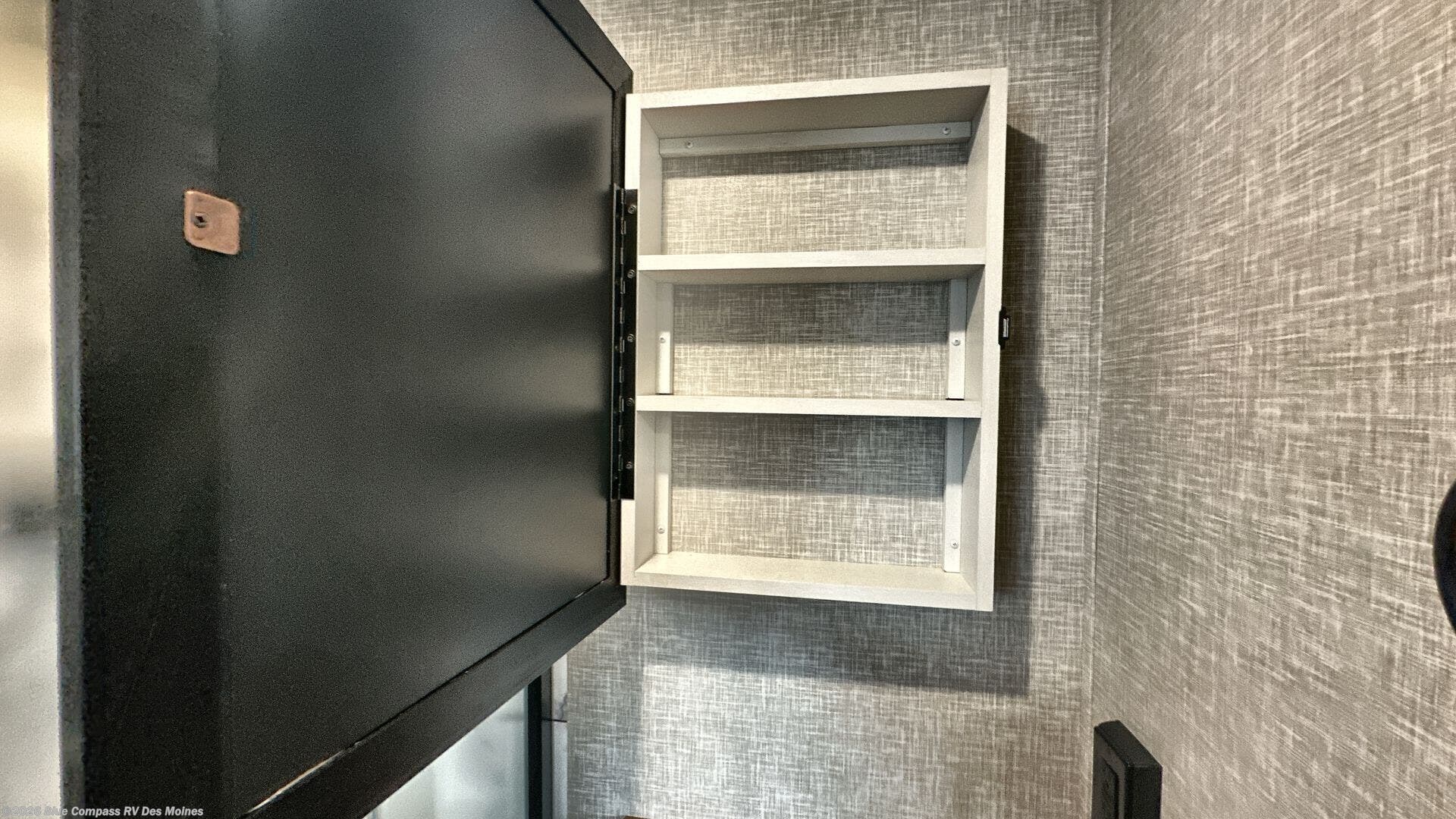 Escape the busyness of life for tranquil trips to the campground with this trailer. You will love the front kitchen with generous counter space, GE appliances, and a pantry by the entryway that can be used for food and more. If you're all hiked out, stay inside to relax on the theater seat across from the fireplace and entertainment center. There is also a free-standing table to dine at or play a game of cards. The dual entry bath will create a rear master suite, complete with a 66" x 80" Olympic queen bed across from a dresser, a private exit door, plus a full-width wardrobe with washer and dryer prep!