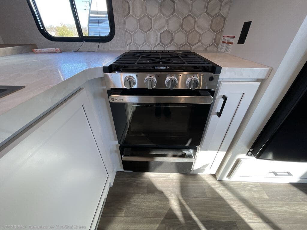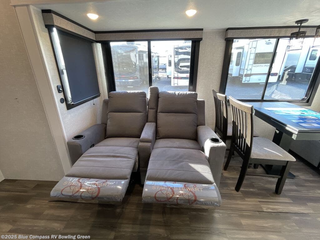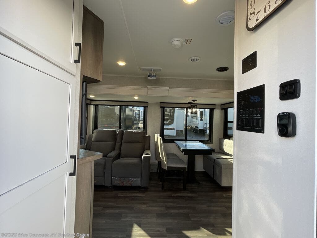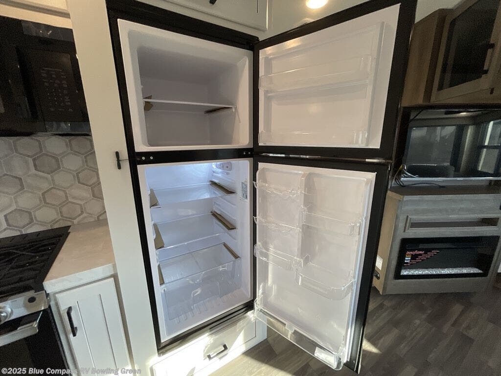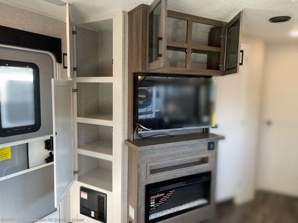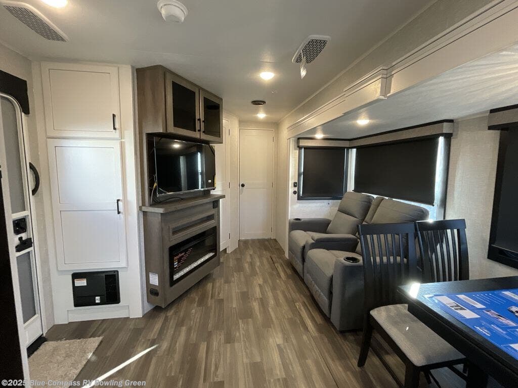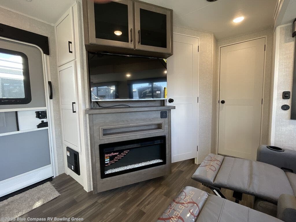 Escape the busyness of life for tranquil trips to the campground with this trailer. You will love the front kitchen with generous counter space, GE appliances, and a pantry by the entryway that can be used for food and more. If you're all hiked out, stay inside to relax on the theater seat across from the fireplace and entertainment center. There is also a free-standing table to dine at or play a game of cards. The dual entry bath will create a rear master suite, complete with a 66" x 80" Olympic queen bed across from a dresser, a private exit door, plus a full-width wardrobe with washer and dryer prep!