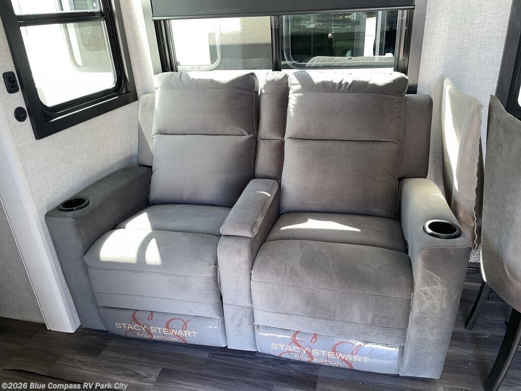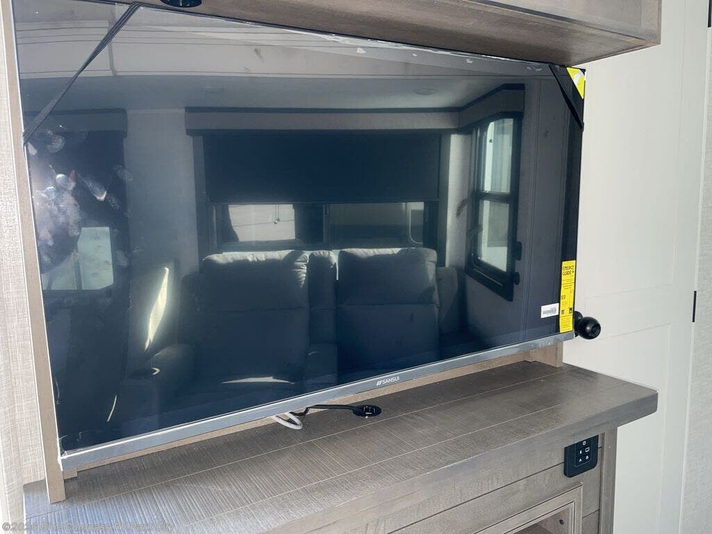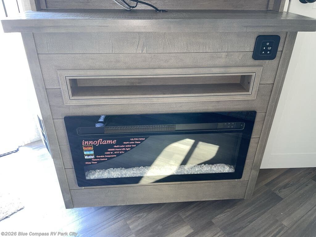 Escape the busyness of life for tranquil trips to the campground with this trailer. You will love the front kitchen with generous counter space, GE appliances, and a pantry by the entryway that can be used for food and more. If you're all hiked out, stay inside to relax on the theater seat across from the fireplace and entertainment center. There is also a free-standing table to dine at or play a game of cards. The dual entry bath will create a rear master suite, complete with a 66" x 80" Olympic queen bed across from a dresser, a private exit door, plus a full-width wardrobe with washer and dryer prep!